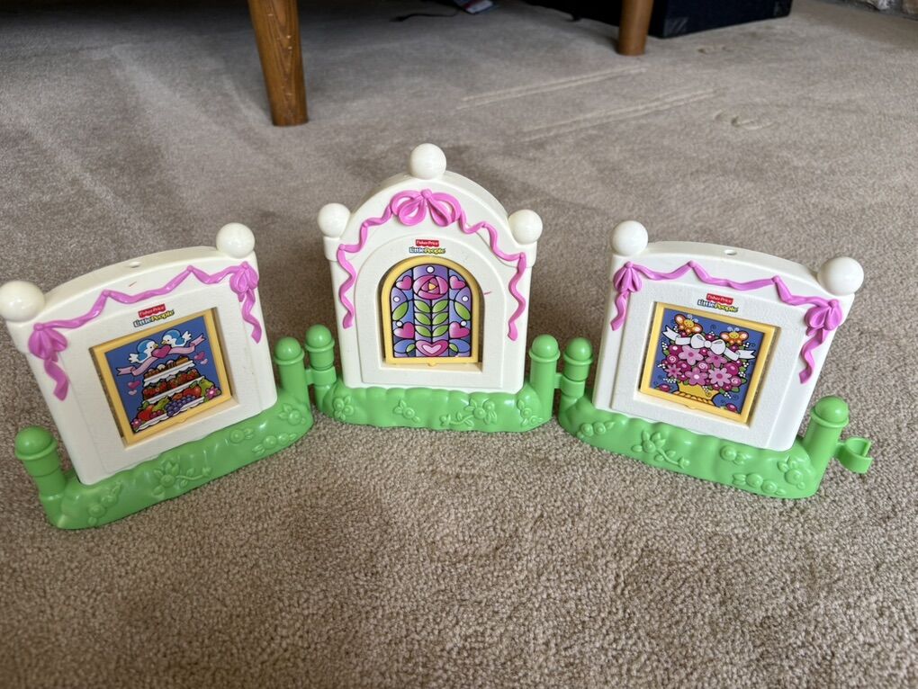 RARE Fisher-Price Little People Wedding Set. Includes three connecting backdrops, two fancy chairs, two gifts, and bride & groom figures. Very good condition. Text only. Cash or Venmo. Discount on multiple items.