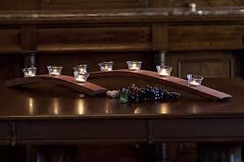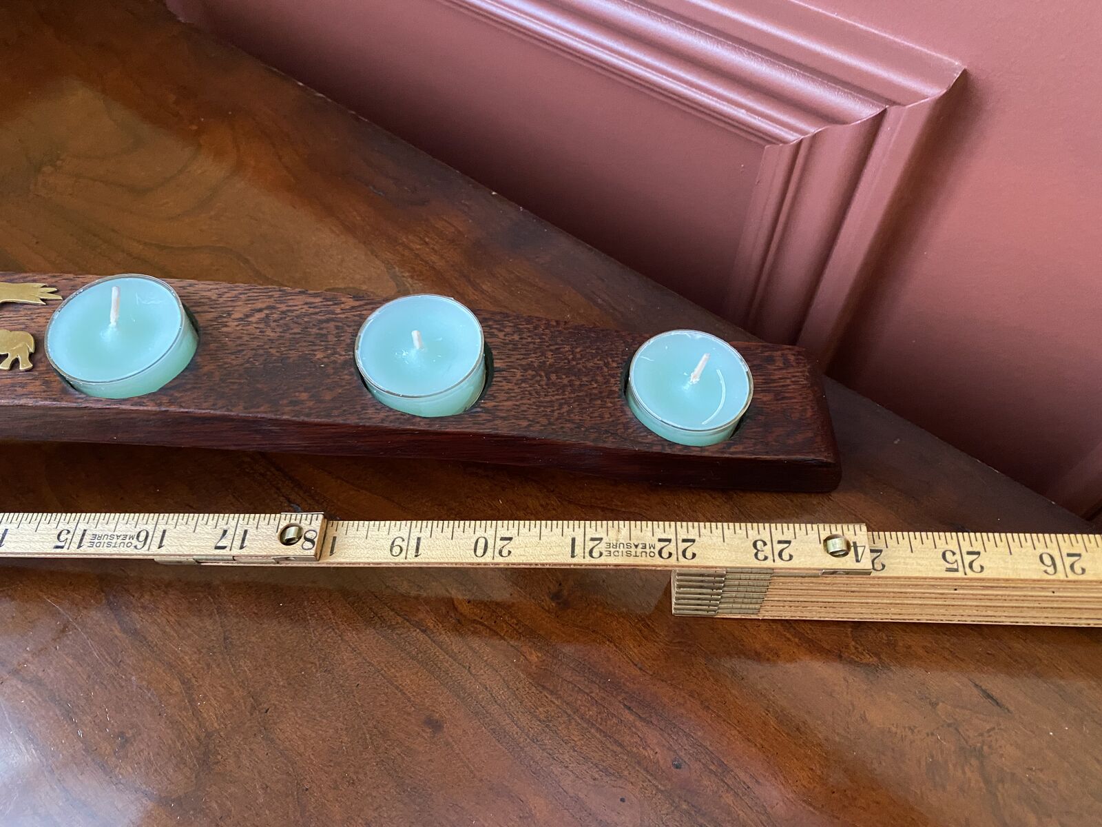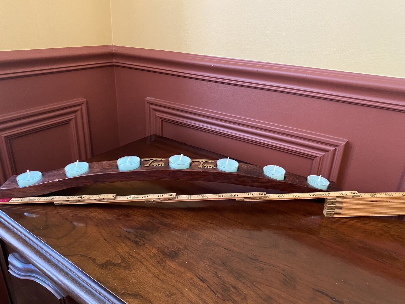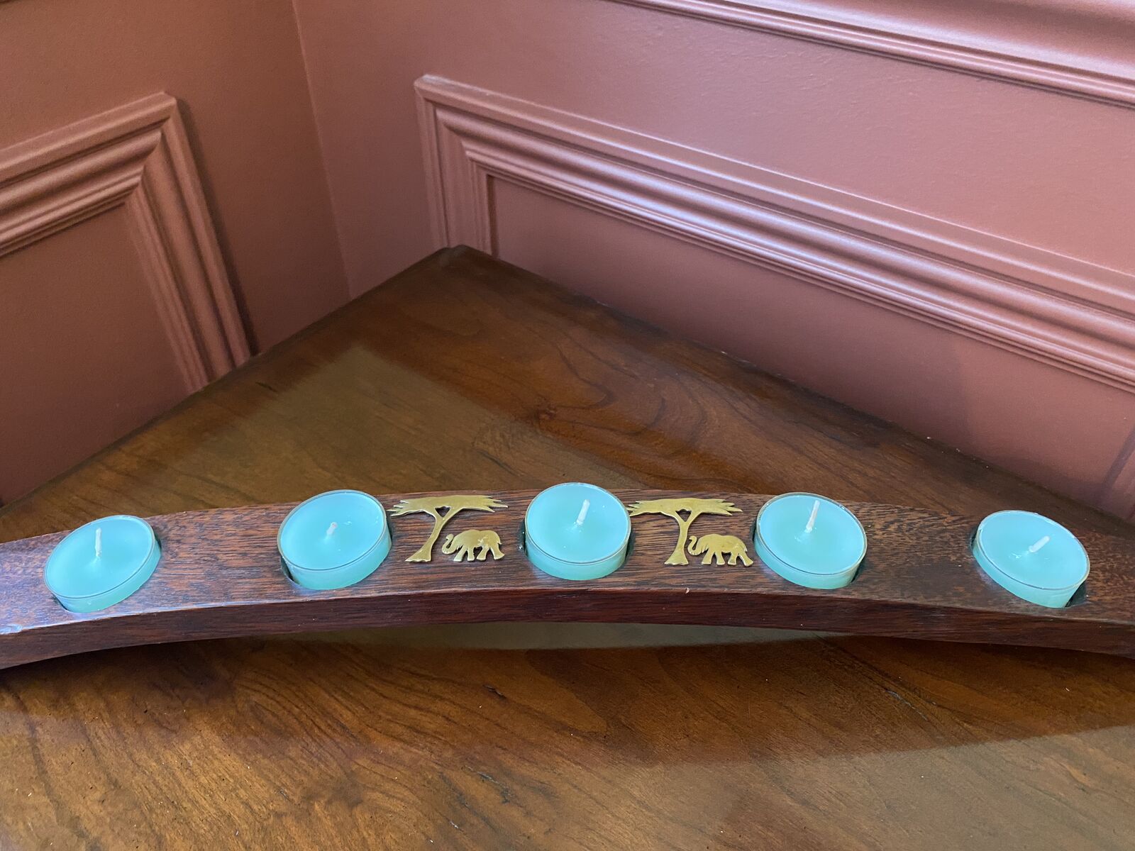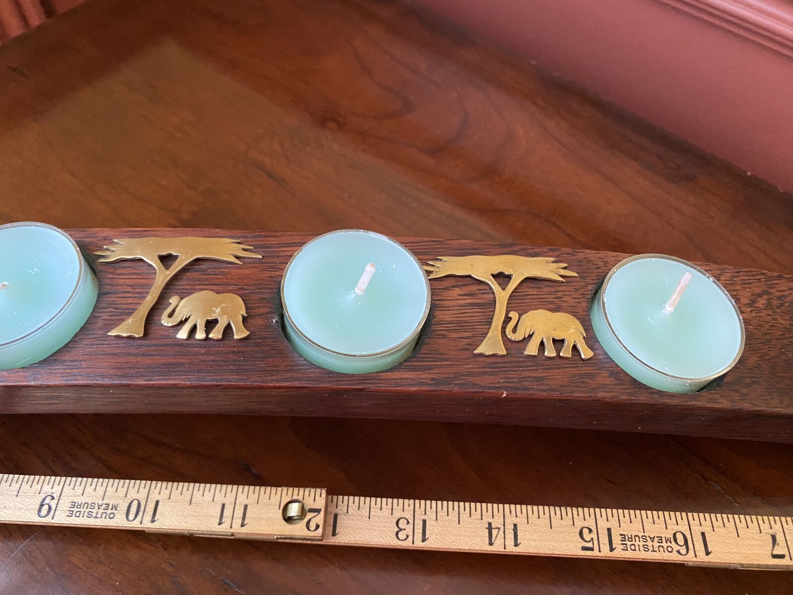 Gorgeous Lightweight Wood Arch w/ Brass Inlay Trees and Elephants Candle Holder - Oak Barrel- C PIX. I was unable to find anything just like mine, and none with the brass inlay. They seem to start at $60. I'm sure this one is more with the brass detail. There are a couple of small nicks on the one side the could be repaired with the knowledge to do so. Maybe even some dark wax would do the trick. I believe that this one is antique. It would also be beautiful with petite votive cups as shown in the last photo.