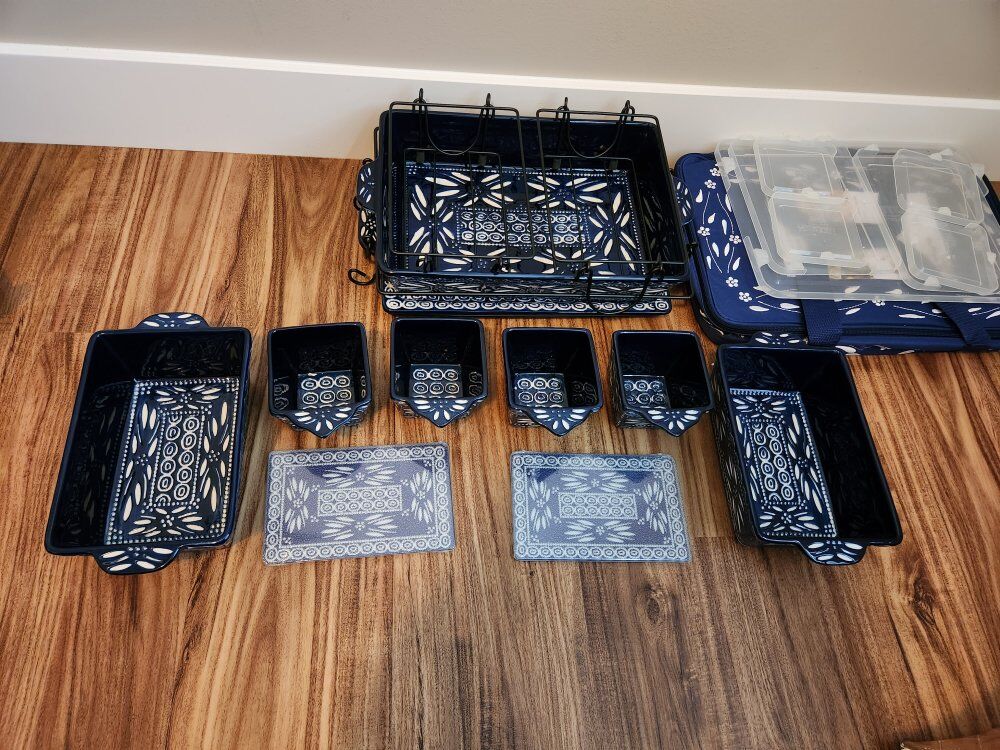 Includes 4-qt baker, lid-it, 2.5-qt baker, two 0.75-qt bakers, and four 10-oz ramekin Old World pattern Ceramic construction Dishwasher-, microwave-, refrigerator-, and freezer-safe; oven-safe to 500F Measurements: 4-qt Baker 13.7" x 9.64" x 4.25"; Lid-it 13.18" x 9" x 1.77"; 2.5-qt Baker 12.25" x 7.87" x 4"; 0.75-qt Bakers 7.1" x 5.1"x 3.75"; 10-oz Ramekins 4.33" x 4" x 3.54"