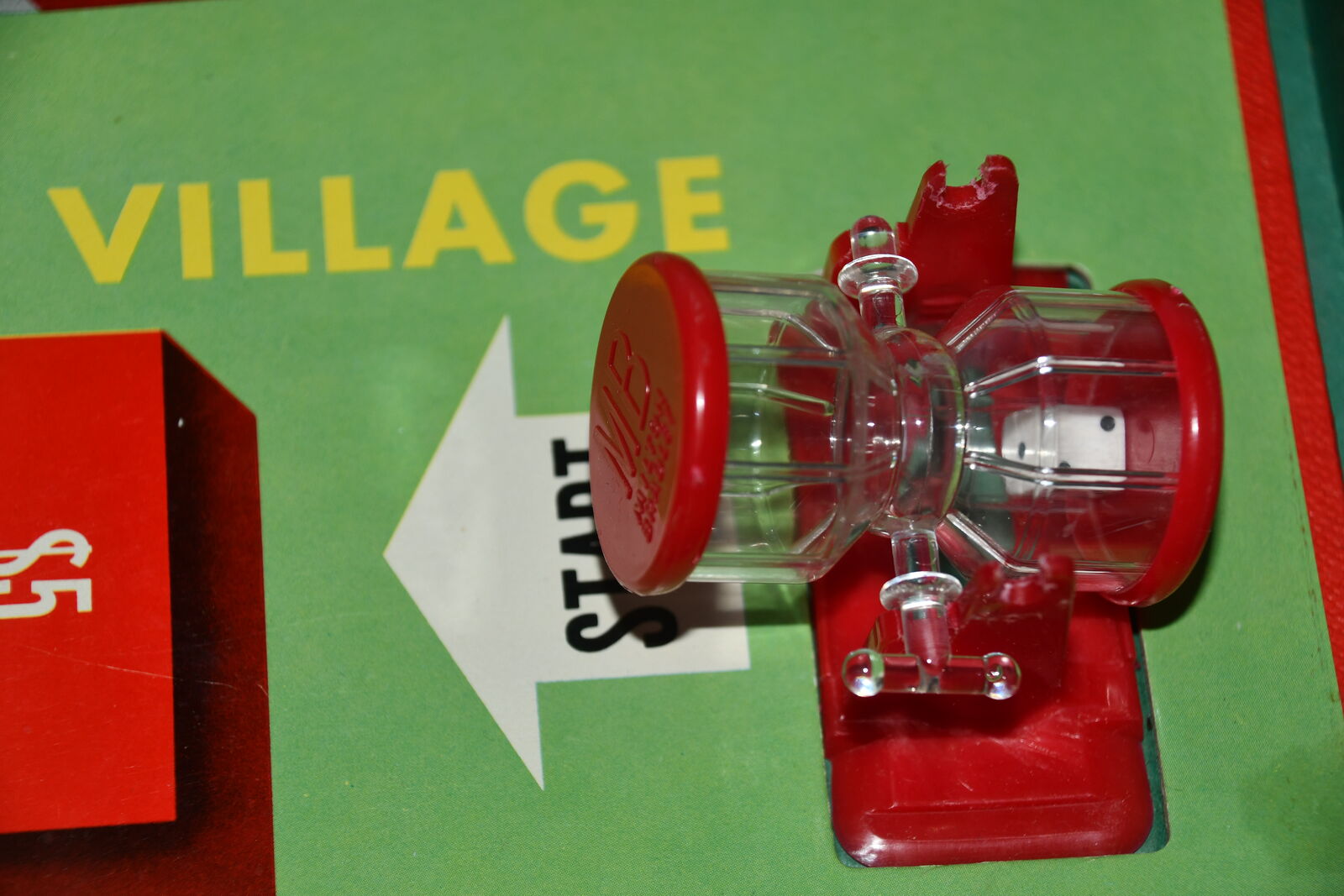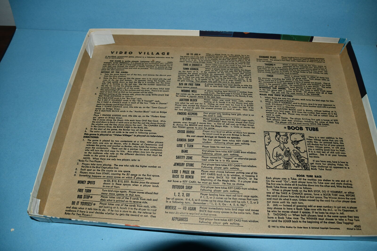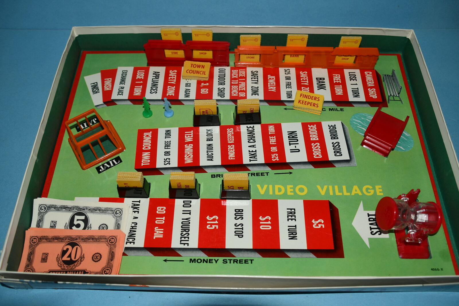This VINTAGE 1962 "VIDEO VILLAGE" BOARD GAME is from a smoke free home. I believe it is complete except for the money. It has players, cards, bridge, jail, dice.... It doesn't give a listing of the pieces. Questions??? Please ask. We are located in Plain City. Cash only please.