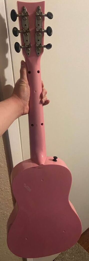 First Act Guitar Half Size for Kid Or Small Person. Guitar has strap hooks. The marks on back are crayon and tape that could be removed. Uses real steel guitar strings. The guitar body is plastic. Was a gag gift. Plays good just too small and pink is so not my color