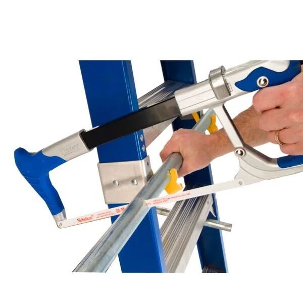 Customized HolsterTop® with Lock-In System secures tools from falling. 3 ToolLasso® are included Full set of rear horizontals spaced one per foot Slip-resistant Traction-Tred® steps are double riveted and knee-braced Heavy-duty internal spreaders EDGE® bracing system helps to decrease damage to rail Shoe pads riveted to the EDGE® structure Convenient conduit cutting system HolsterTop® customized for electricians Built-in wire spool holders for both large and small spools *Energy Diffusing Geometry Every rivet backed up by metal plate or washer to protect rails ® The blue and yellow ladder is an exclusive registered trademark of Werner Co SPECIFICATIONS DETAILS Style Single-Sided Size 6ft Type Type IAA Duty Rating Load Capacity (lb)  375