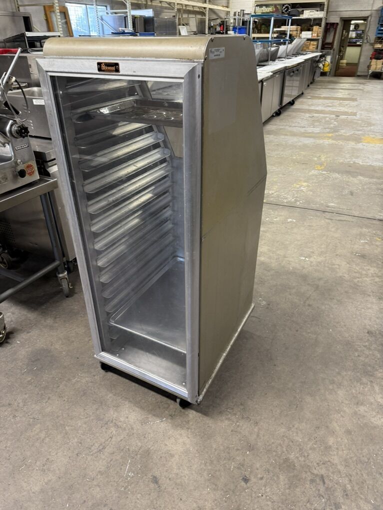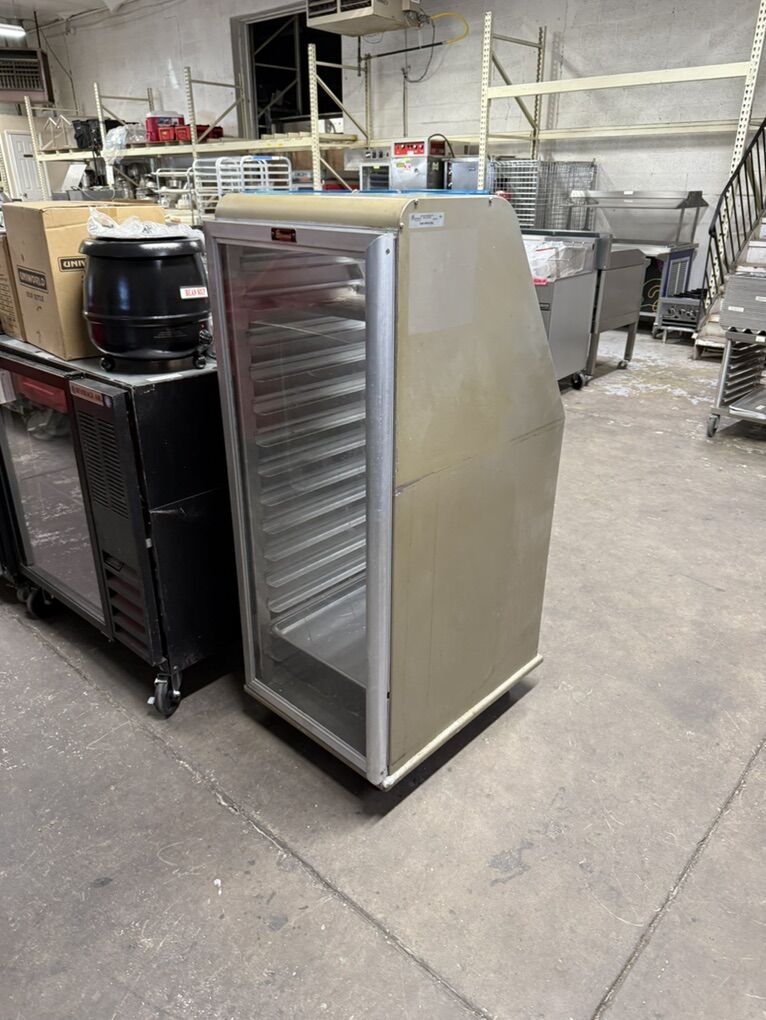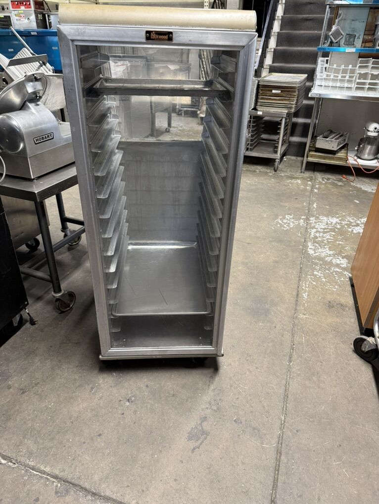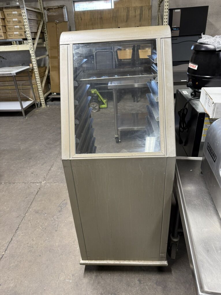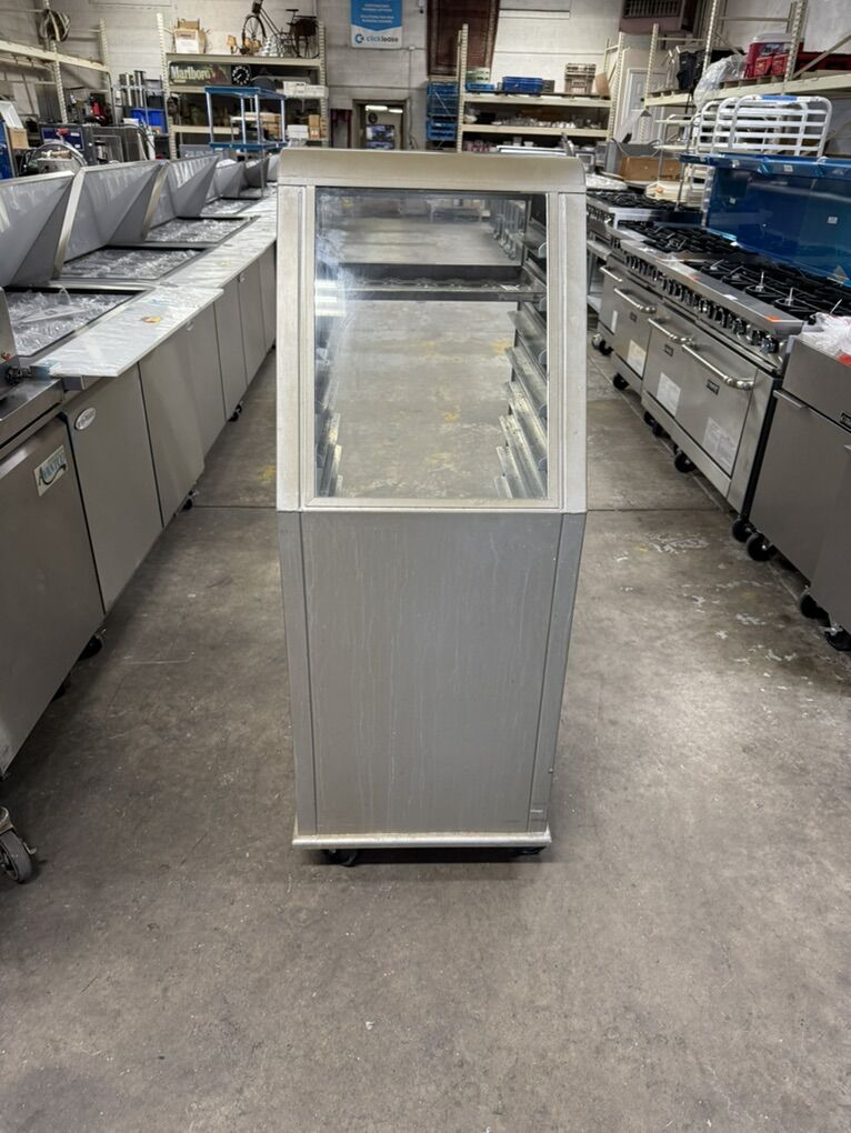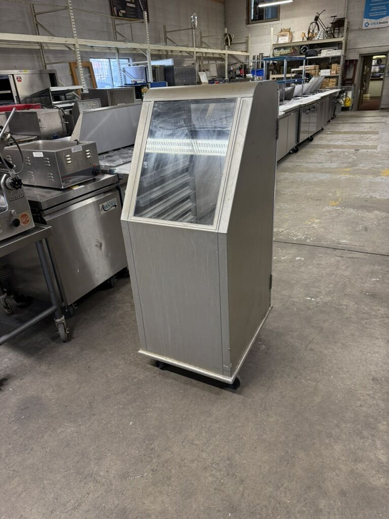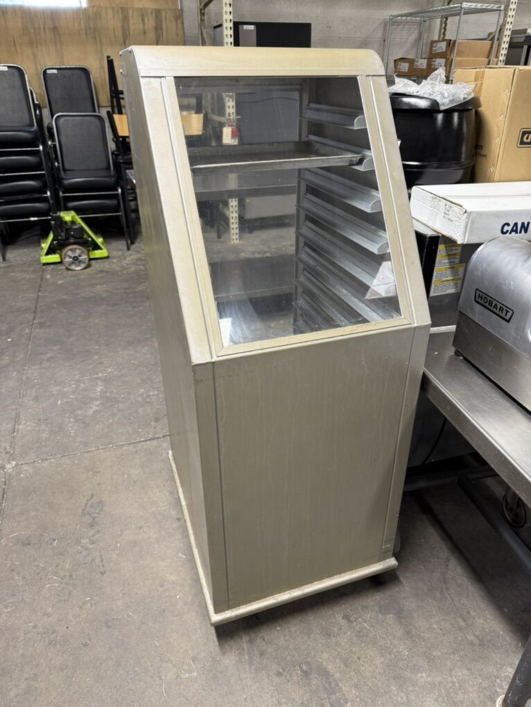 Used display Bakery rack for full and half size bakery sheet pans ,with wheels in great condition 22”X29”X57”H