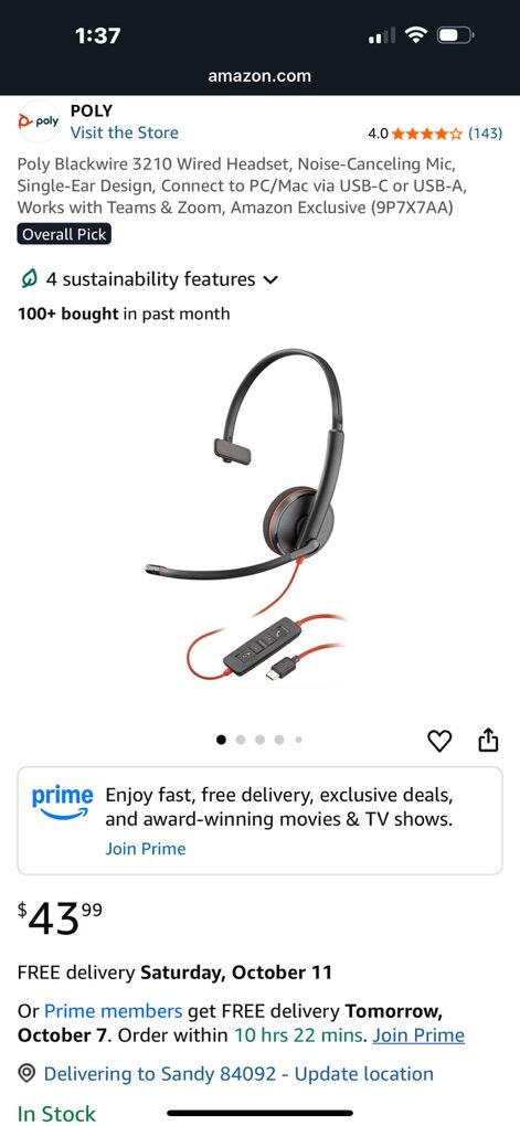 Like new poly black wire 3210 wired headset with noise cancelling! Comes as shown in the box with 3 different adapters and paperwork! I actually think it’s new, but I cannot verify, therefore it’s sold as like new! This exact headset is currently on Amazon for 43.99. Don’t pay retail prices, but it and use it today! Call Dustin at 801-205-3404, I need it gone!