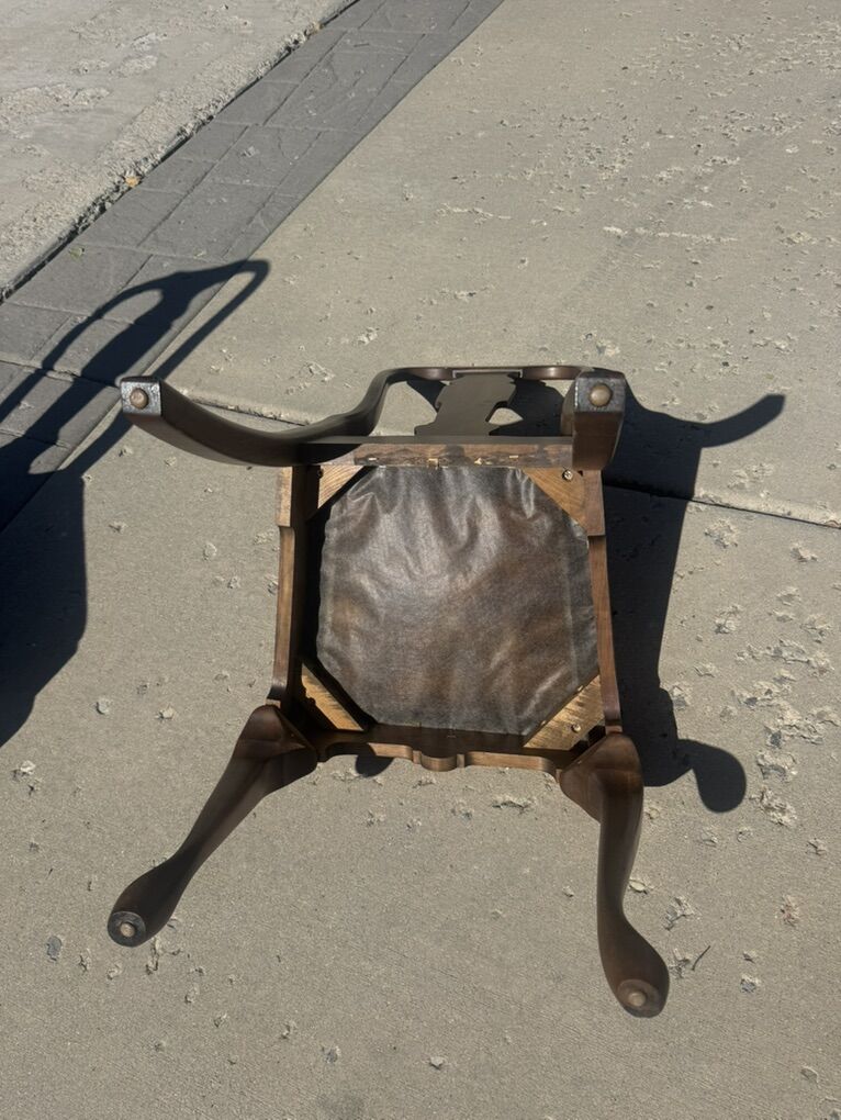 6 wooden chairs with cloth cushion seats. 2 of the chairs have arms for the end of the table and the other 4 do not for the middle of the table seats.