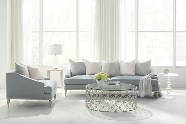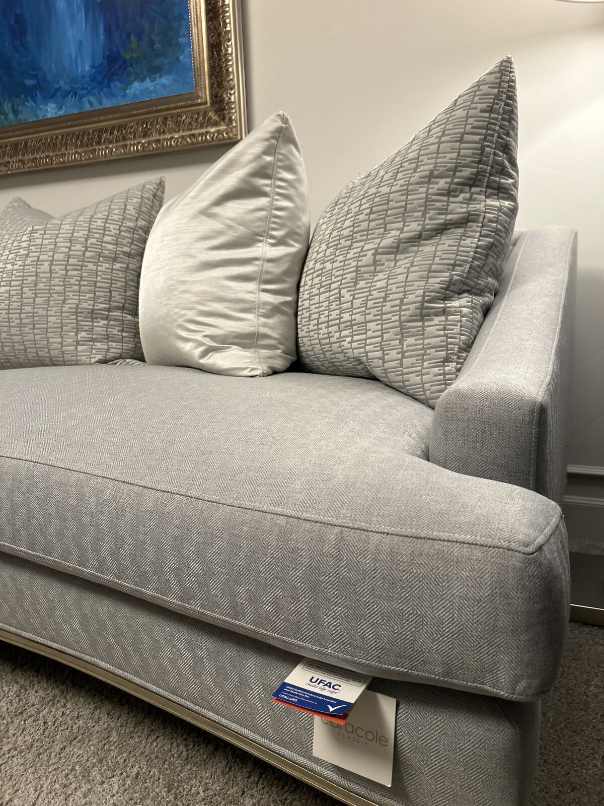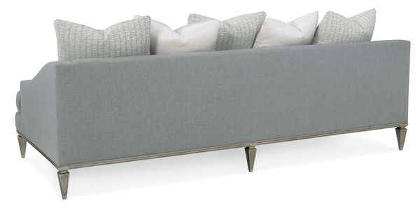 Stylishly expressive A low back and sloping arms cradle the 5 loose back pillow. 8-way hand-tied, features two seat cushions and is upholstered in a soothing granite grey accented with pillows in a platinum and cream matelassé and a cream dupioni satin. its base and legs are finished in Taupe Silver Paint. 93W 42D 29.5H, seat 21in H Original price $5595