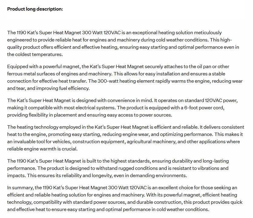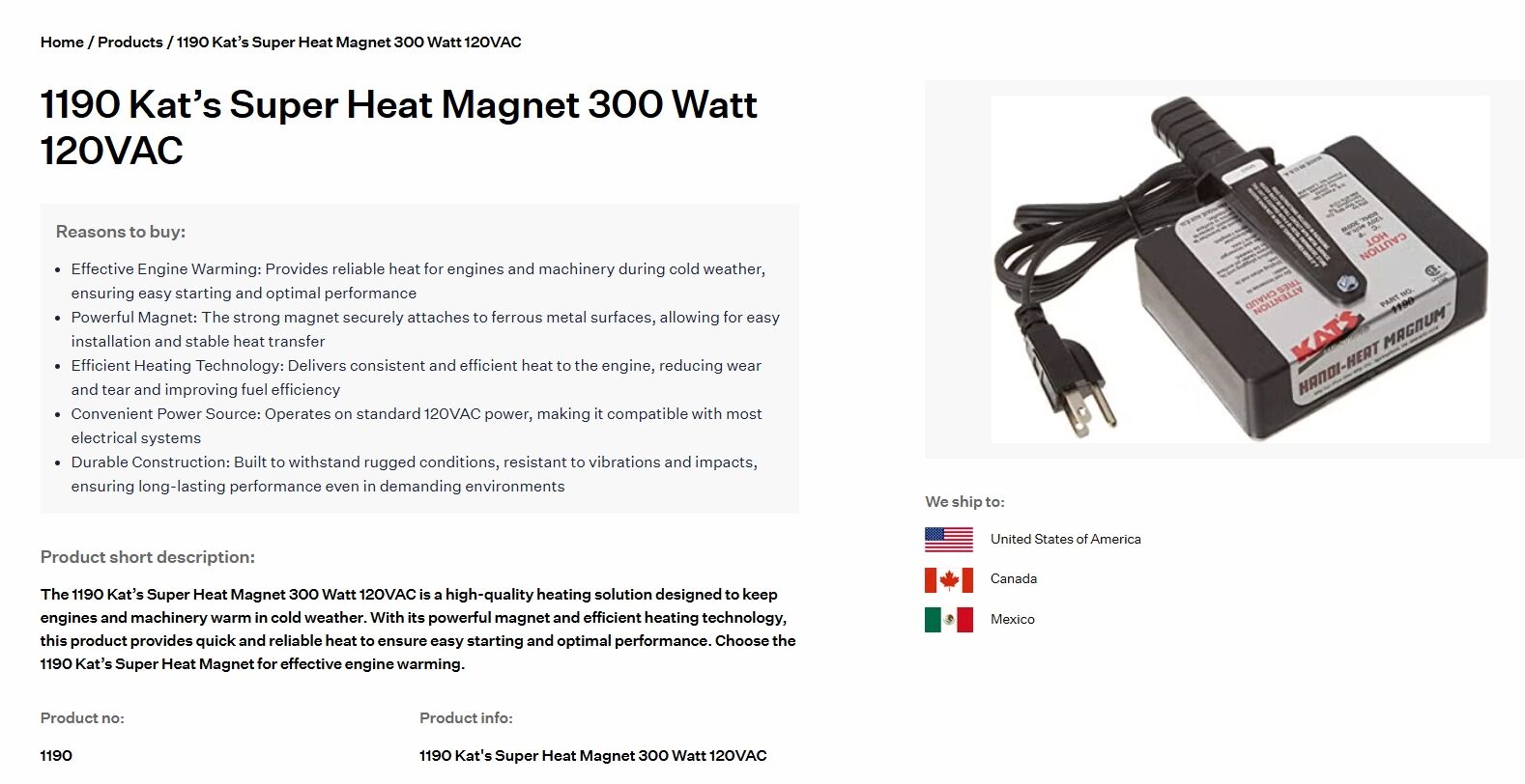 ZelleThis 1190 Kat’s Engine Super Heat Magnet 300 Watt 120VAC is a high-quality heating solution designed to keep engines and machinery warm in cold weather. With its powerful magnet and efficient heating technology, this product provides quick and reliable heat to ensure easy starting and optimal performance. Choose the 1190 Kat’s Super Heat Magnet for effective engine warming. Item is brand new, bought for my tractor that was sold before I needed the heater. So now it needs a new home. Retail is around $120. Could ship for $10. Or pick up here in Heyburn.