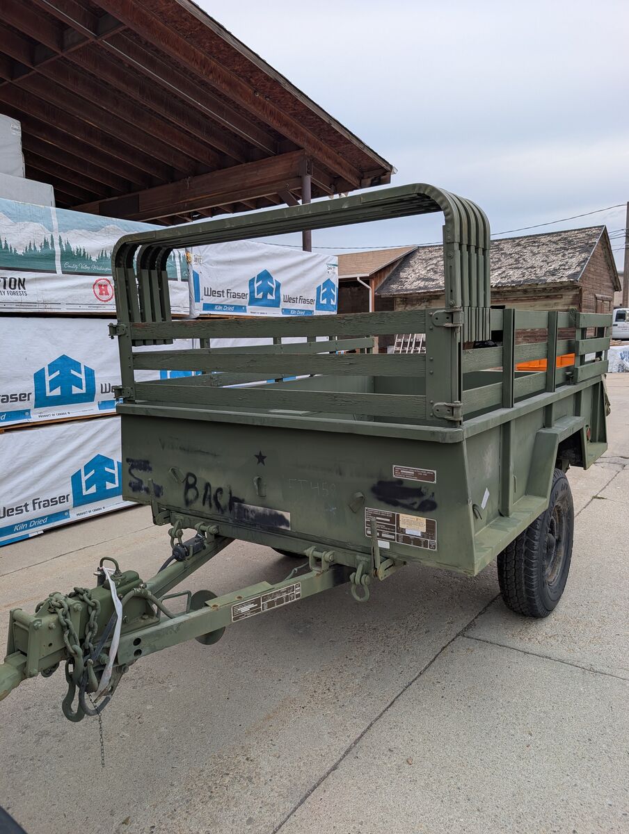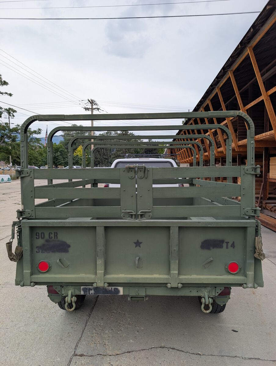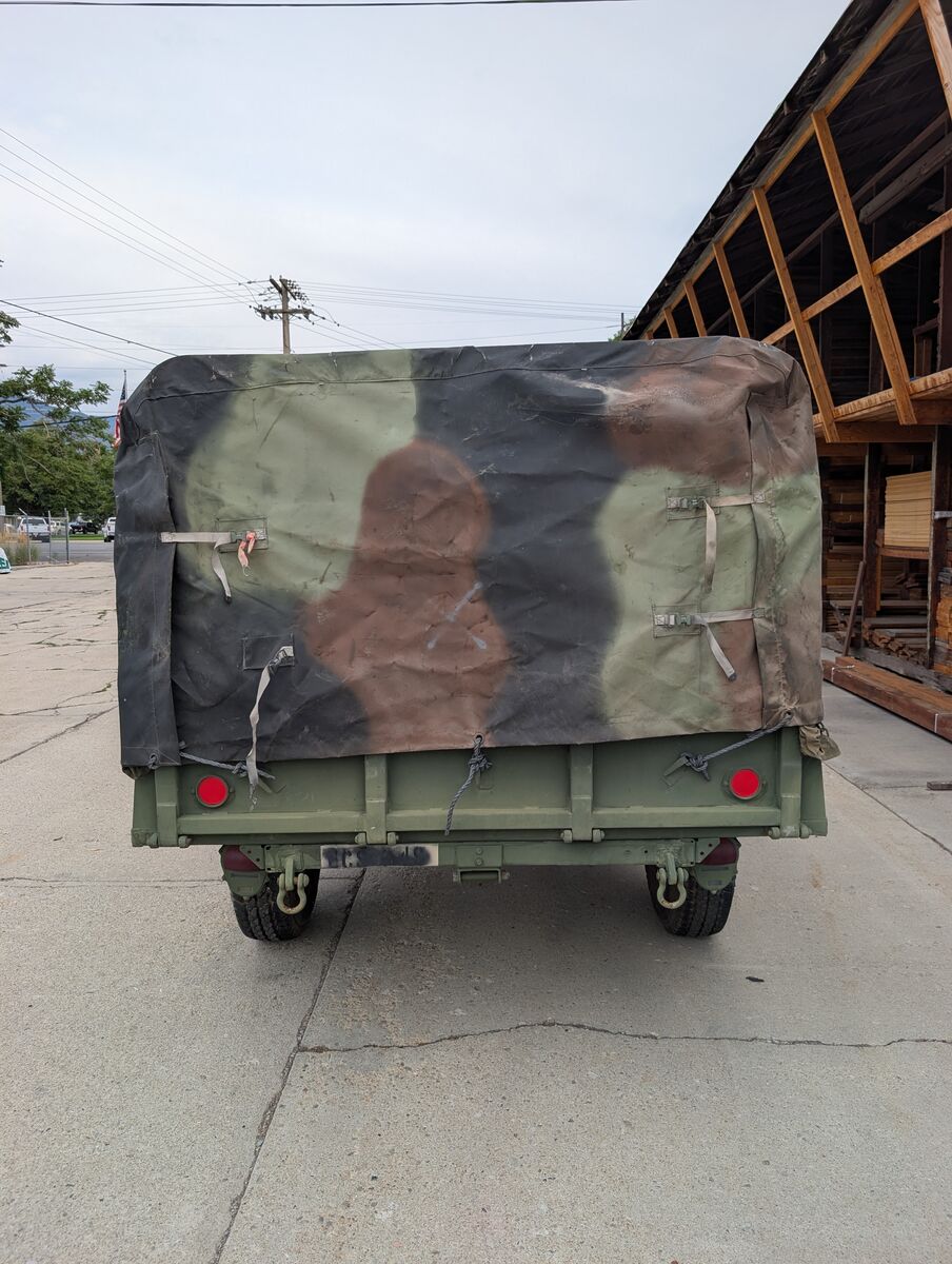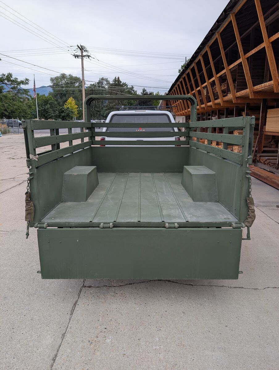 M101A2 Military cargo trailer. Like New not a scratch in the bed. This would be a great canidate for anyone looking to have a super clean vintage restoration. These things are 3/4 ton trailers (8 lug axle, 16" or larger wheel and tire combinations). This trailer has the bows and cover for the trailer and all the wood stake sides. It comes with independant parking brakes (one for each side). These are extremely popular to convert into overland trailers because of their offroad and camping capability. They work great as yard trailers for spring and fall clean up and hauling material to the dump. Thanks for looking and message with any questions. See my other listings for military trailers/gensets. Here are a couple key features: