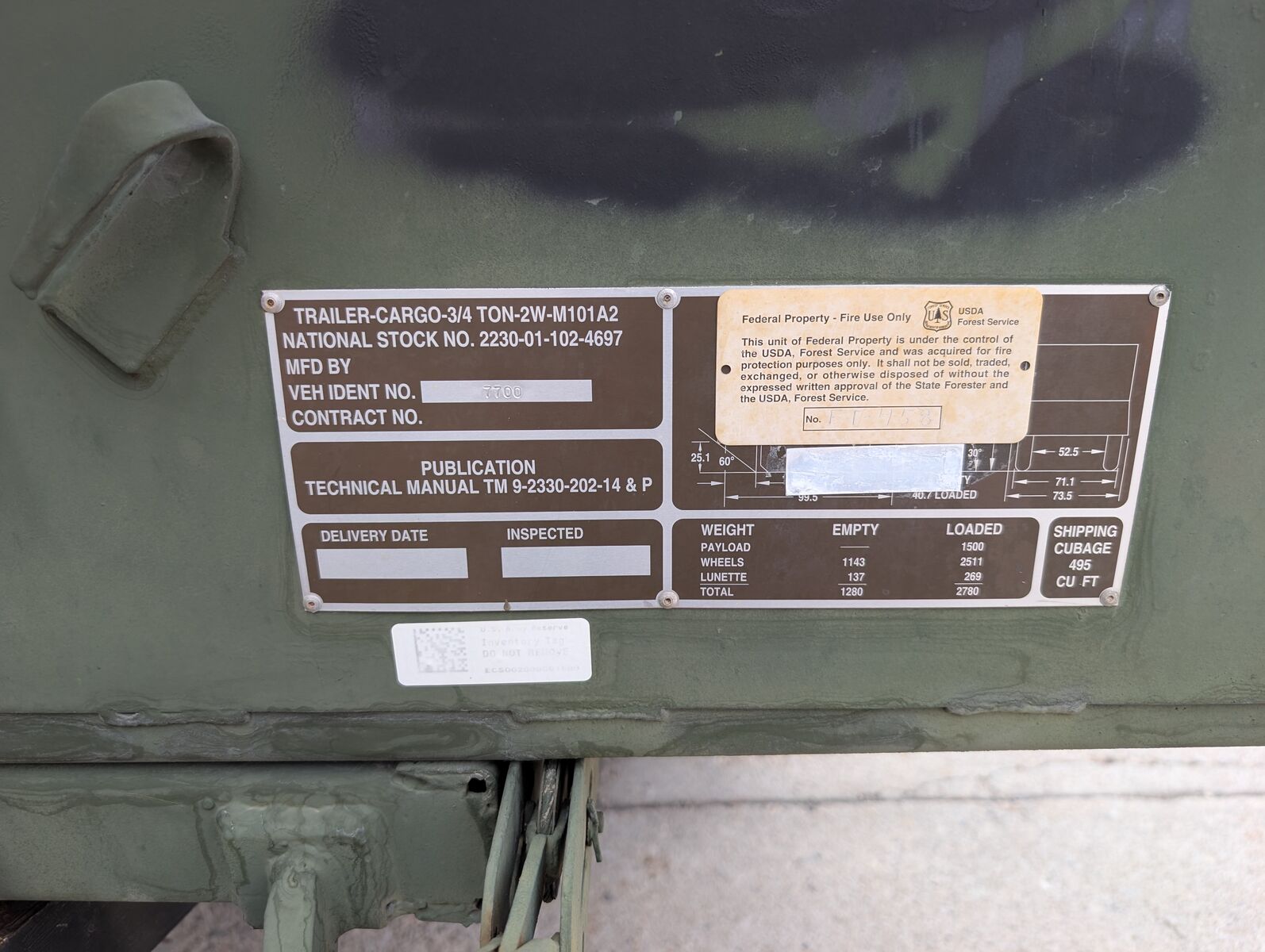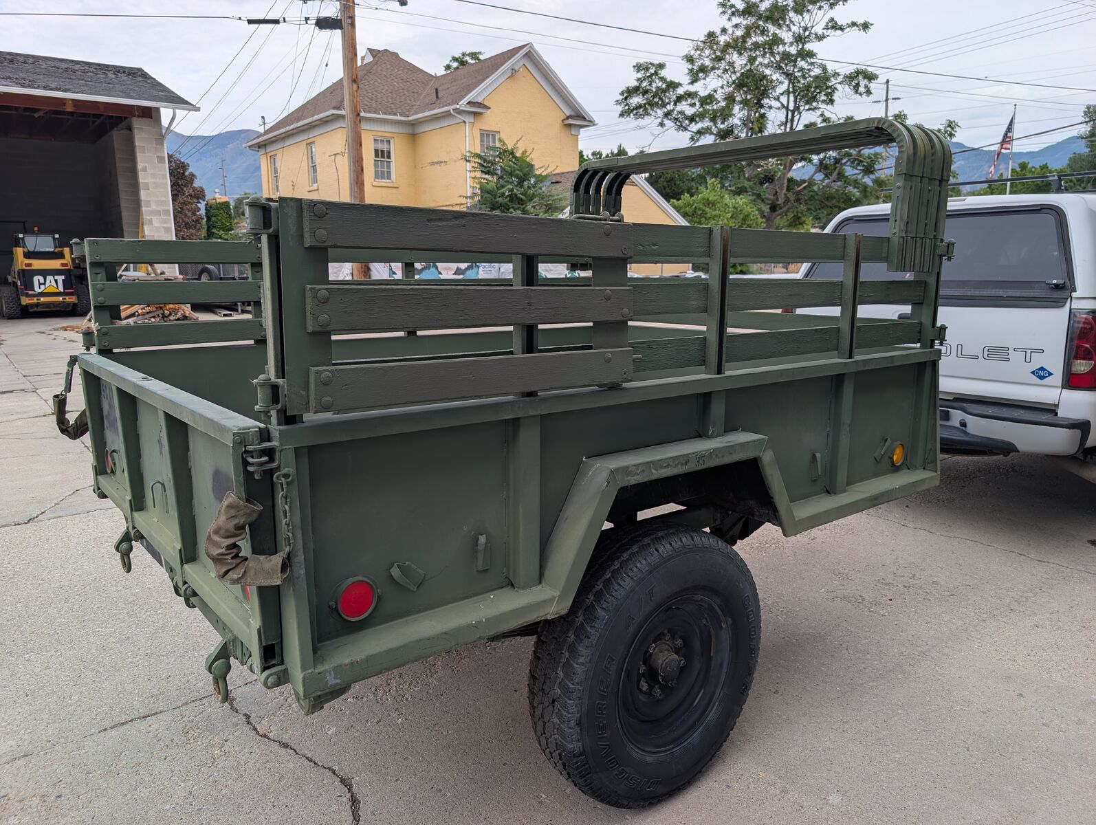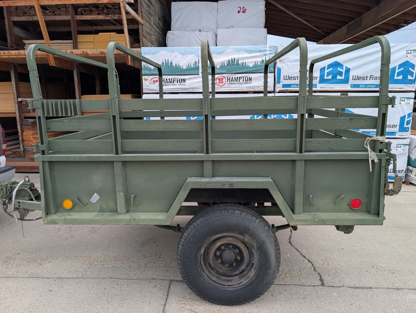 M101A2 Military cargo trailer. Like New not a scratch in the bed. This would be a great canidate for anyone looking to have a super clean vintage restoration. These things are 3/4 ton trailers (8 lug axle, 16" or larger wheel and tire combinations). This trailer has the bows and cover for the trailer and all the wood stake sides. It comes with independant parking brakes (one for each side). These are extremely popular to convert into overland trailers because of their offroad and camping capability. They work great as yard trailers for spring and fall clean up and hauling material to the dump. Thanks for looking and message with any questions. See my other listings for military trailers/gensets. Here are a couple key features: