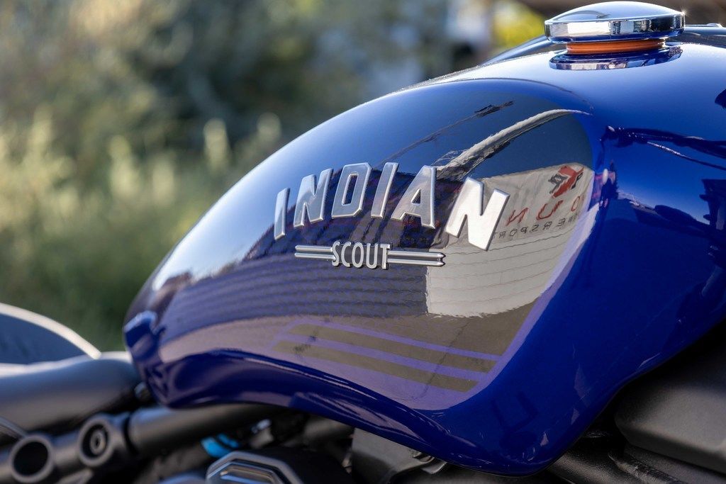 The contour lines on the rear fender seamlessly connect with the modern and dynamic Scout gas tank, creating a unified and premium blacked out aesthetic.