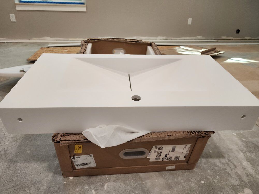VenmoWall mount ceramic sink with center drain. Dimensions 35.25 inches wide, 17-5/8 inches deep, 4-3/4 tall.