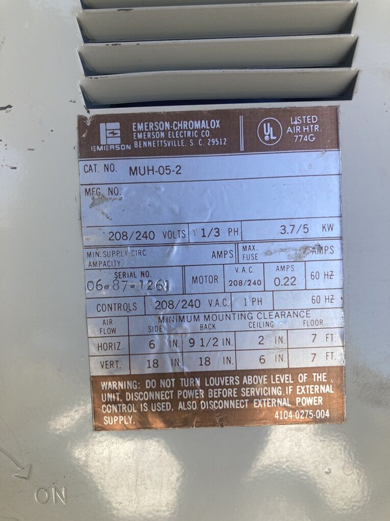 here’s a very good space mod made by Emerson 240 V fan driven garage heater. Has bracket set up for either side mount or top mount. I’ve had this for a while, but it has actual very low usage hours on it. A real value.