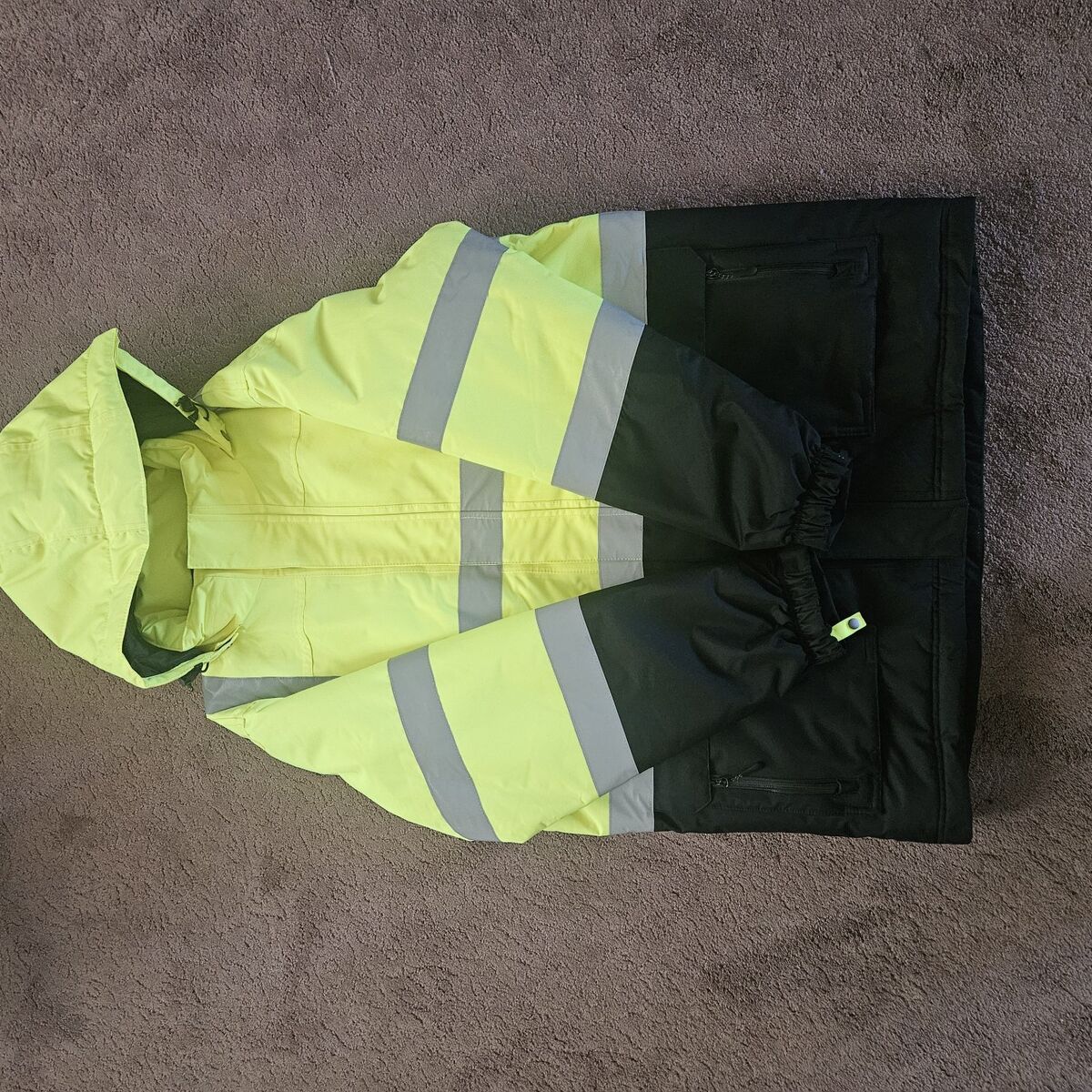 This is a Port Authority ANSI 107 Class 3 Safety Heavyweight Parka (J799S). It is ANSI/ISEA 107 Class 3 certified for high visibility. The parka has a waterproof rating of 8000MM and is fully seam-sealed. It is built for warmth, with a 6-ounce polyfill-lined body and 4-ounce polyfill-lined sleeves. Key features include a snap-off adjustable hood, a storm flap, and multiple pockets, including hand warmers and an interior media pocket.