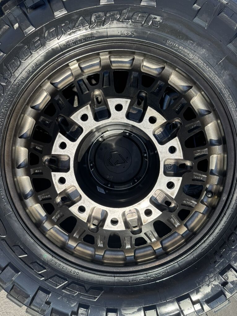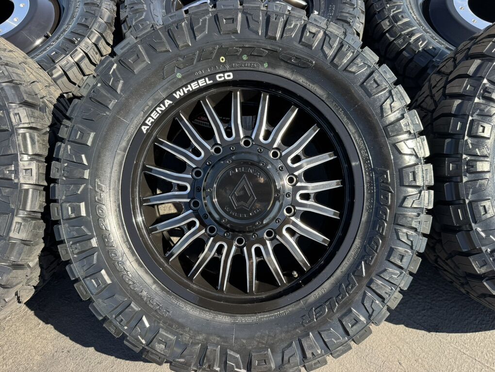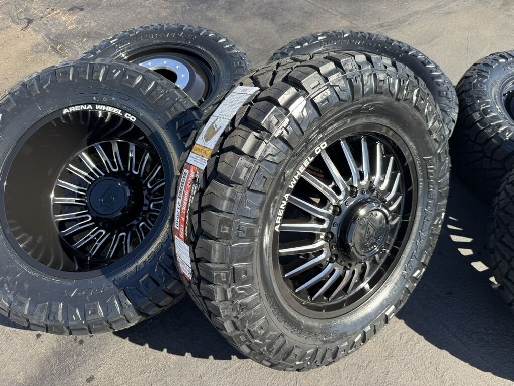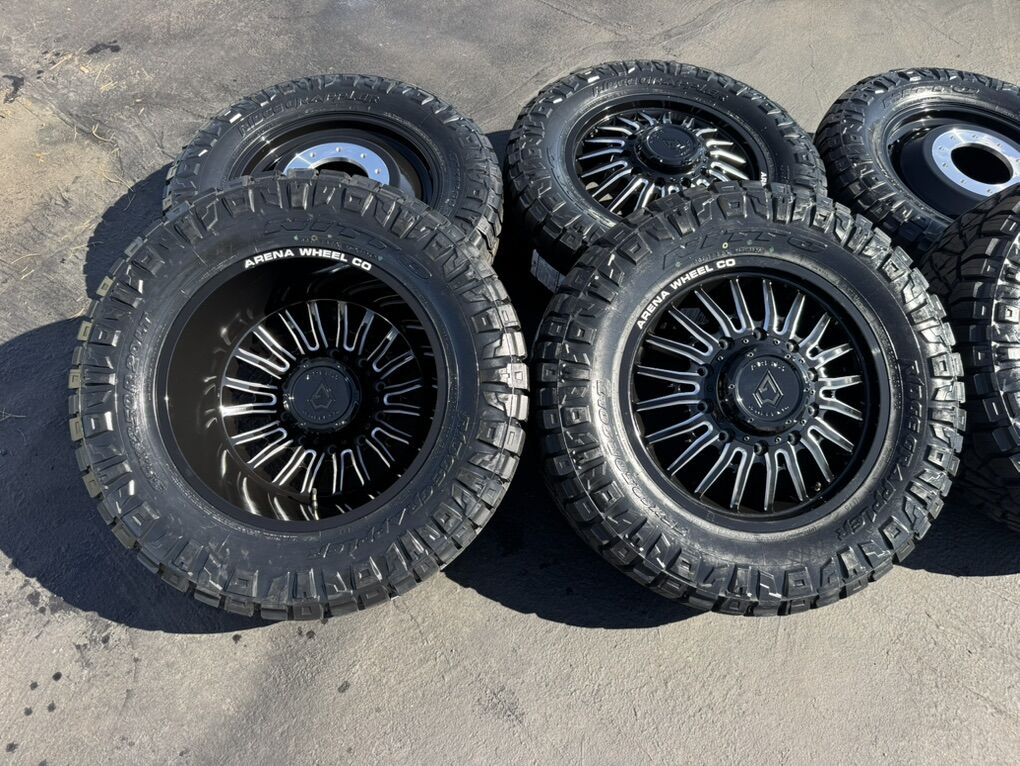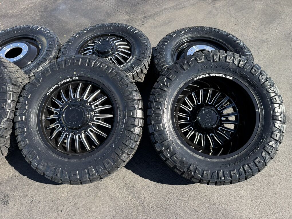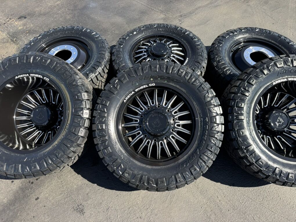ApplePayOn special! In stock available today!!! 6 Dually Arena Thunder wheels Gloss Black and Milled 20” 10x225mm bolt pattern. Mounted and balanced on 6 35x12.50r20 Nitto Ridge Grappler tires. Load F 12 ply. These fit 2005-2024 Ford F450 10 lug as well as 2008-2024 Dodge Ram 4500 and 5500. HUGE savings on this package!Massive savings!!!! Direct bolt on. Killer package! Must see in person