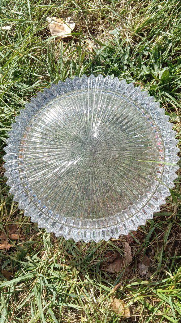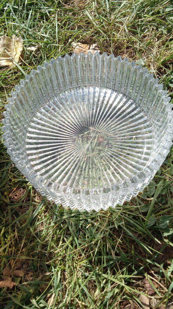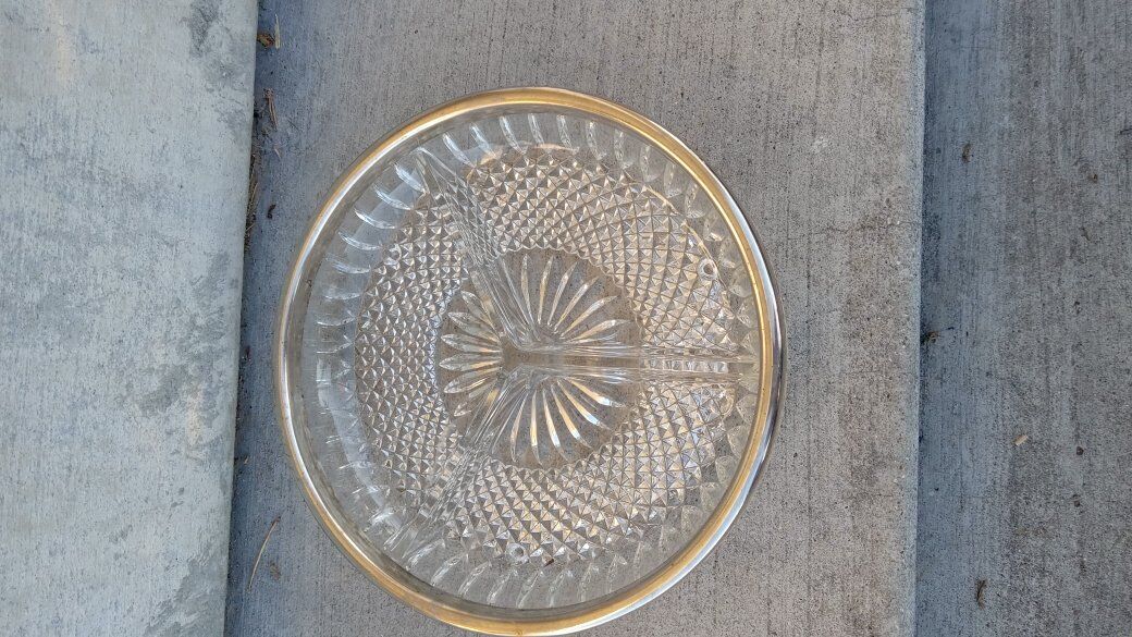 Vegetable tray/dish measures: 2" tall X 8" diameter and it has dividers creating 3 compartments inside. I believe it is sunburst lead-crystal.