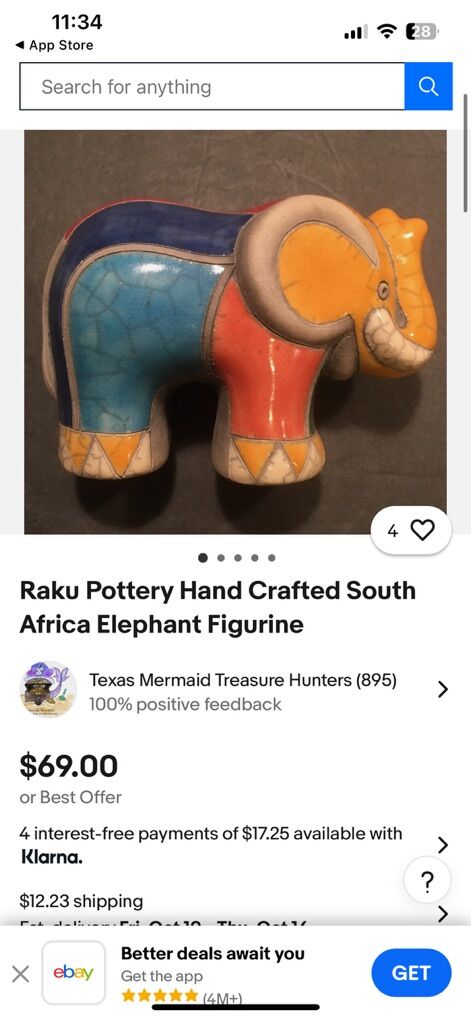VenmoIn like new condition, Raku signed hand crafted pottery elephant from South Africa figurine. Clean smoke free. Cash or Venmo. Pick up from Alpine.