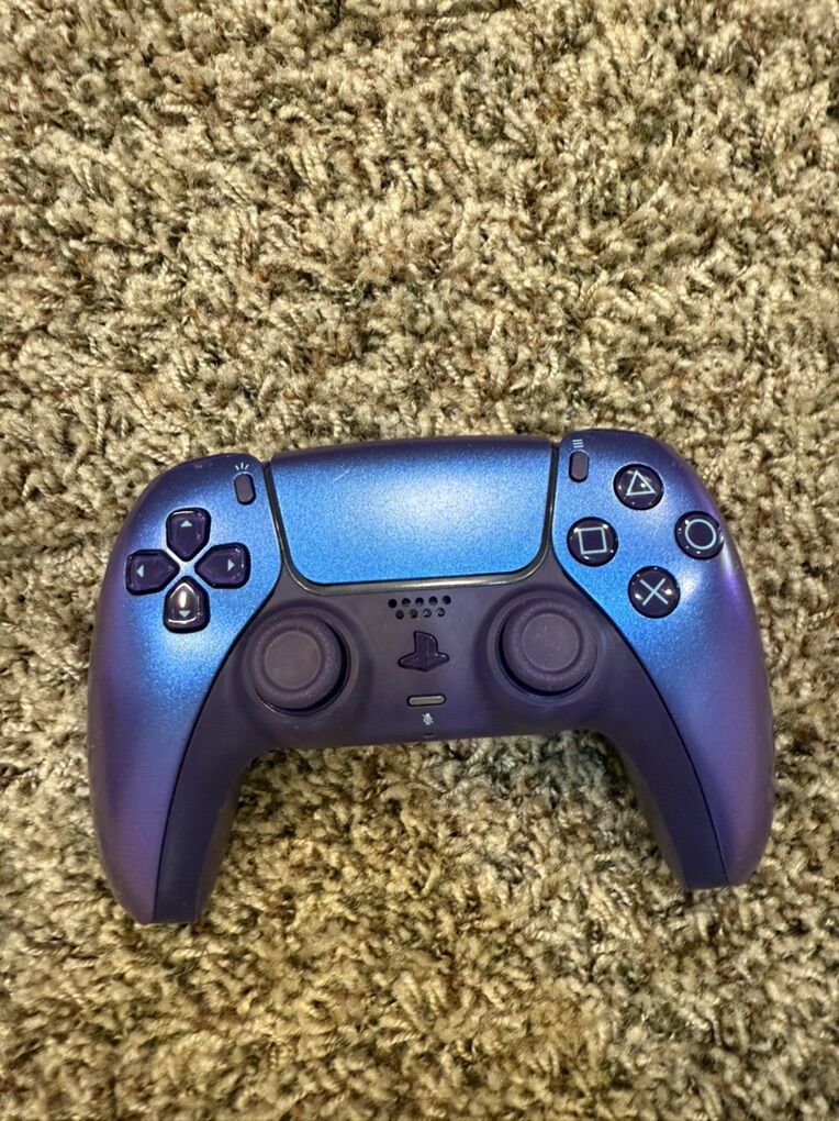 ApplePayPlayStation five disc version with a blue metallic looking controller. Comes with the power cable and the cord. Everything works and functions like new.