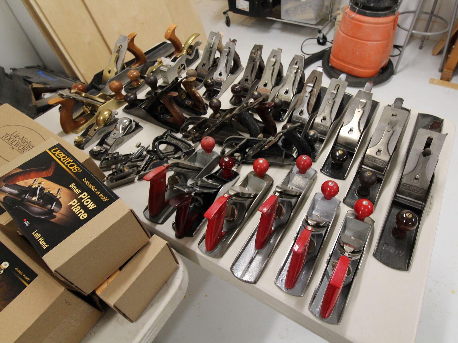 Veritas (all new in box) small plow plane (1 left, 1 right), router plane (and assorted blades), shoulder plane, No. 5 1/4 W bench plane, and Honing Guide kit (since these are all new in box you can find specs on them at Lee Valley Tools where they were purchased; pricing will be similar to Lee Valley with some discount, plus no tax, no shipping.