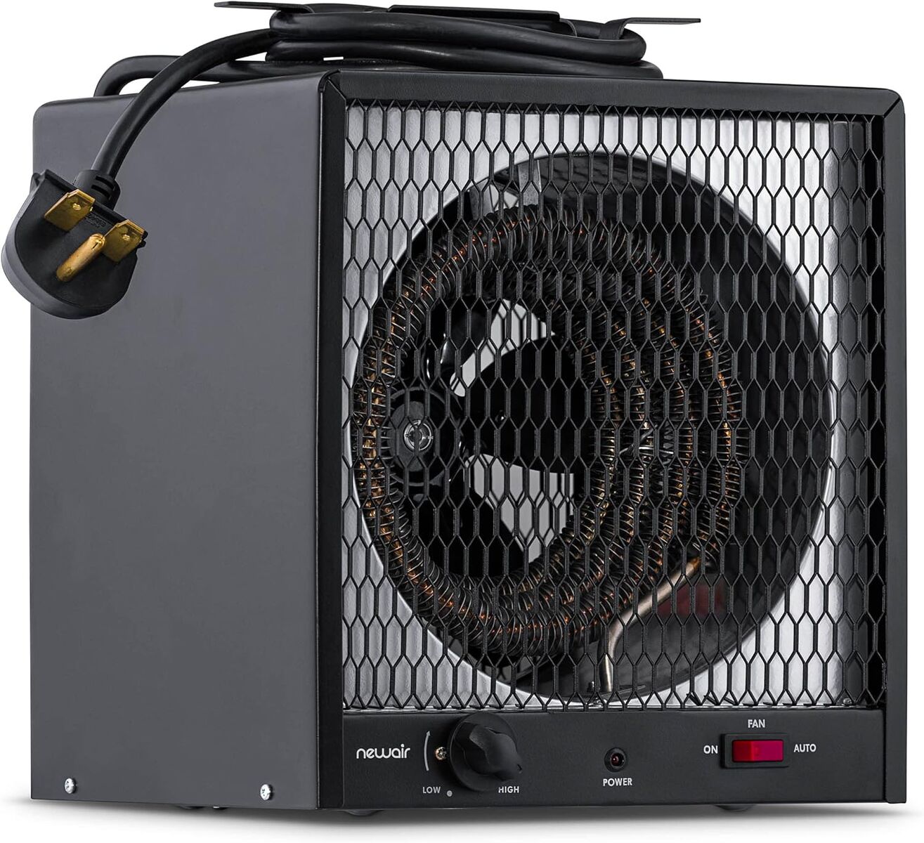 VenmoNewair 5600W Portable Electric Garage Heater - Heats Up to 800sq. ft. with 6-Foot Cord Wrap and Carrying Handle, Space Heater Ideal for Garage, Bedroom, Dorm, and Office. POWERFUL FAN FORCED HEATING- With 5,600 watts of heating power, this electric garage heater packs a punch. It's strong enough to warm up to 800 square feet—perfect for a two-car garage or a 24x24 workshop or shed. RUGGED EXTERIOR BUILT TO LAST- Black powder coated finish protects against scratches and scuffs, making this sturdy steel-bodied heater perfect for garages, workshops and light industrial environments. THERMOSTAT & AUTO-FAN TEMP CONTROL - Set the temperature you want. Once the space has reached the ideal temperature, the fan will automatically kick-in as needed to keep your workshop warm. ORTABILITY FEATURES FOR FAR-RANGING HEAT - 2 portable features: the cord wrap and carry handle. SAFETY FEATURES FOR PEACE OF MIND - Automatic shut-off function that prevents overheating. NOTE: 230 30 AMP Outlet Required. Price REDUCTION!