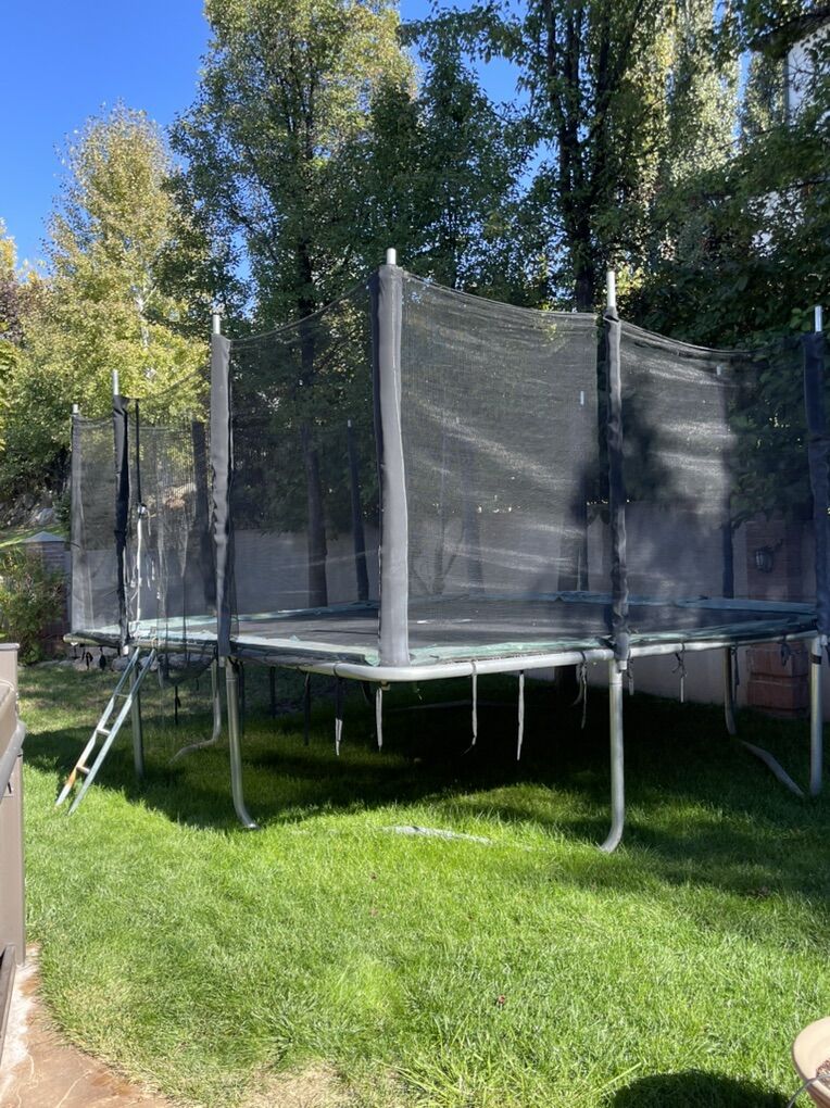 It is 14 by 16 feet, so almost square. No tears in mat or pad. New springs purchased this year. Complete net surround. Only issue is the zipper doesn’t close and is torn on entry in net (see in picture). Comes with ladder.