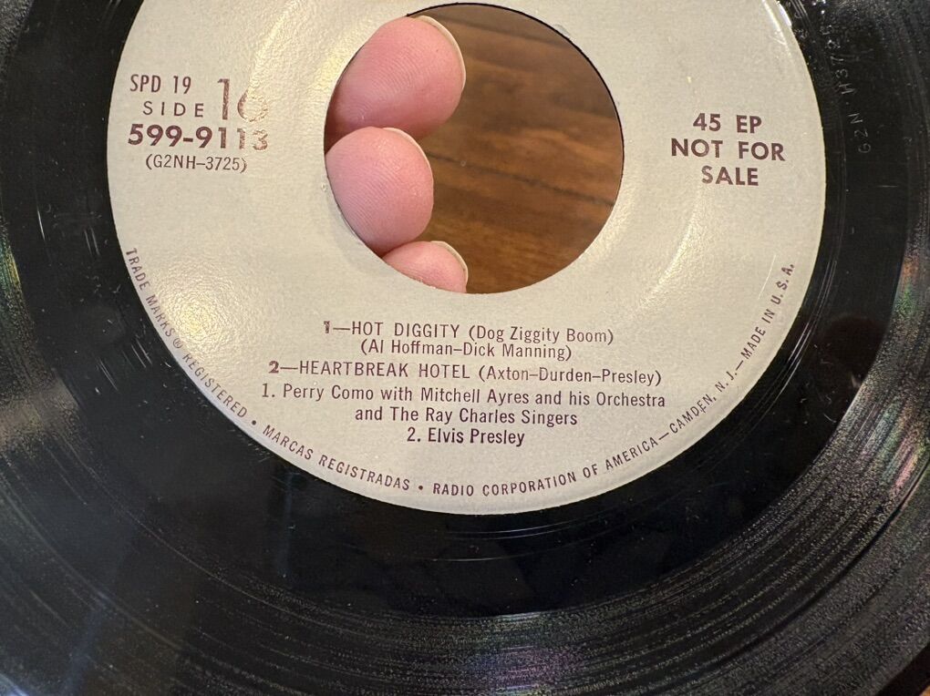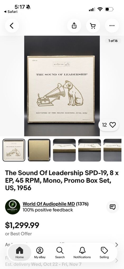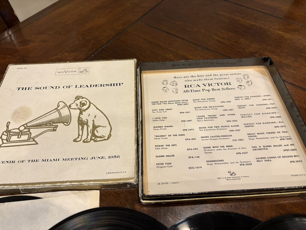 I have a box set of vinyl records called The Sound of Leadership from 1956. It was a promo set given out to record executives and included Jailhouse Rock by Elvis Presley before he had released any records with RCA. They are 45s with singles on each side from a lot of different artists. It originally had 8 records but mine is missing 1. I have the one with Elvis but am missing #4 (the backside is #13). It has the booklet and all of the paperwork in the box. I’ve included pictures of an old eBay listing that had a good description (listed for $999) and a current eBay listing for $1299.99. See my other ads for jewelry, artwork, home decor and more.