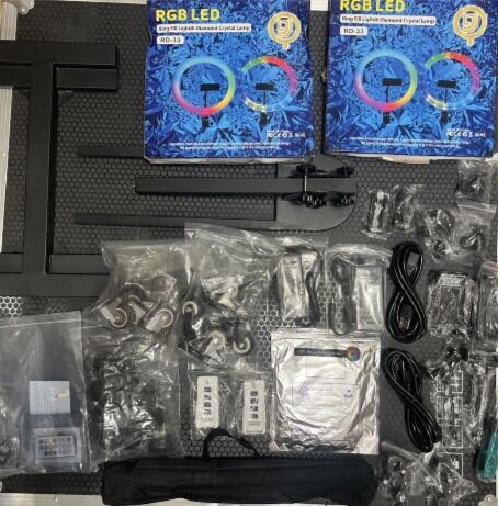 This has never been used. It comes with 2 ring lights and 2 remote controls. I plugged the rotating device in to verify that it works. Works perfectly. The flight case is a little banged up from being moved around the warehouse.