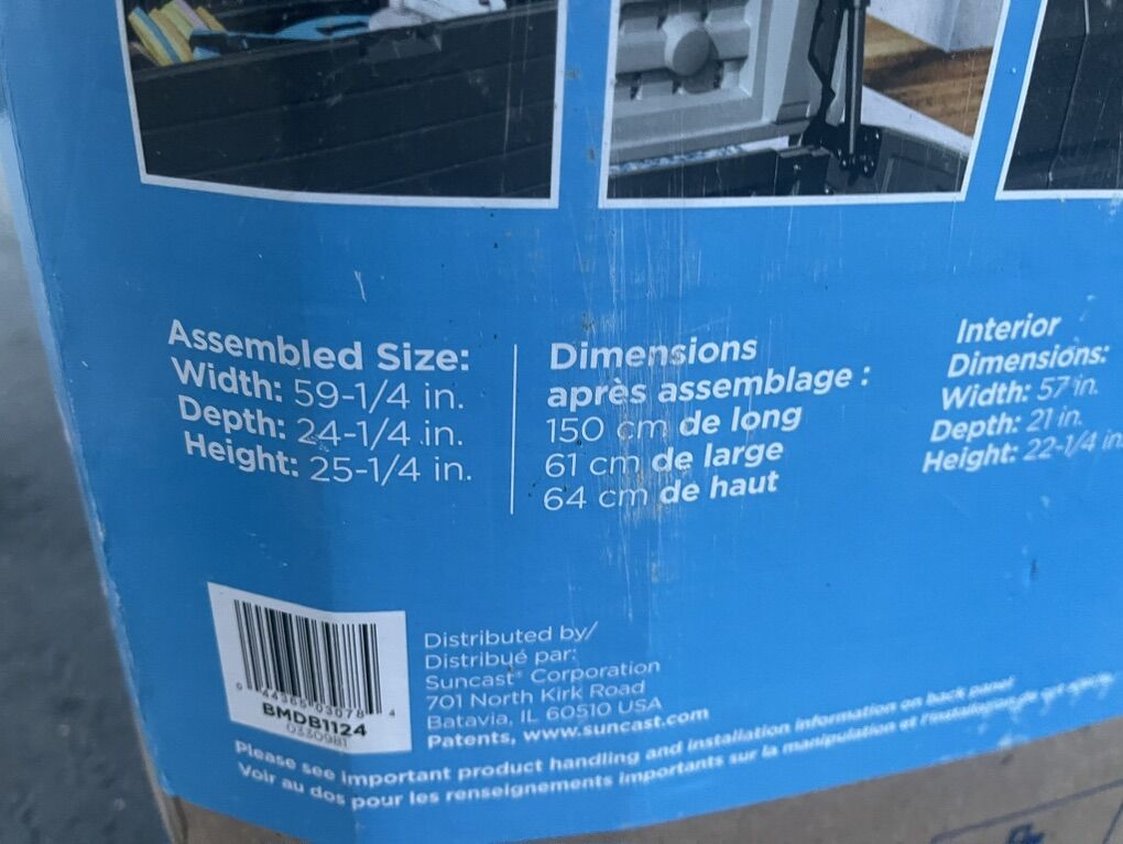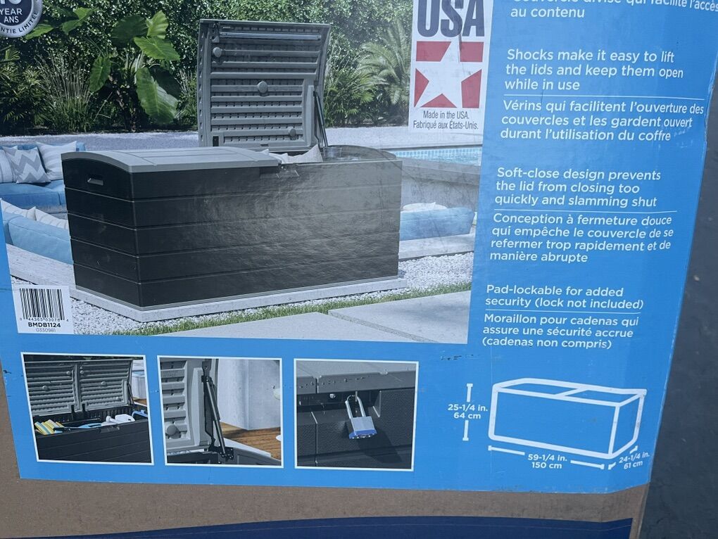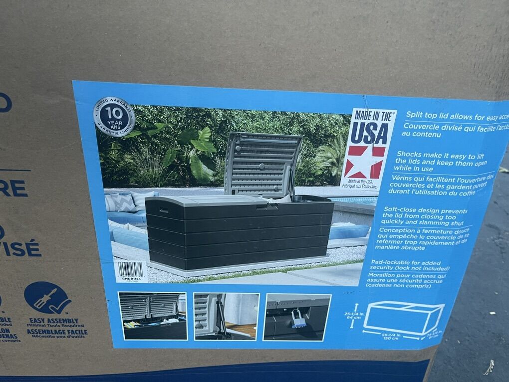 VenmoSuncast 120 Gallon Split Lid Extra Large Deck Box Multi-Wall Panels are Engineered for Strength & Durability All-Weather Construction Provides Water Resistance & UV Protection Split Top Lid Allows for Easy Access Great for Storing Patio Cushions and Outdoor Accessories Spring Shocks Make It Easy to Lift The Lids and Keep Them Open While in Use