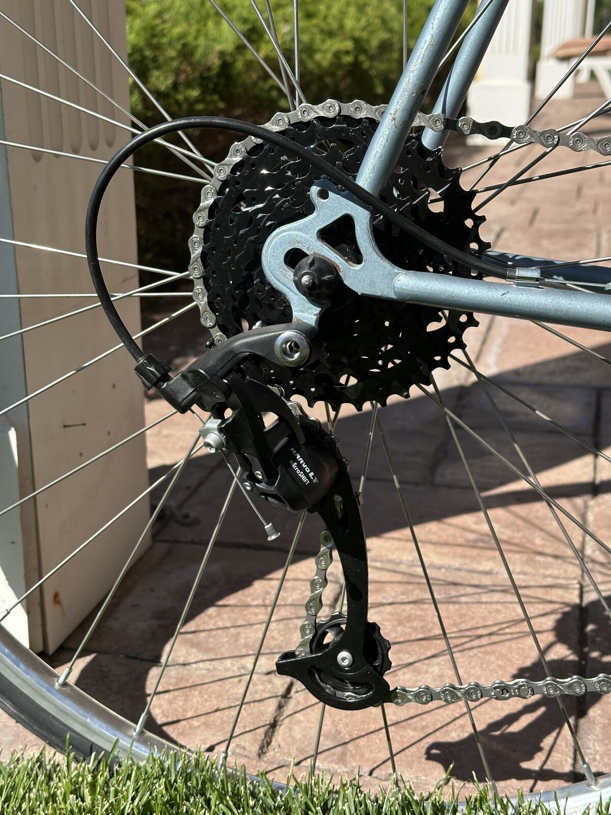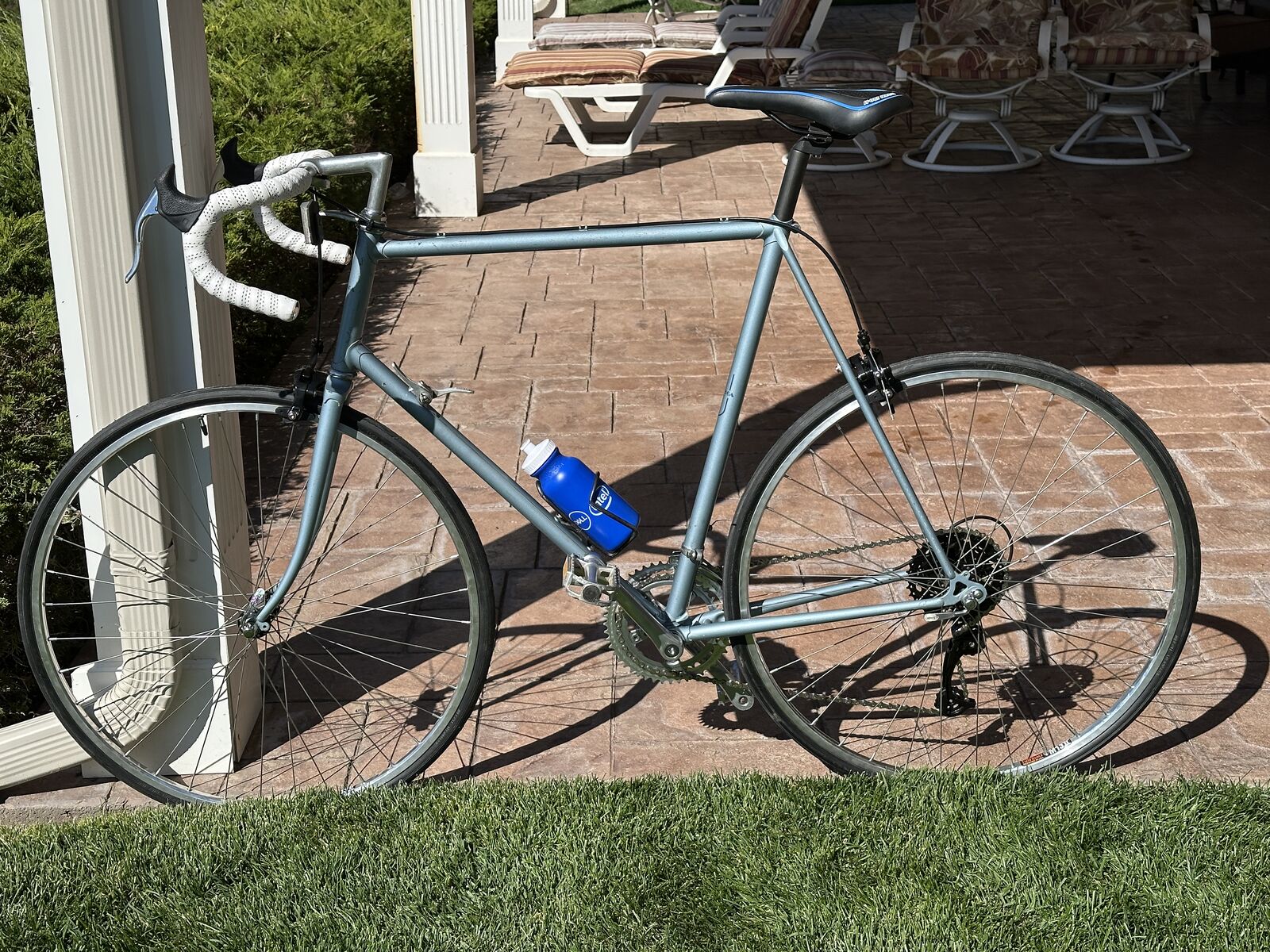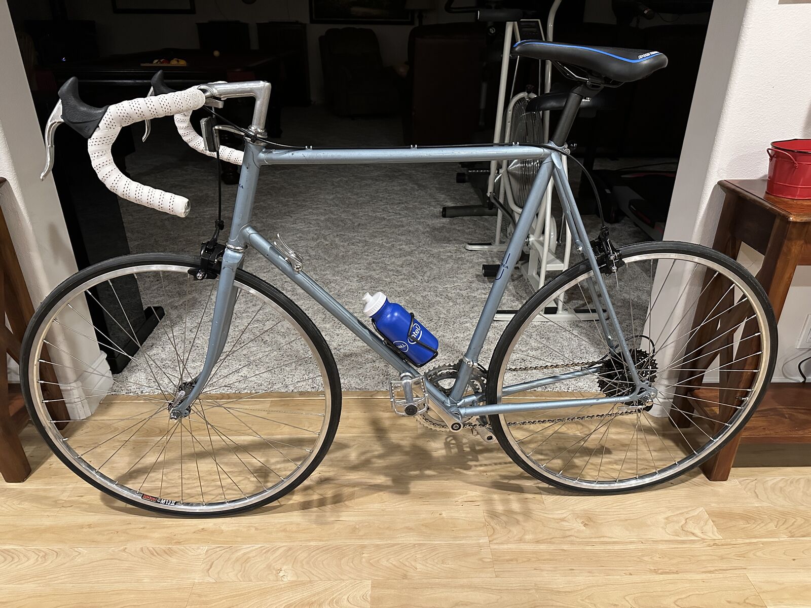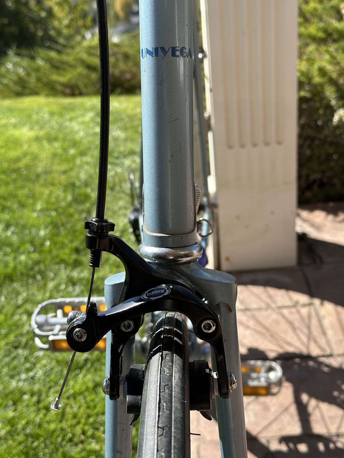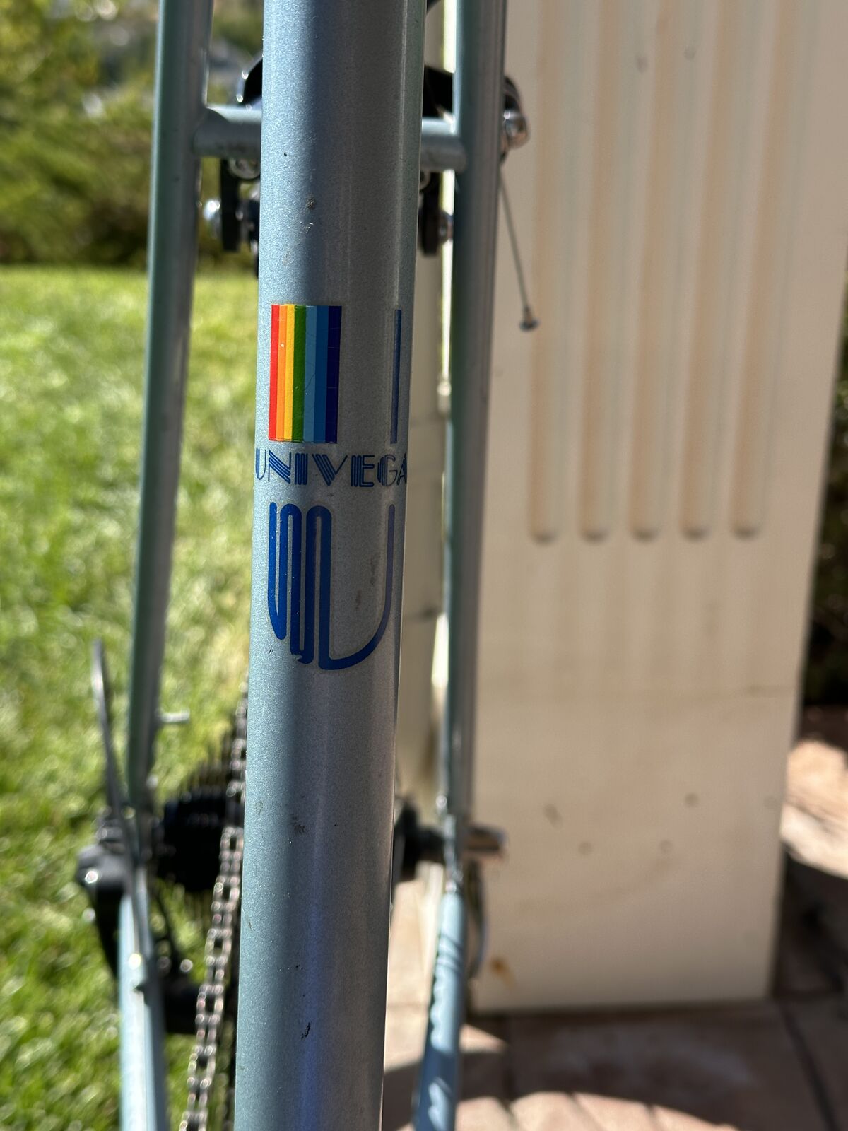 This bike was manufactured by Miyata, the same company that manufactured the renowned Miyata One Thousand touring bike. It was marketed by Univega, a company founded by Ben Lawee. This bike has been completely refurbished with new wheels with Sun rims and stainless steel spokes, a new 9-speed 11-36 casssette, SR Sakae SX 48/38 alloy crankset, new 9-speed KMC chain, new CST 27" x 1-1/8" tires and tubes with Presta valves, new Microshift Marvo LT rear derailleur, aero brake levers, new dual-pivot side-pull brake calipers, new saddle with central cutout, new alloy micro-adjustable seatpost, bottle cage with new water bottle, and new handlebar tape. The pedals are original alloy racing pedals.