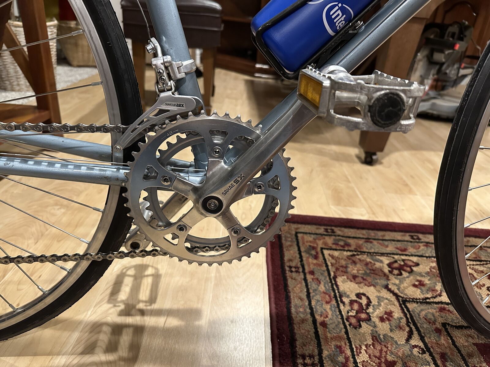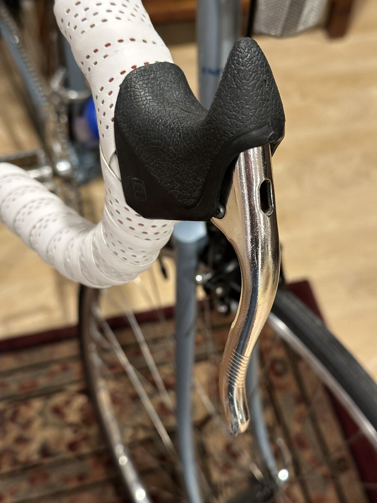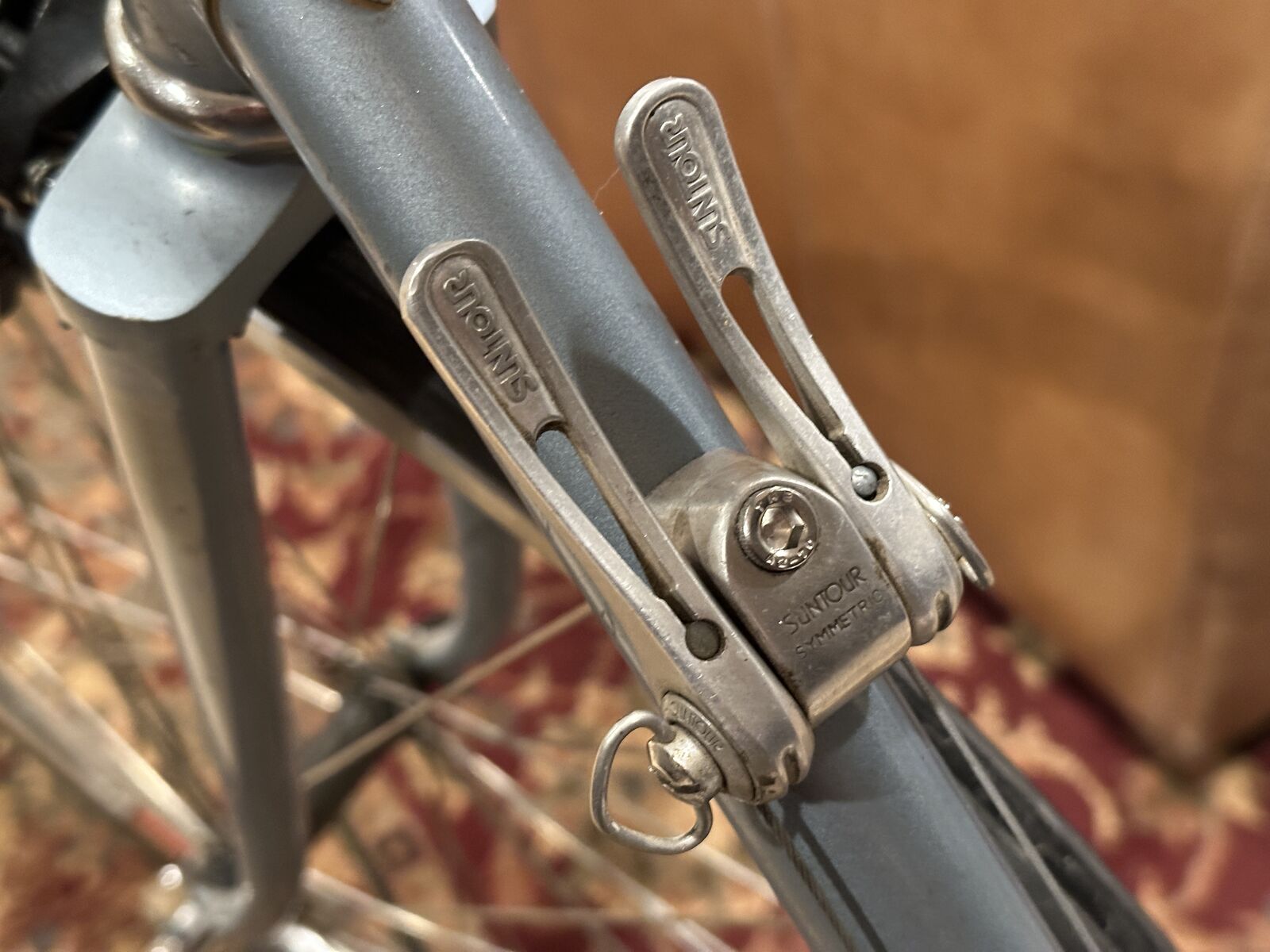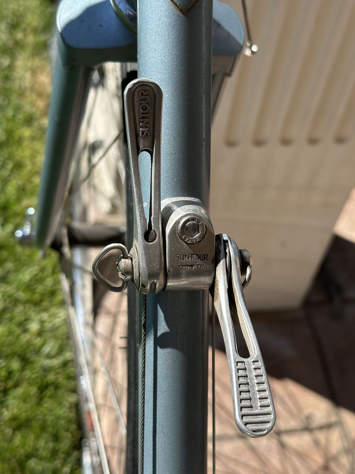 As nearly as I can tell, the lugged frame of this bike has chromoly double-butted main frame tubes, high-tension steel chain and seat stays and a Magnalite fork. Magnalite was Miyata's trademark for manganese-molydenum alloy steel tubing similar to Reynolds 531. The dropouts are stamped steel--not forged. This bike has the only set of shifters, other than modern electronic shifters, that automatically adjust the front derailleur when the rear derailleur is moved. That is why both shifters sit on top of the downtube. When the right shifter is moved, the left shifter moves forward and back about 3/8 inch, which adjusts the front derailleur. This was a very clever idea.