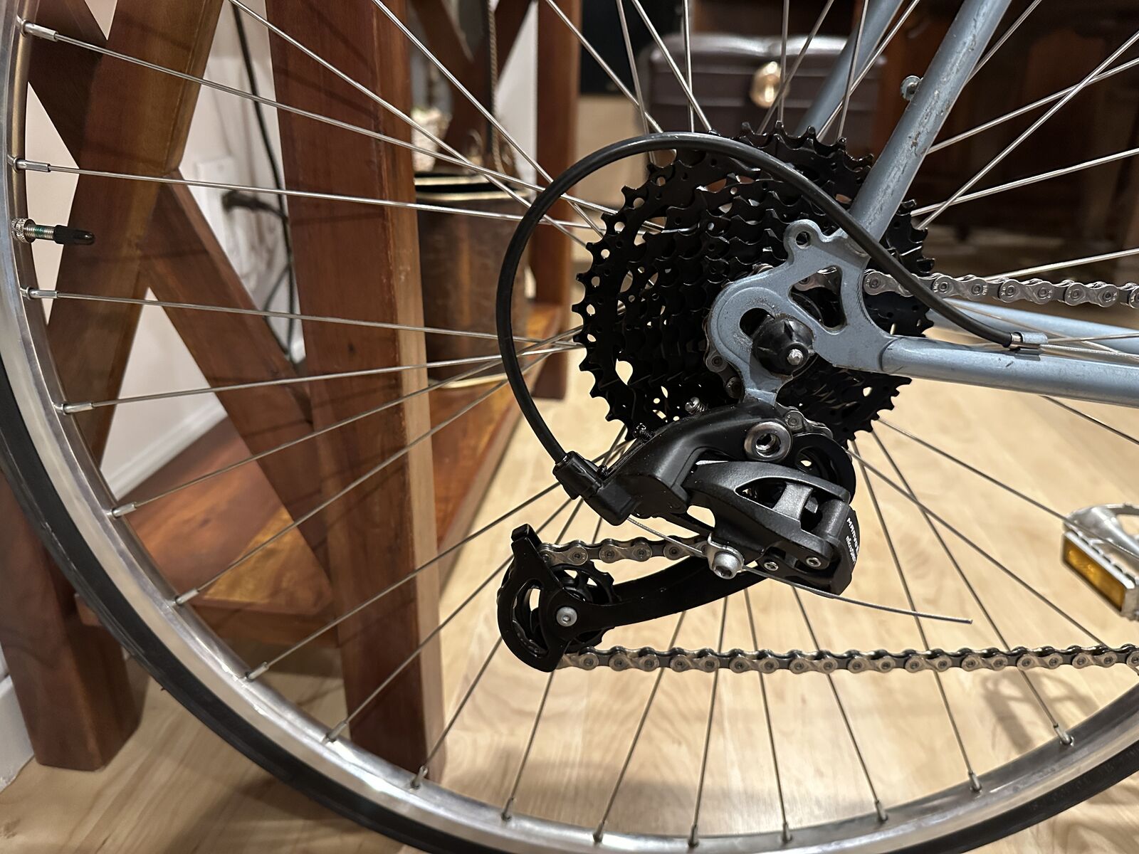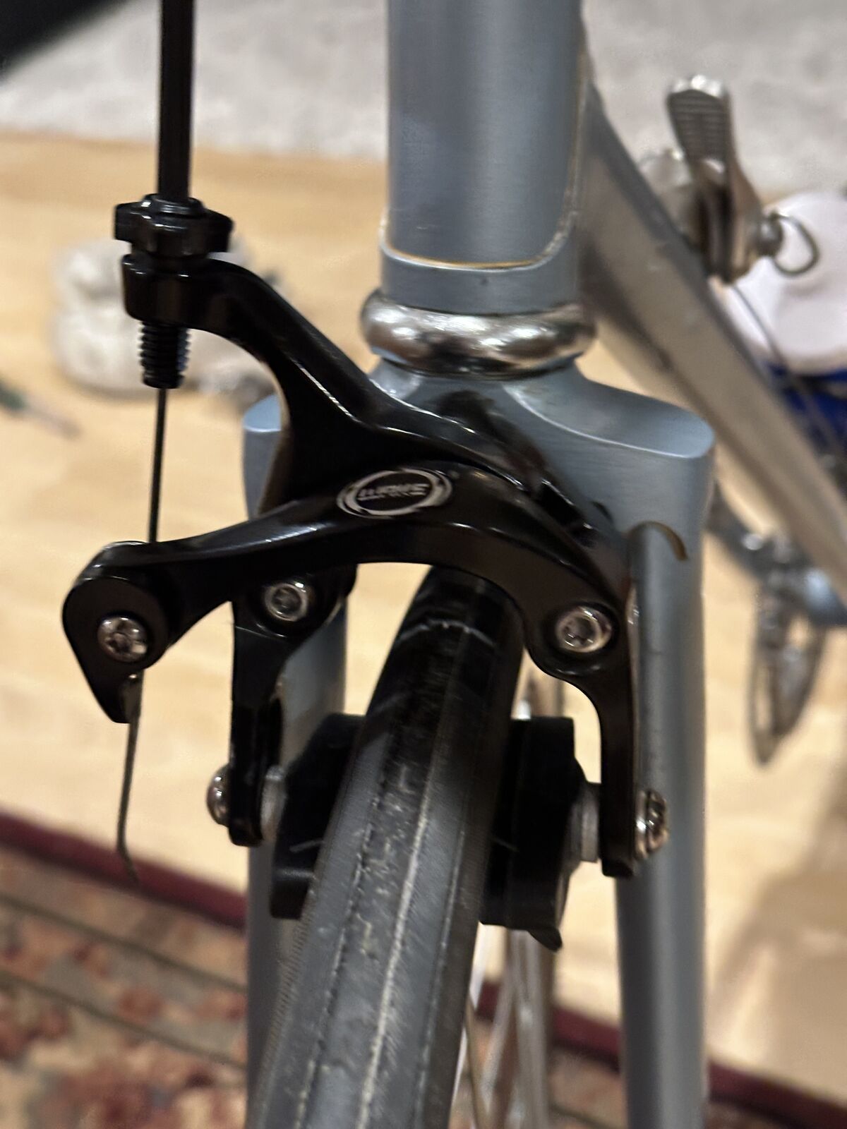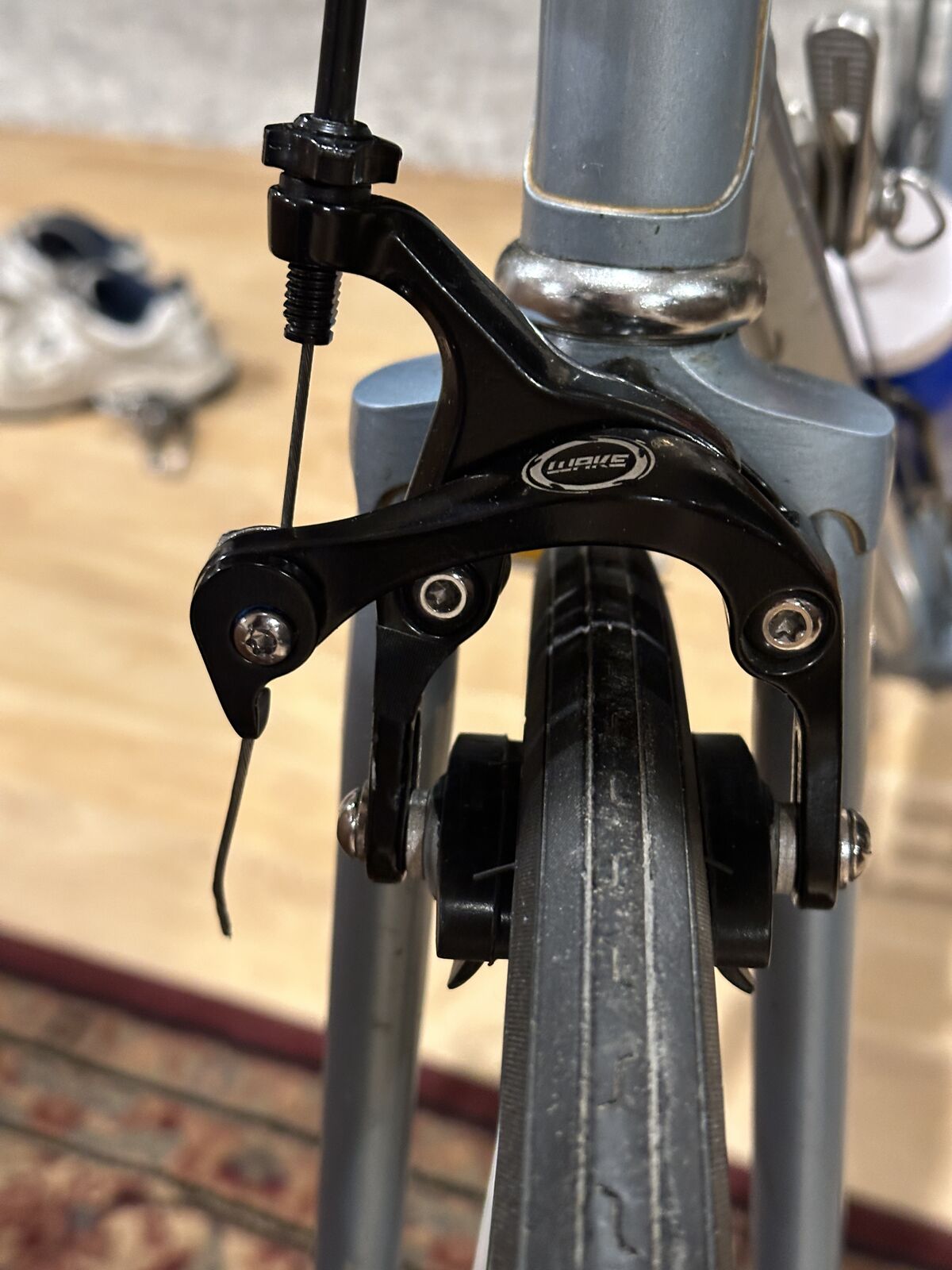 As nearly as I can tell, the lugged frame of this bike has chromoly double-butted main frame tubes, high-tension steel chain and seat stays and a Magnalite fork. Magnalite was Miyata's trademark for manganese-molydenum alloy steel tubing similar to Reynolds 531. The dropouts are stamped steel--not forged. This bike has the only set of shifters, other than modern electronic shifters, that automatically adjust the front derailleur when the rear derailleur is moved. That is why both shifters sit on top of the downtube. When the right shifter is moved, the left shifter moves forward and back about 3/8 inch, which adjusts the front derailleur. This was a very clever idea.