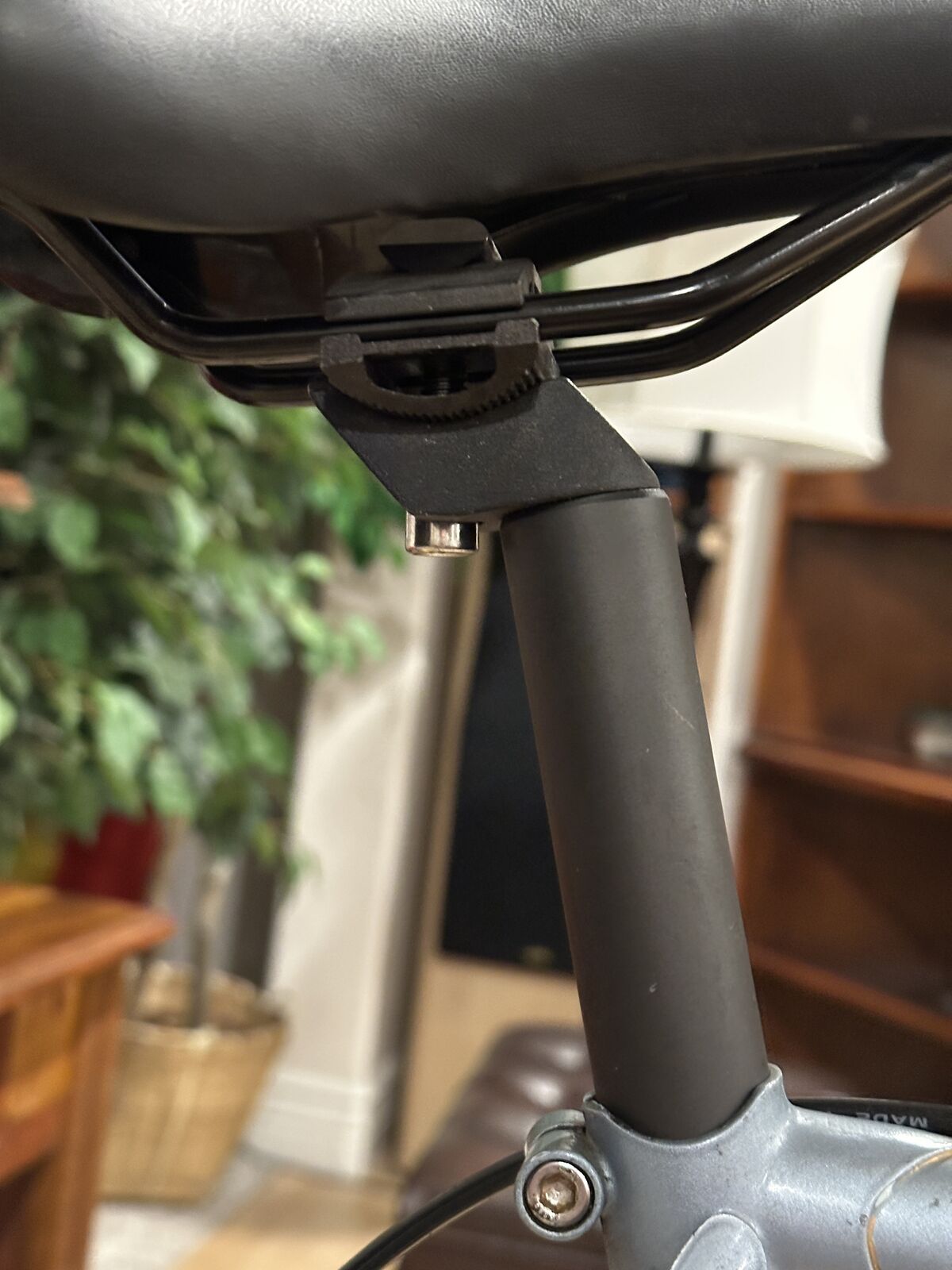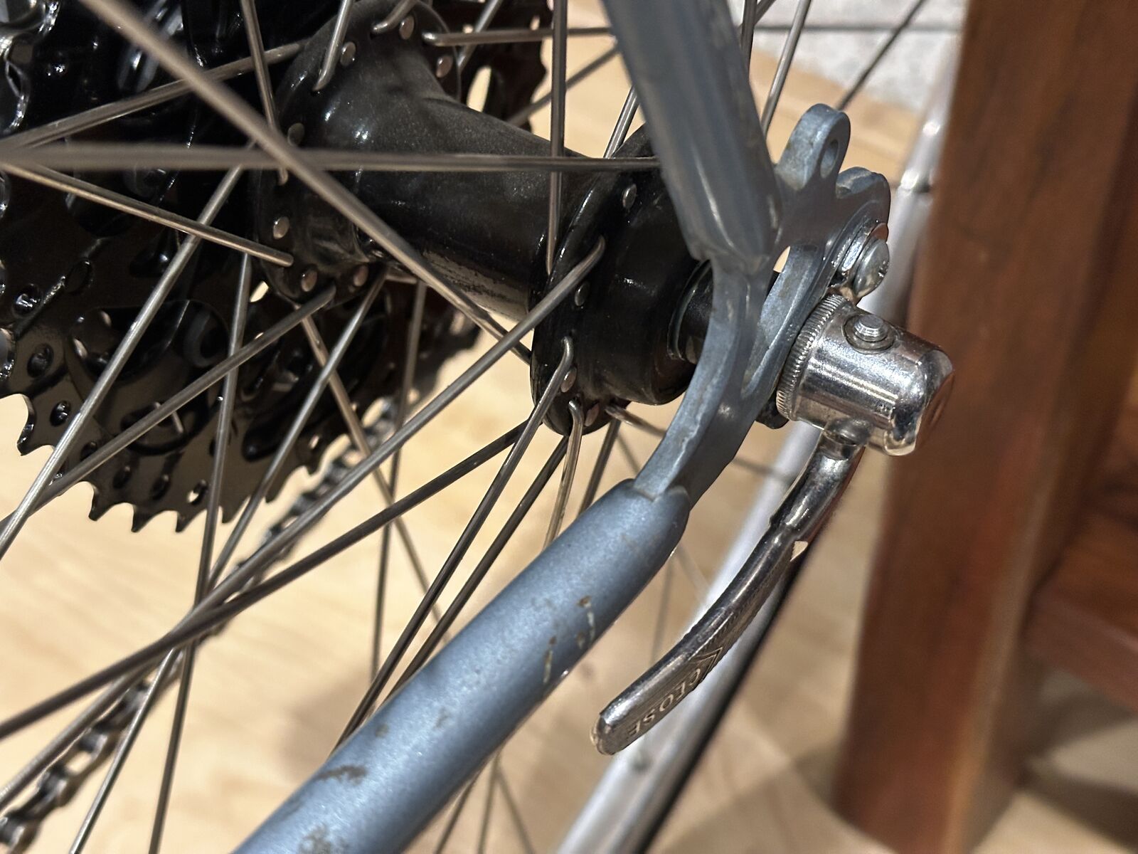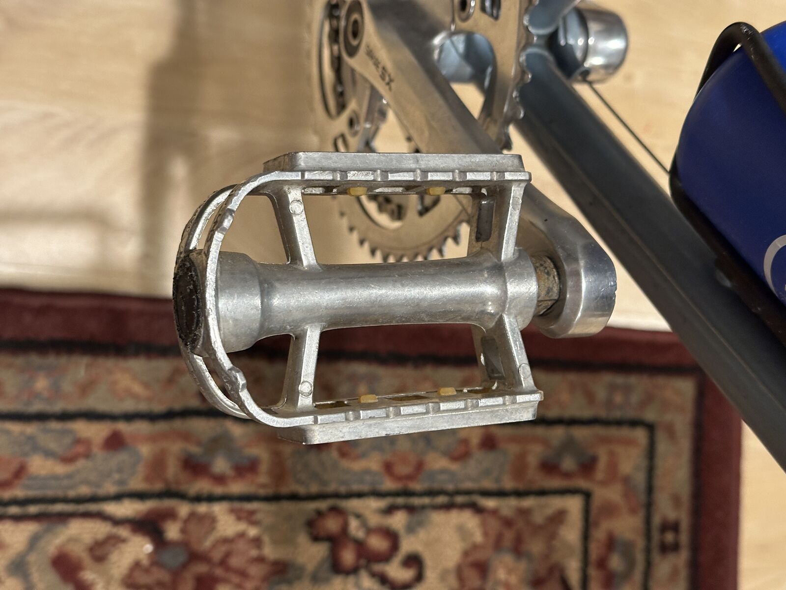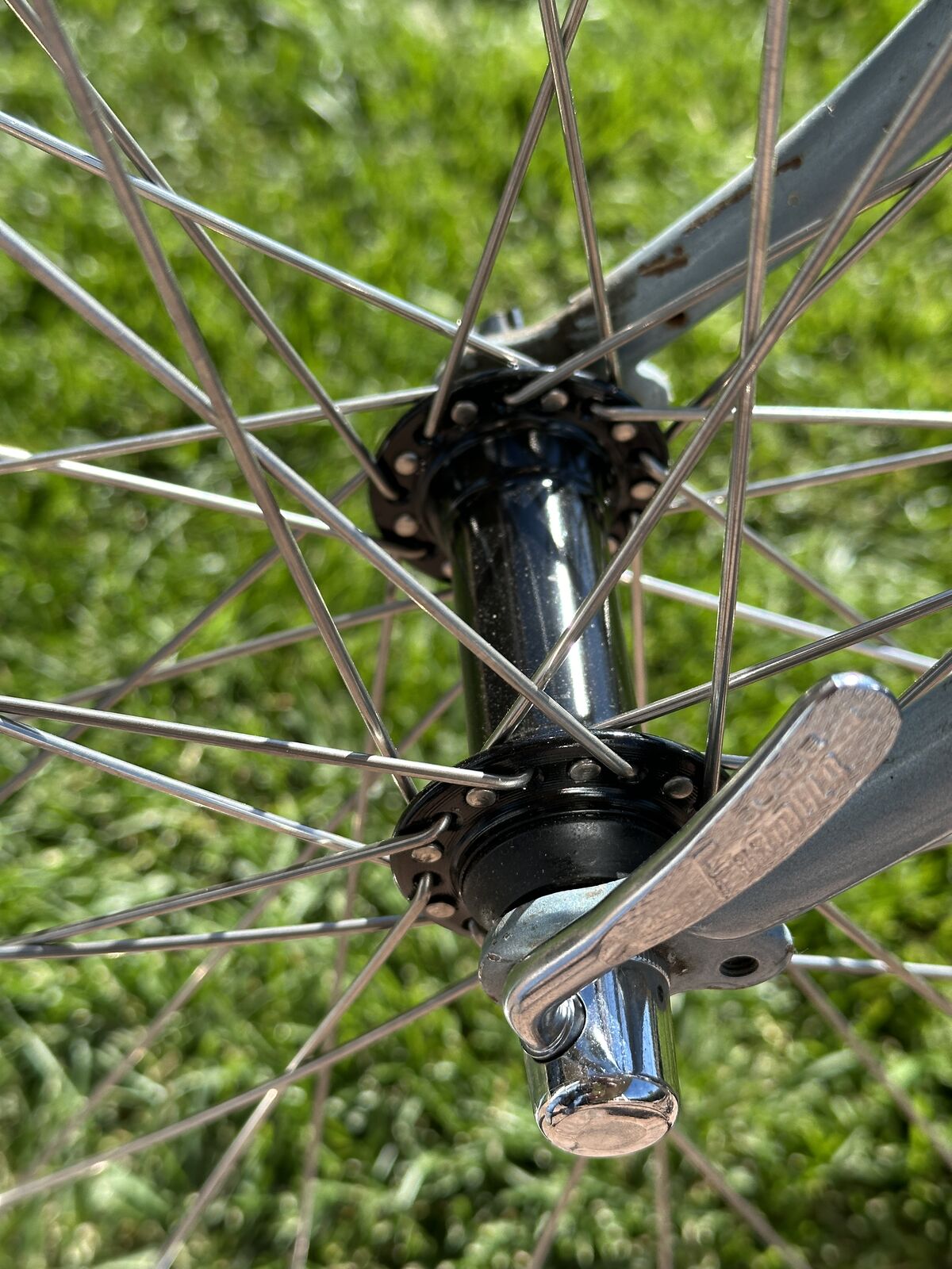 As nearly as I can tell, the lugged frame of this bike has chromoly double-butted main frame tubes, high-tension steel chain and seat stays and a Magnalite fork. Magnalite was Miyata's trademark for manganese-molydenum alloy steel tubing similar to Reynolds 531. The dropouts are stamped steel--not forged. This bike has the only set of shifters, other than modern electronic shifters, that automatically adjust the front derailleur when the rear derailleur is moved. That is why both shifters sit on top of the downtube. When the right shifter is moved, the left shifter moves forward and back about 3/8 inch, which adjusts the front derailleur. This was a very clever idea.