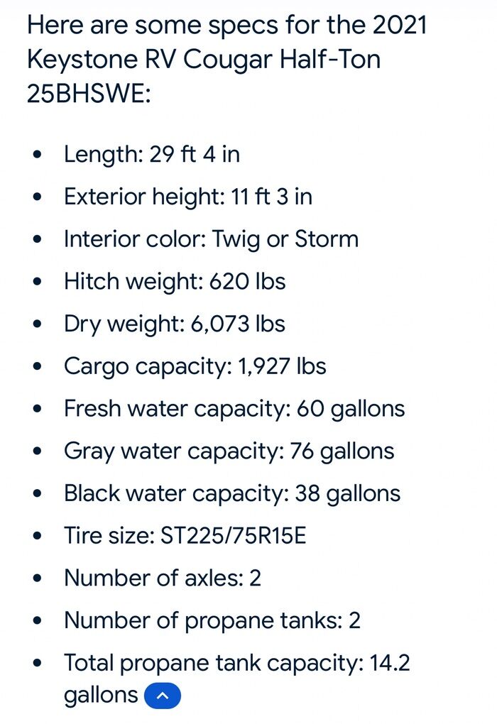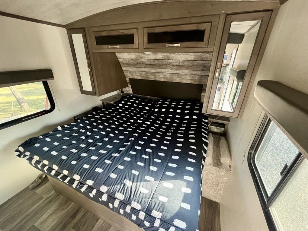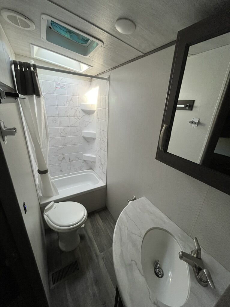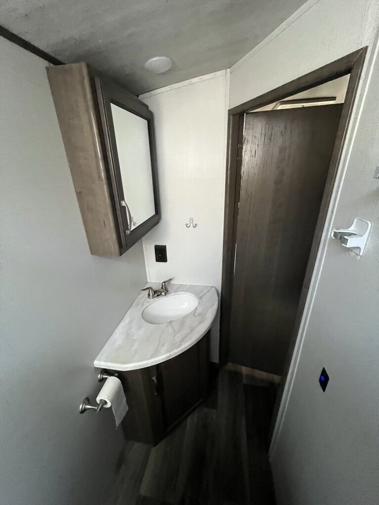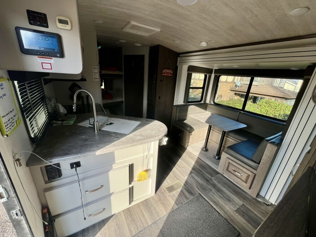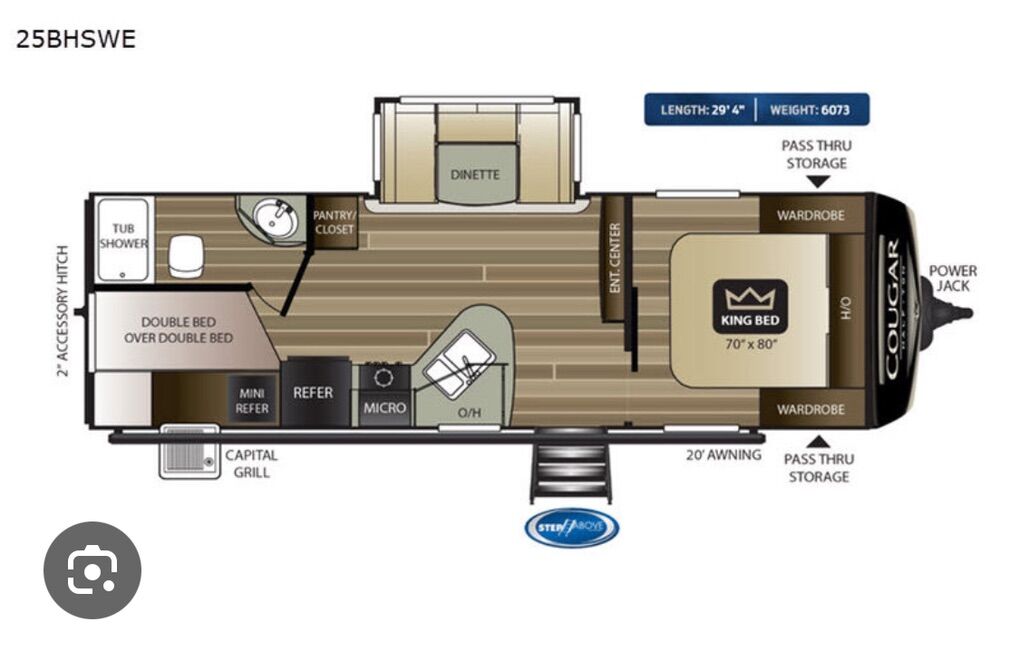 25’ long. 8000lb GVWR. Sleeps 8. Large bunks sleep 2 each with a weight rating of 300lbs each. King sized bed with Beddy bed cover. True 4 season rated to 0 degrees with belly heat and 12v tank heaters. Roof mounted solar with charge controller and 2000W power inverter. Trailer functions controlled through touch screen and Bluetooth to phone app. Electric awning and tongue jack. 60 gallon fresh water tank. 7 gallon propane tanks. Porcelain toilet. Lots of storage. All tires replaced with higher load rating than factory originals. Bearings packed with Lucas red synthetic and brakes adjusted last summer. Pipe plugs replaced with valves for easier draining/winterizing. Rear hitch reinforced and light plug added for LIGHT double pulling. Will include hitch equalizer if desired.