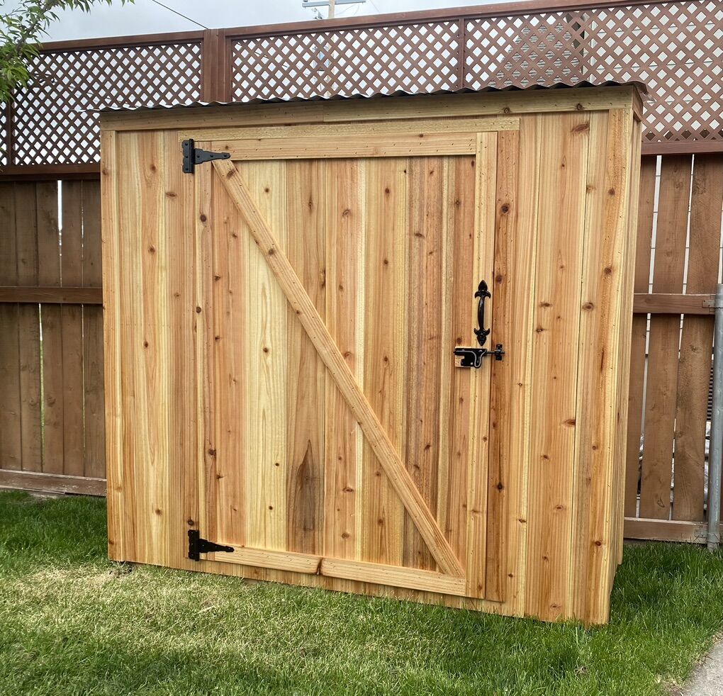 6x2.5x6 solid wood storage shed. Double wood, large access door, shelves, polyurethaned and metal roof. Located in Riverton.