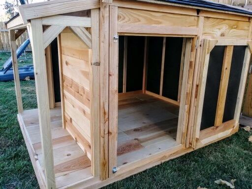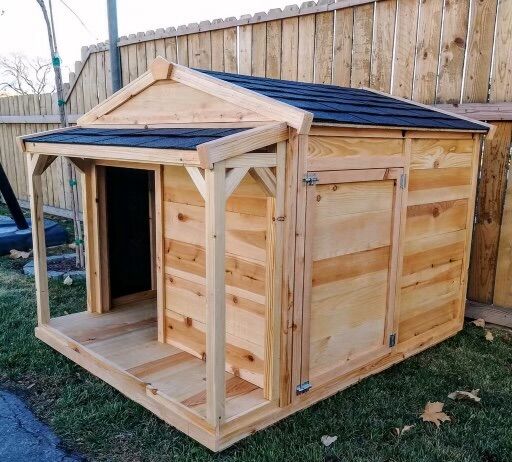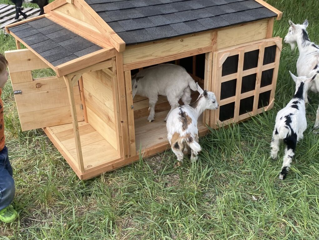 New solid wood insulated goat/dog house. Weather sealed, insulated, and shingled. Can add a XL insulated doggie door for an extra $80 and add a heater for extra $60. House is 5ftX4ftX4f. (Inside 4X4)