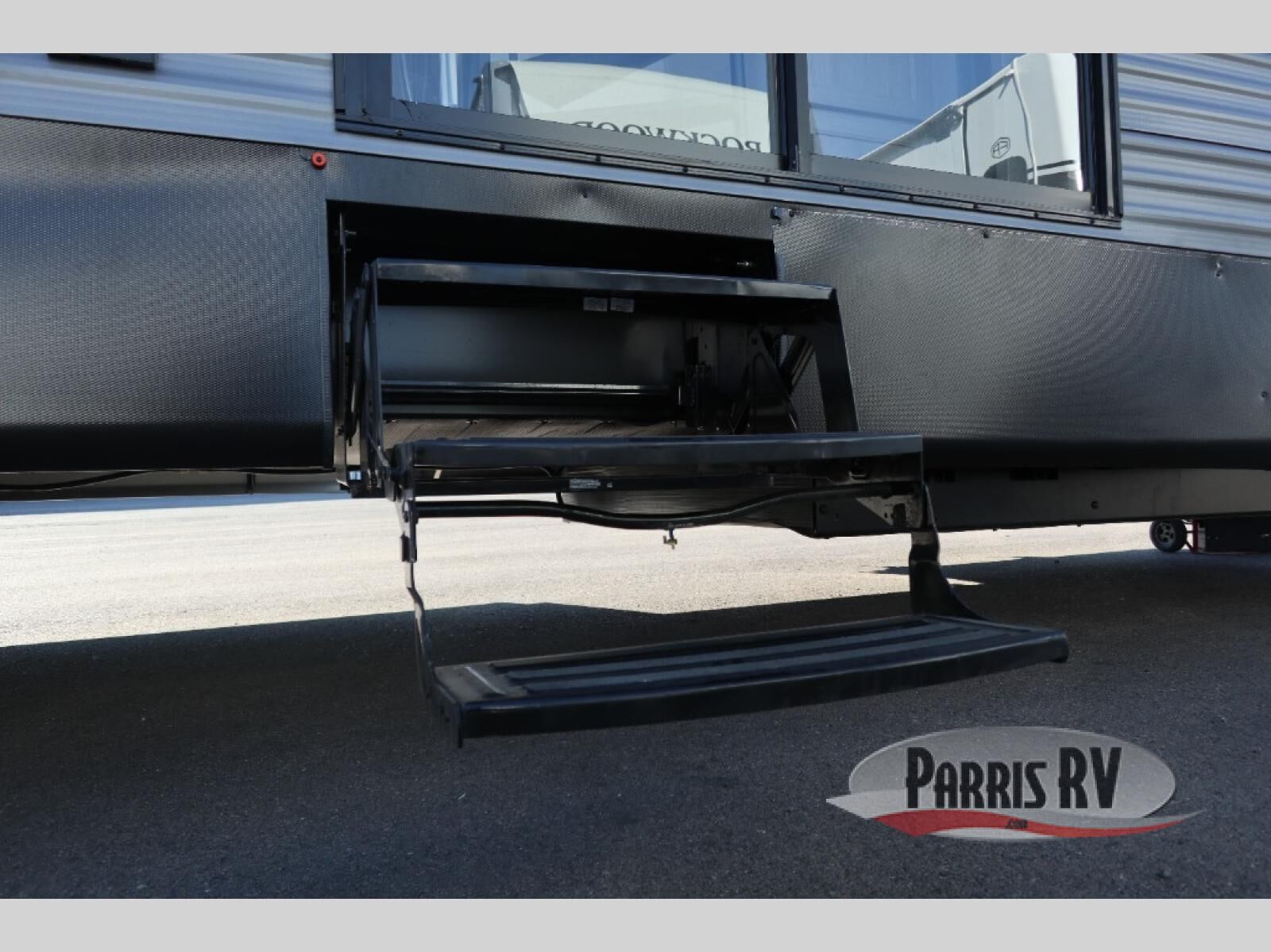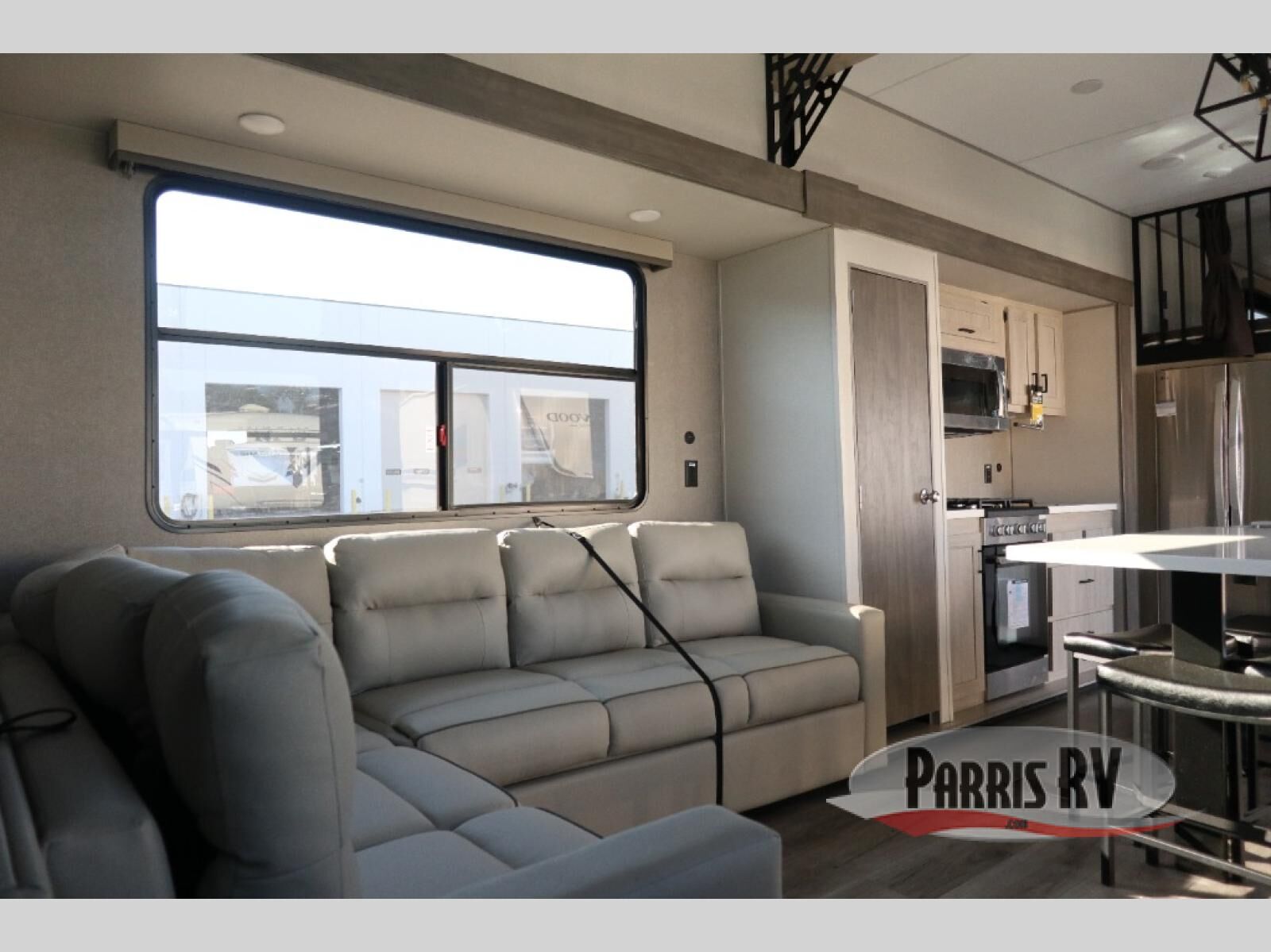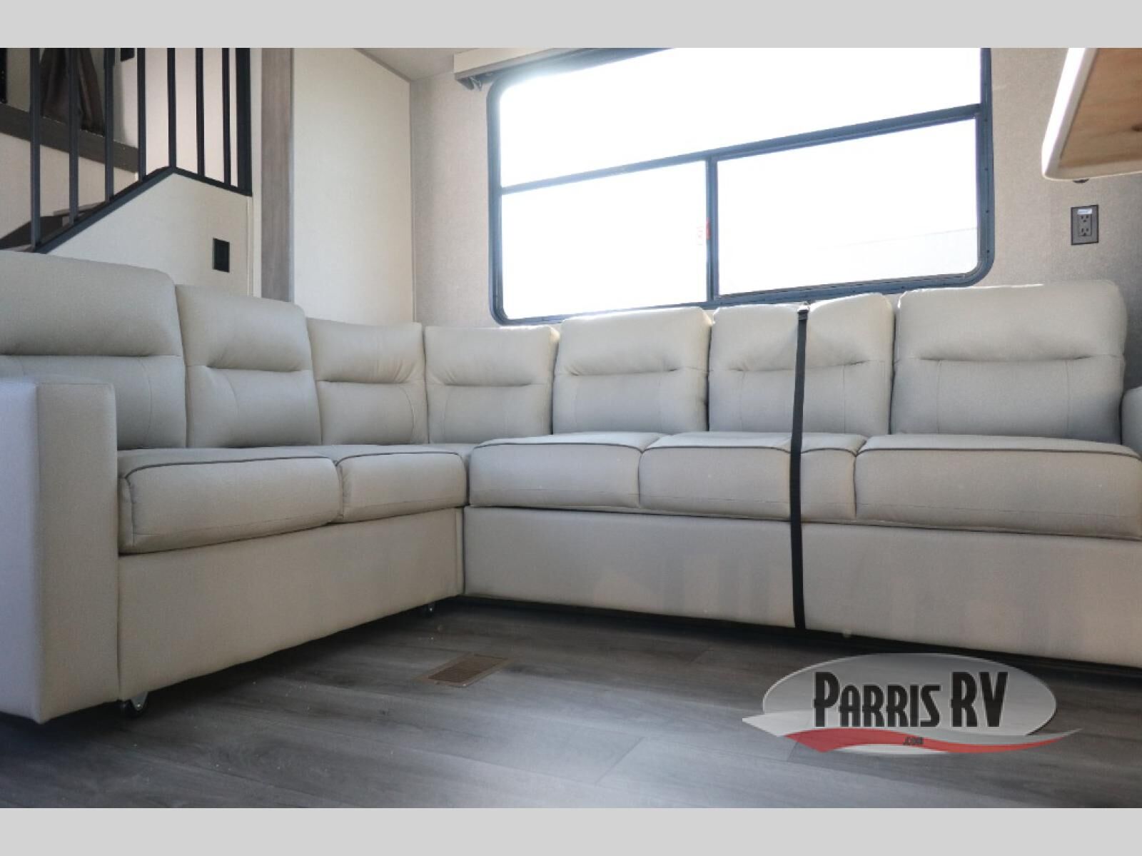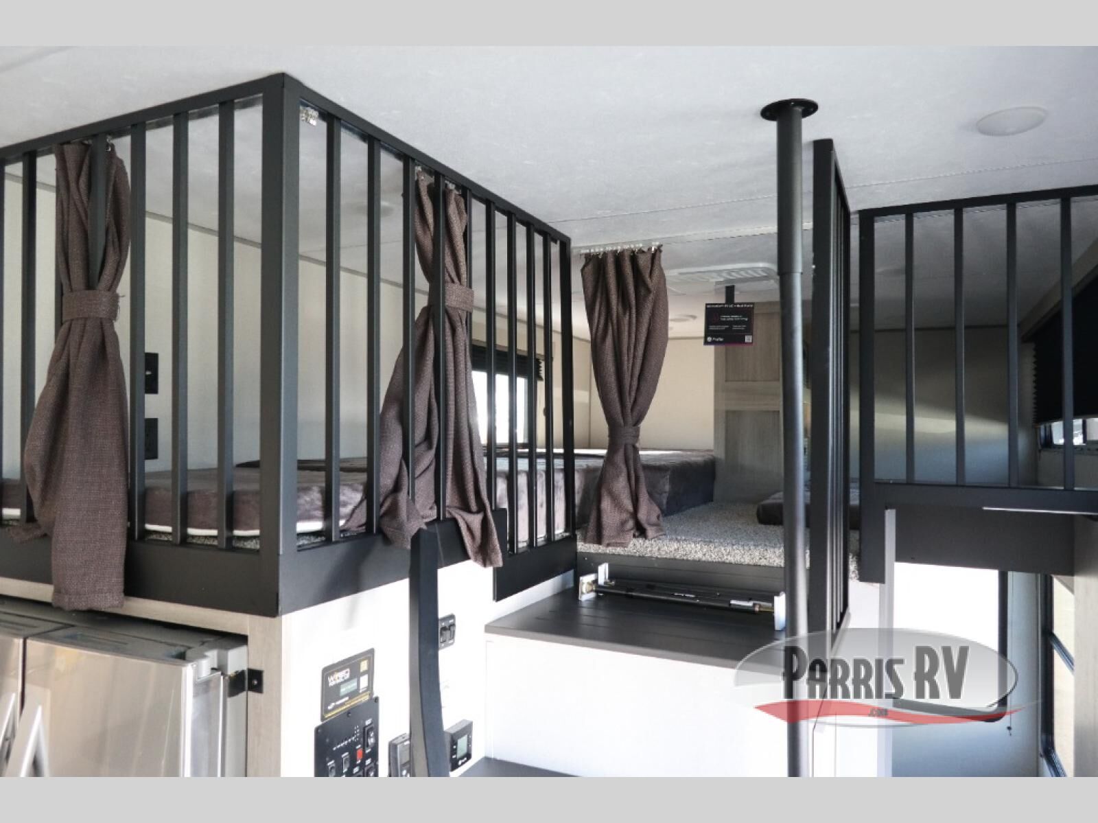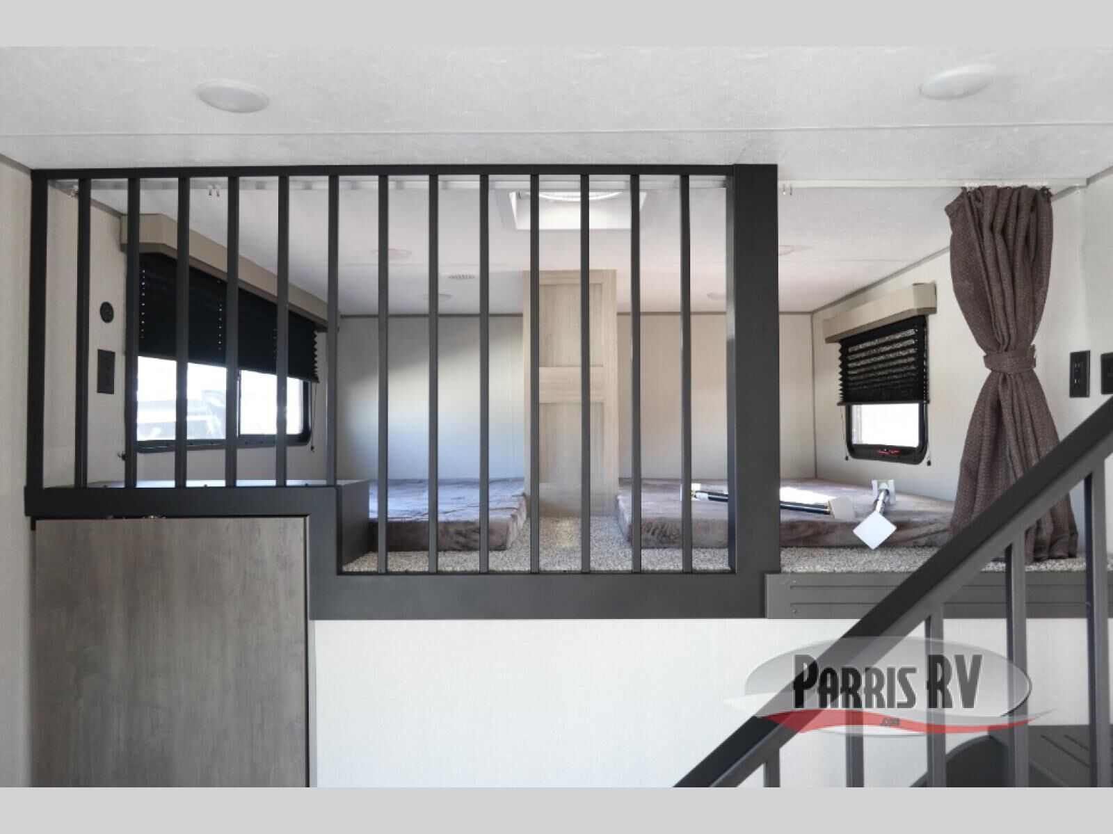 This unit with dual lofts and tons of sleeping space is ideal for a larger group! Lofts at either end of the unit overlook the living area and have a total of five bunk mats, with four 42" x 74" and one smaller 28" x 74". Downstairs there's a private bedroom with a queen bed and fireplace. The main living area has a huge hide-a-bed sectional sofa so you can fit even more guests, or just relax and watch the TV on the power lift in the entertainment center. The kitchen is well-equipped with a residential refrigerator, microwave, and pantry. The centerpiece here is a kitchen island with a deep basin farm-style sink and bar stool seating so your group can gather together and make new memories! The full bath in the rear has a roomy 48" x 30" shower with glass door, and a linen closet.