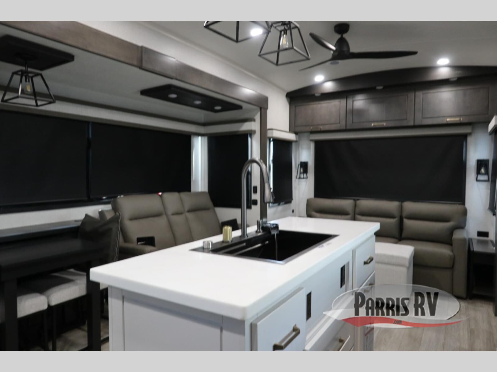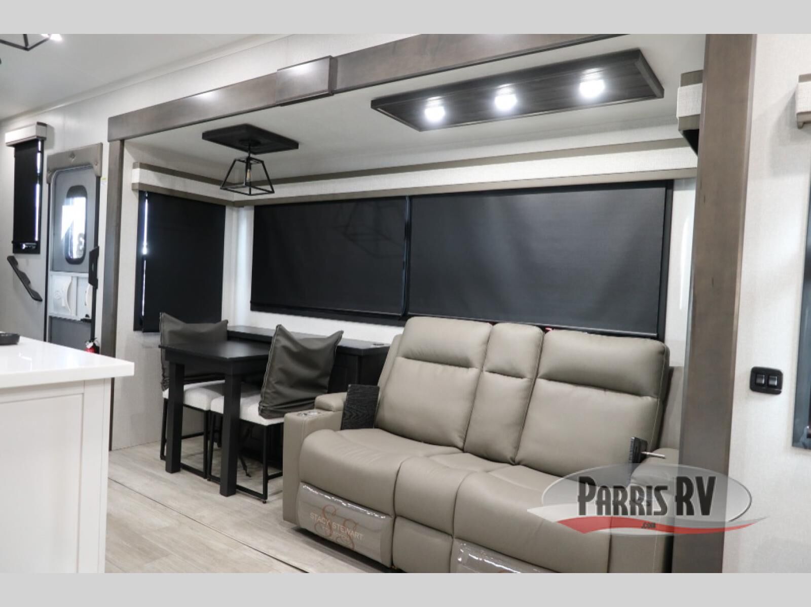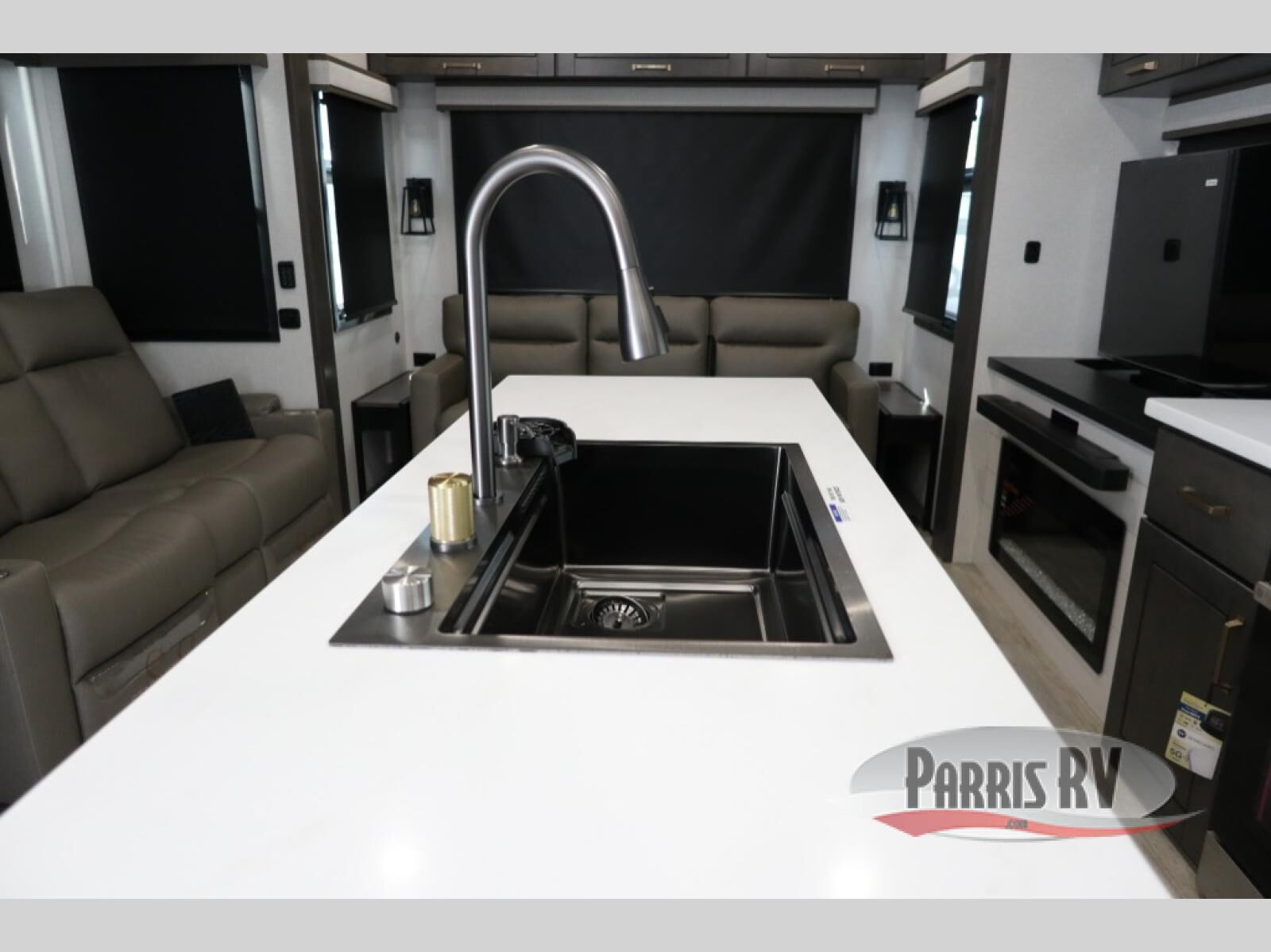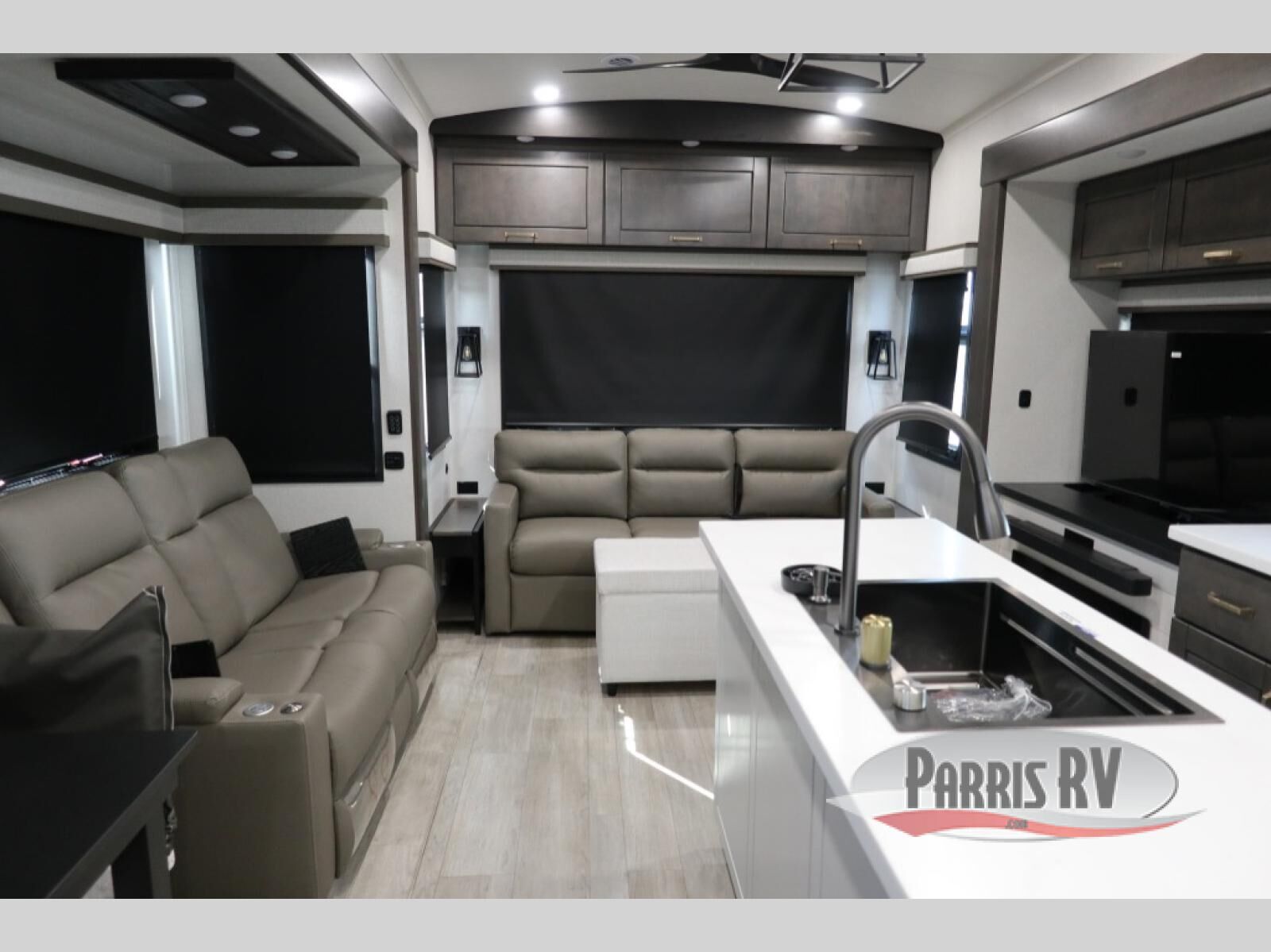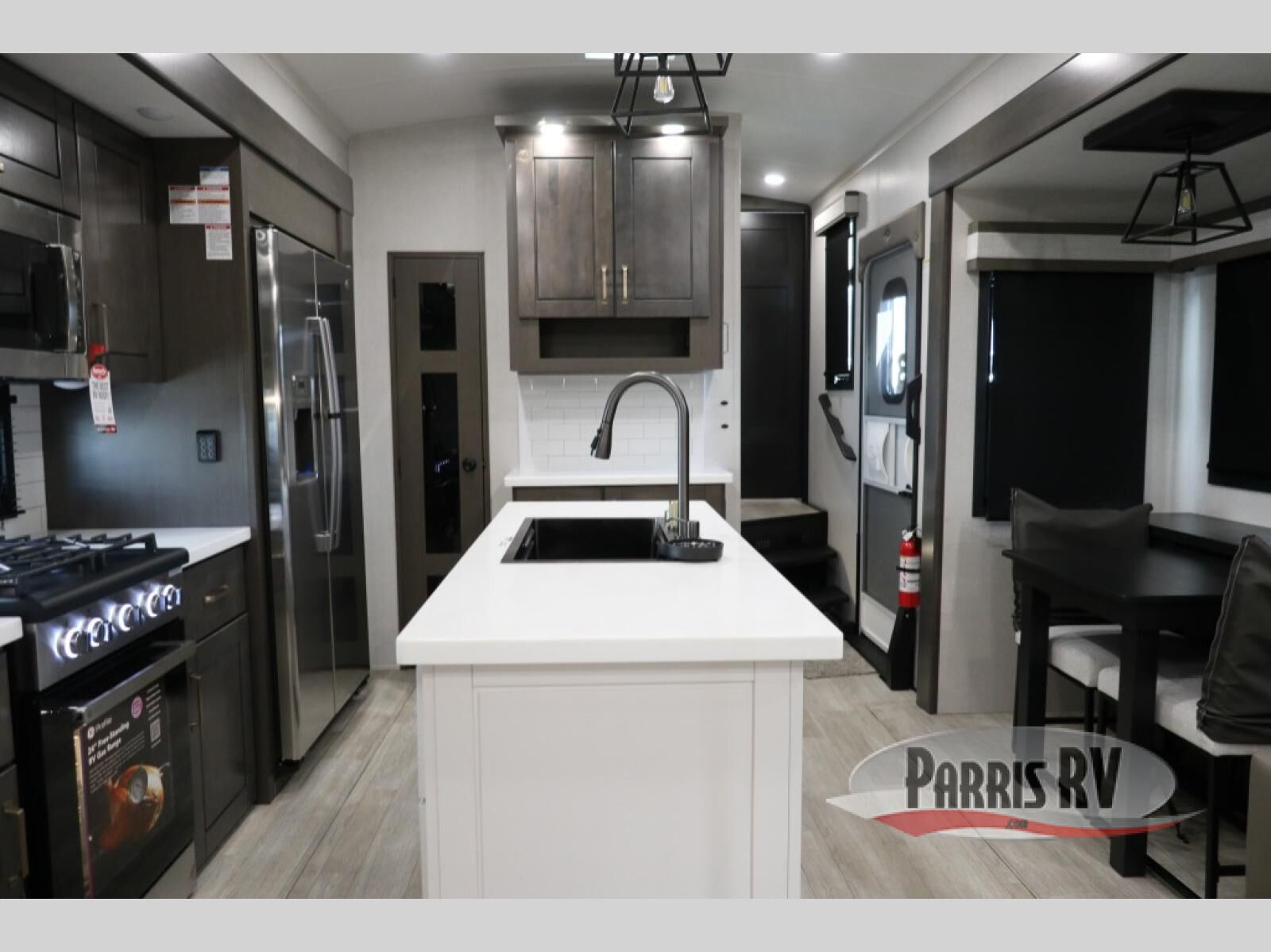 At the front of the unit, the spacious main bedroom offers a 72" x 80" king bed, providing ample room to relax and unwind. A wardrobe with drawers and a built-in hamper ensures plenty of organized storage for clothing and essentials, while a flip-up dresser across from the bed adds even more convenience. Moving down the hall, you'll find a full bathroom featuring a large 36" x 48" shower with a built-in seat for added comfort. Toward the rear, the main living area has dual opposing slides that open up the space for maximum comfort and functionality. One slide hosts the fully equipped kitchen, complete with overhead cabinets, a convection microwave with built-in air fryer, a 24" range, and a 21-cu. ft. residential refrigerator, everything you need to cook in comfort. The central kitchen island features a residential "Do-It-All" sink with a pull-out faucet, glass rinse, vegetable rinse, and a pull-out cutting board for easy meal prep, while the corner pantry provides generous storage. Opposite the kitchen, you can relax in the theater seating or enjoy meals at the roll-out table. At the rear, a 78" hide-a-bed sofa offers additional lounging space or converts into extra-sleeping accommodations when needed.