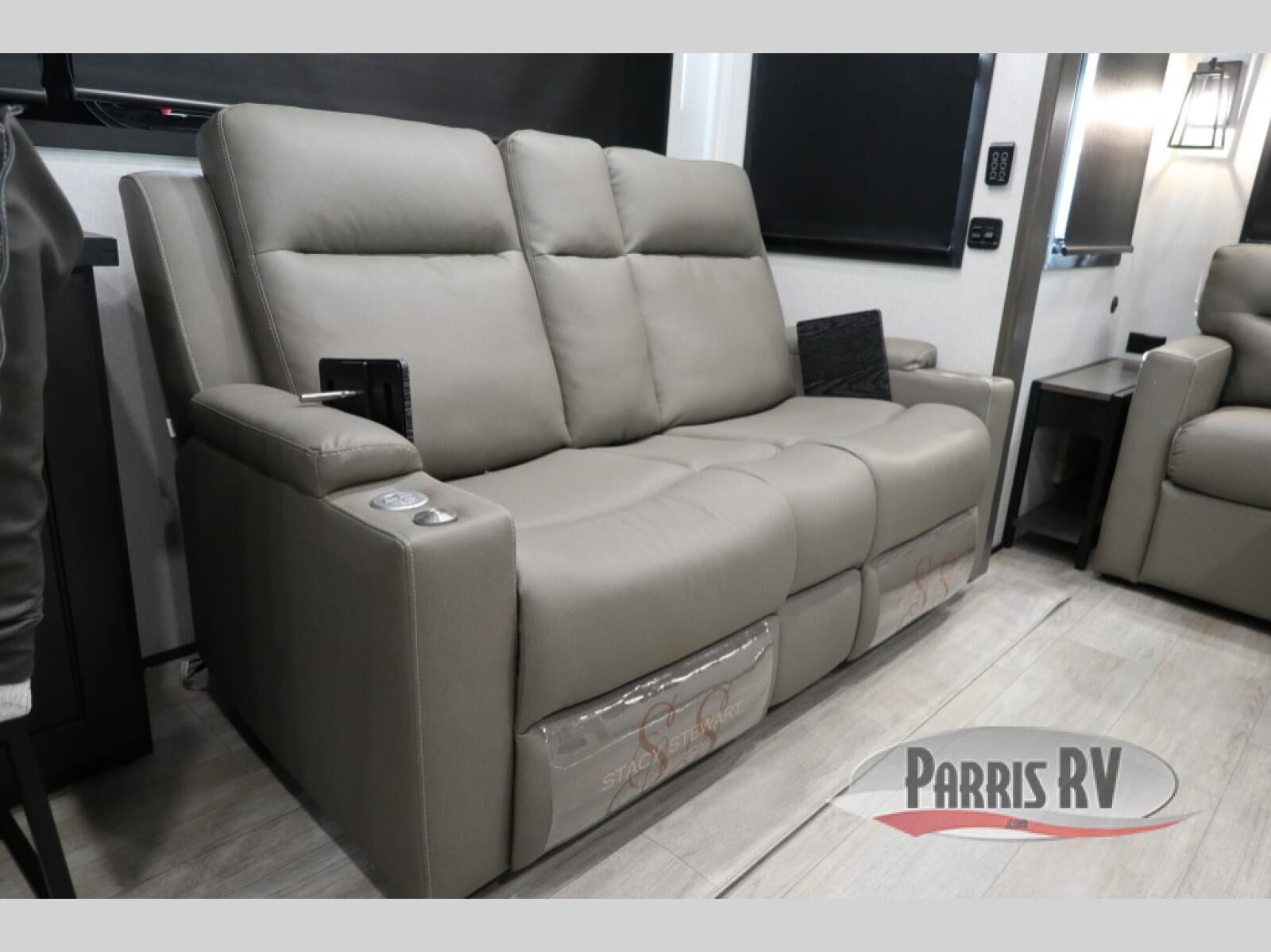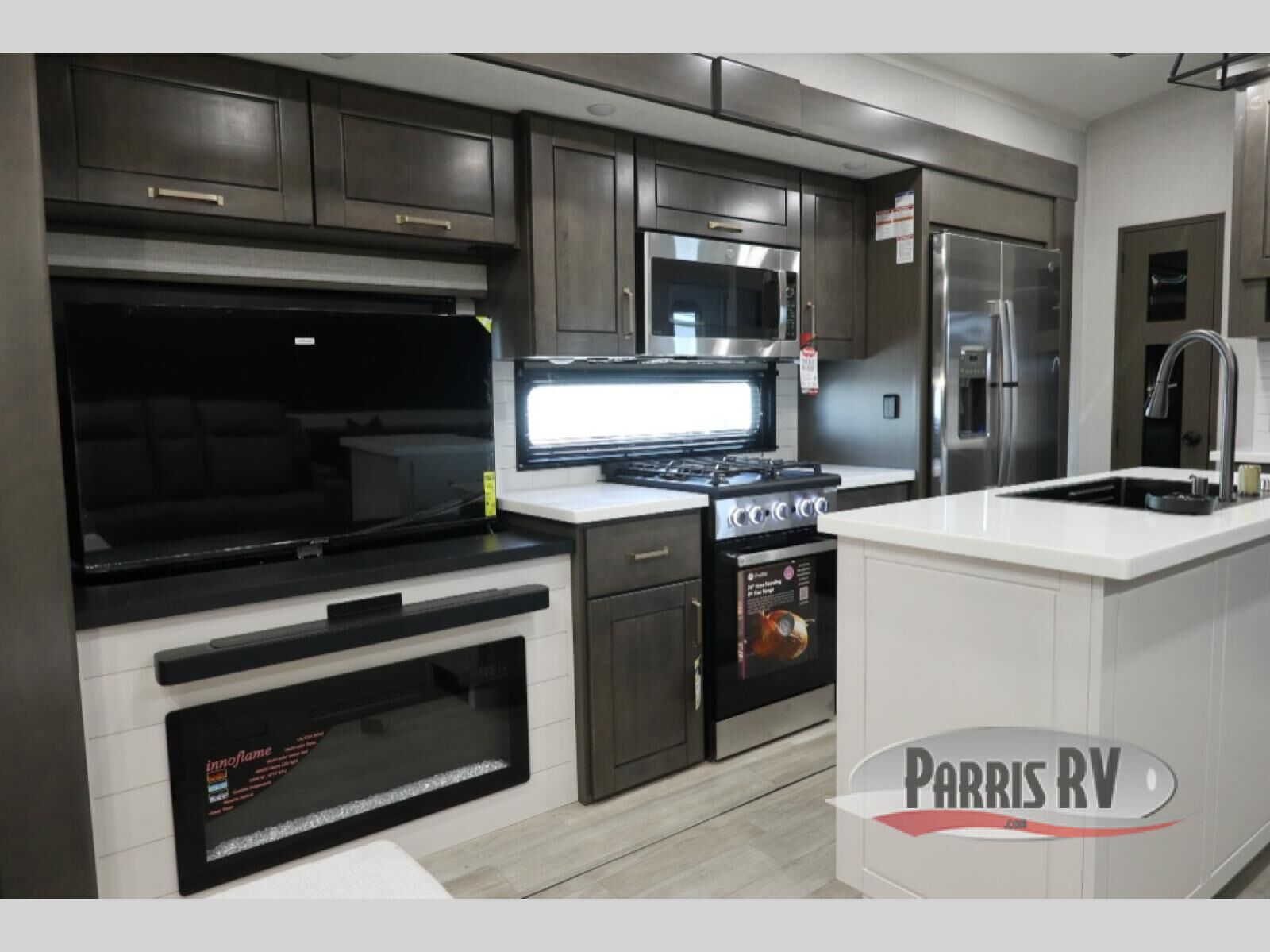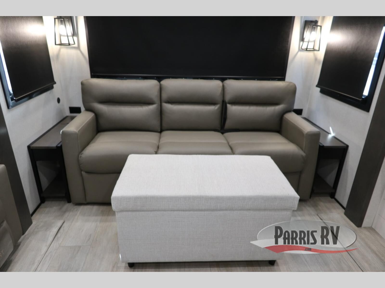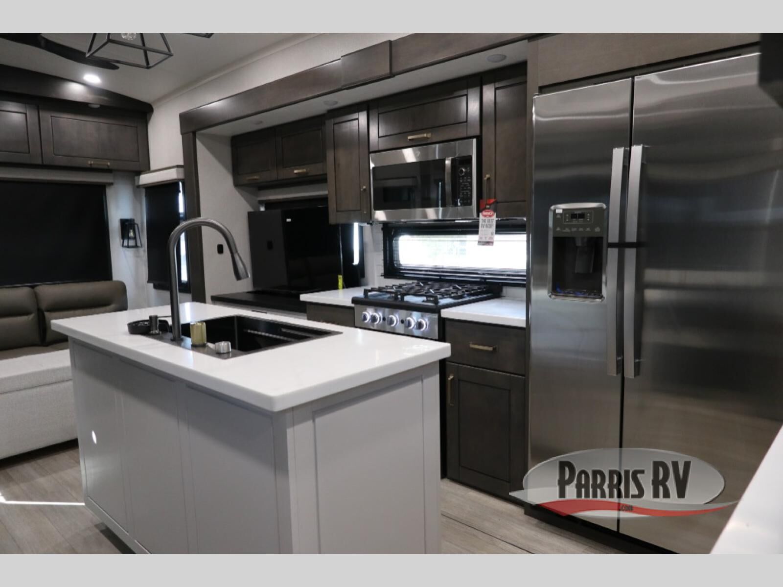 At the front of the unit, the spacious main bedroom offers a 72" x 80" king bed, providing ample room to relax and unwind. A wardrobe with drawers and a built-in hamper ensures plenty of organized storage for clothing and essentials, while a flip-up dresser across from the bed adds even more convenience. Moving down the hall, you'll find a full bathroom featuring a large 36" x 48" shower with a built-in seat for added comfort. Toward the rear, the main living area has dual opposing slides that open up the space for maximum comfort and functionality. One slide hosts the fully equipped kitchen, complete with overhead cabinets, a convection microwave with built-in air fryer, a 24" range, and a 21-cu. ft. residential refrigerator, everything you need to cook in comfort. The central kitchen island features a residential "Do-It-All" sink with a pull-out faucet, glass rinse, vegetable rinse, and a pull-out cutting board for easy meal prep, while the corner pantry provides generous storage. Opposite the kitchen, you can relax in the theater seating or enjoy meals at the roll-out table. At the rear, a 78" hide-a-bed sofa offers additional lounging space or converts into extra-sleeping accommodations when needed.