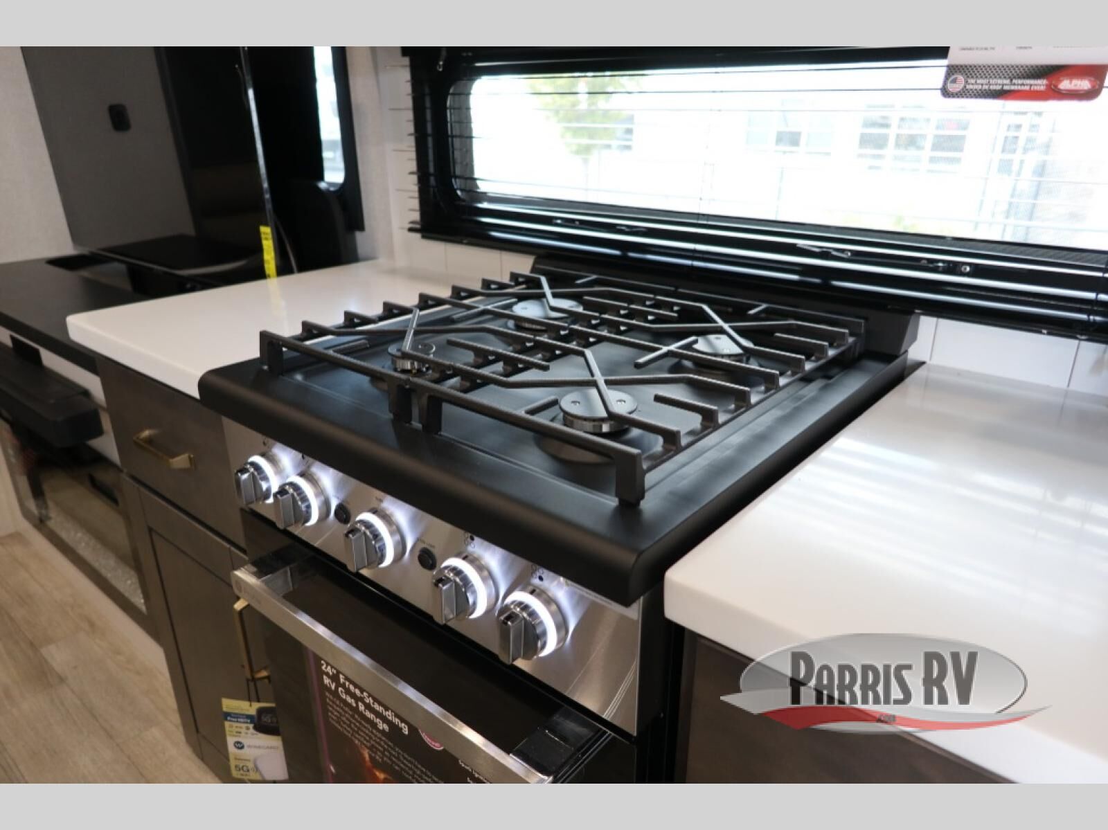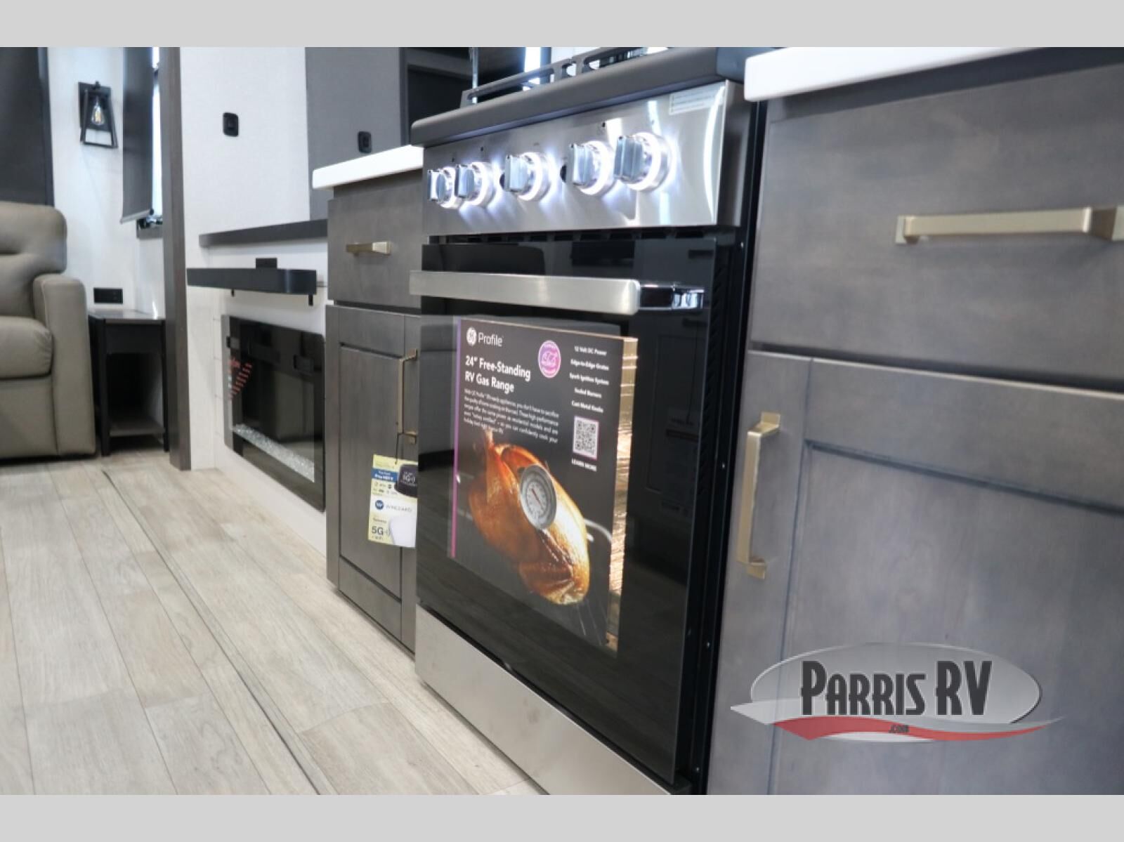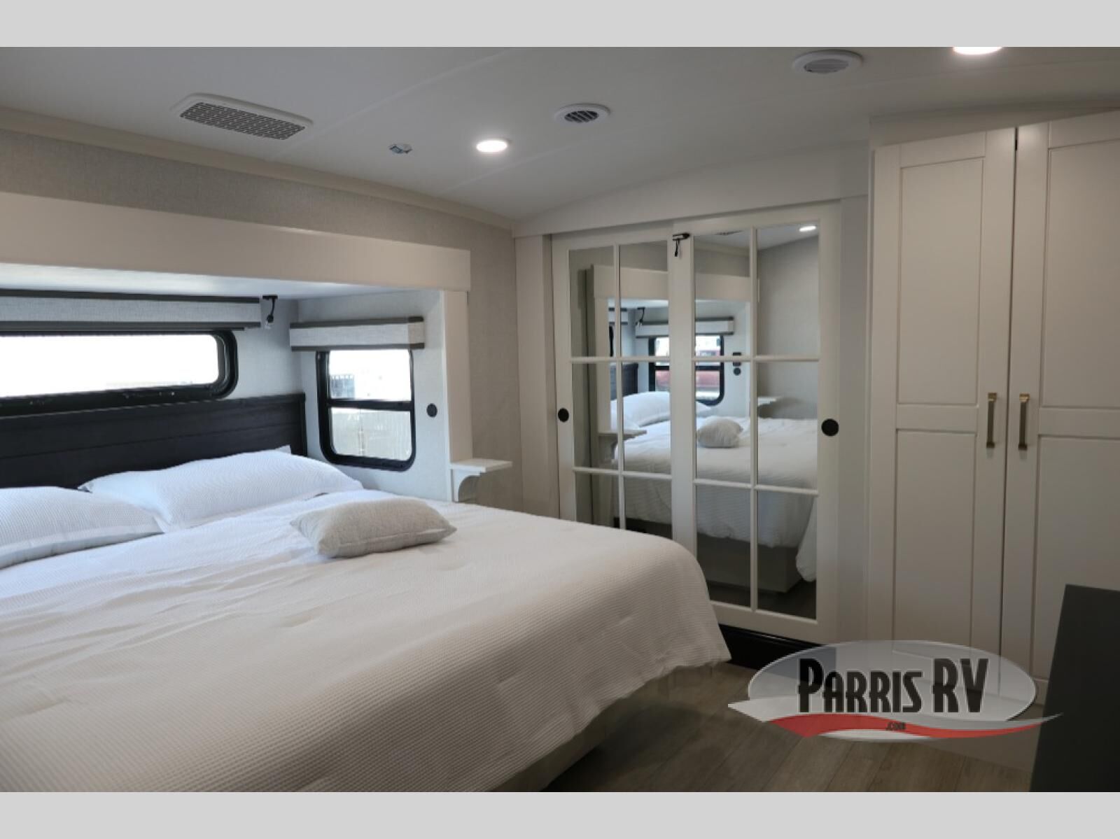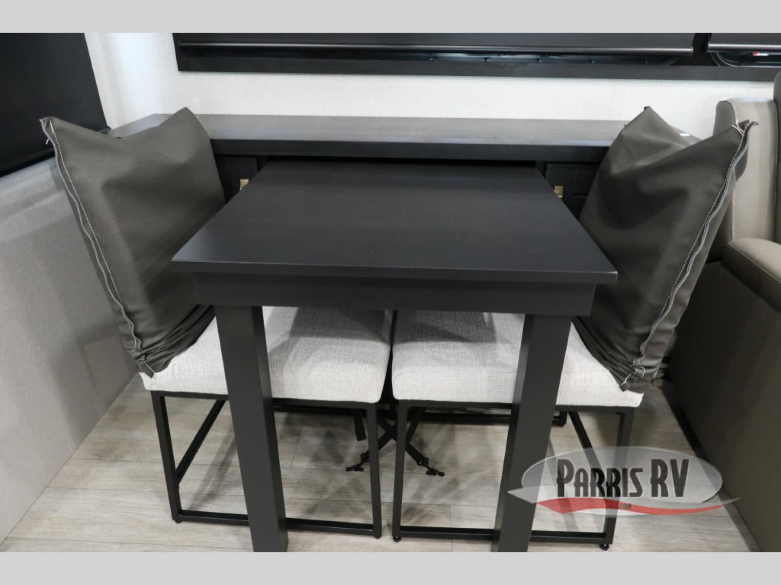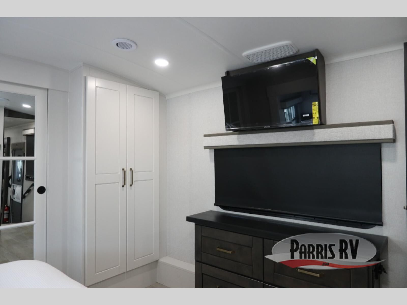 At the front of the unit, the spacious main bedroom offers a 72" x 80" king bed, providing ample room to relax and unwind. A wardrobe with drawers and a built-in hamper ensures plenty of organized storage for clothing and essentials, while a flip-up dresser across from the bed adds even more convenience. Moving down the hall, you'll find a full bathroom featuring a large 36" x 48" shower with a built-in seat for added comfort. Toward the rear, the main living area has dual opposing slides that open up the space for maximum comfort and functionality. One slide hosts the fully equipped kitchen, complete with overhead cabinets, a convection microwave with built-in air fryer, a 24" range, and a 21-cu. ft. residential refrigerator, everything you need to cook in comfort. The central kitchen island features a residential "Do-It-All" sink with a pull-out faucet, glass rinse, vegetable rinse, and a pull-out cutting board for easy meal prep, while the corner pantry provides generous storage. Opposite the kitchen, you can relax in the theater seating or enjoy meals at the roll-out table. At the rear, a 78" hide-a-bed sofa offers additional lounging space or converts into extra-sleeping accommodations when needed.