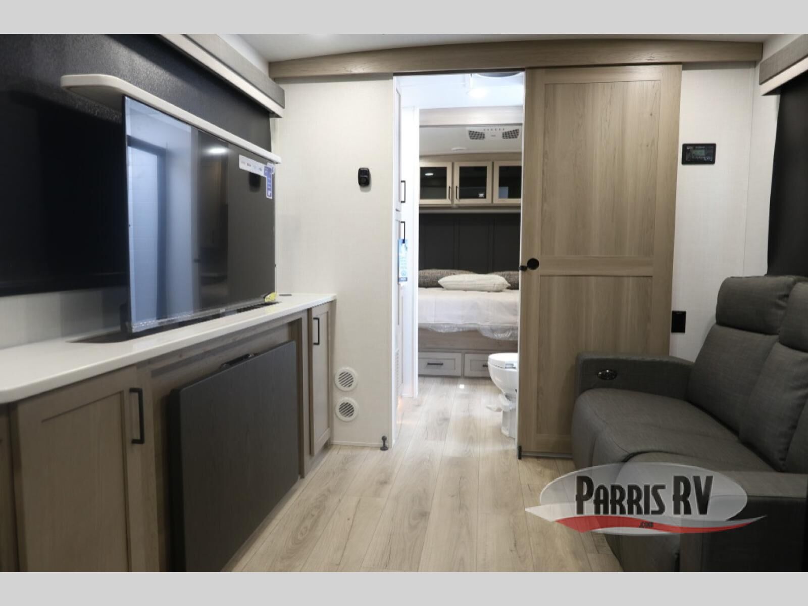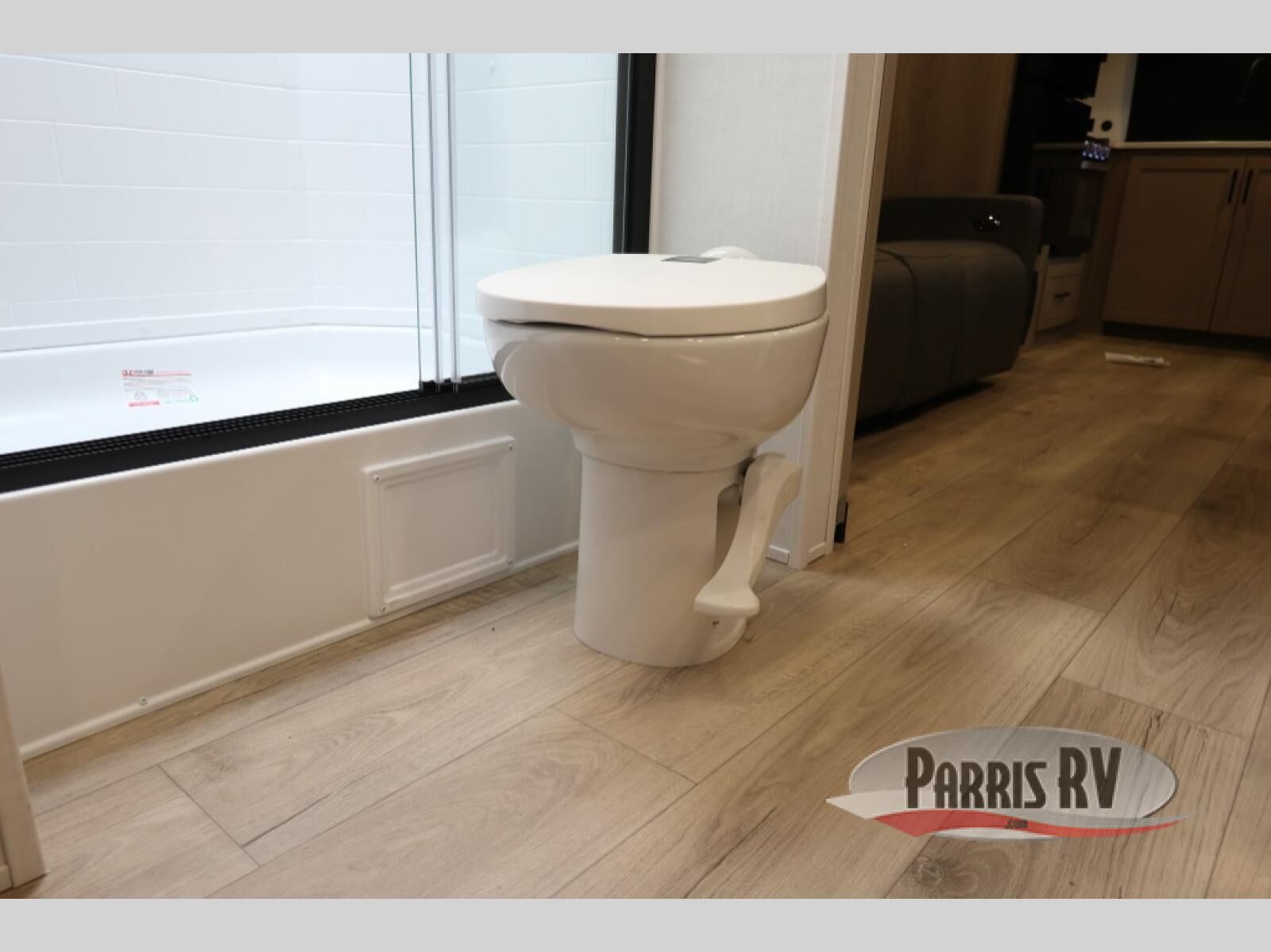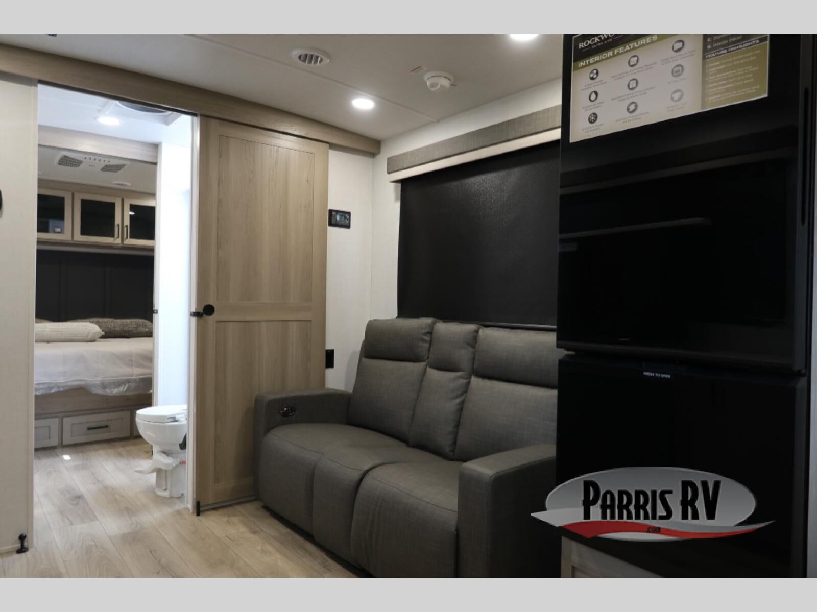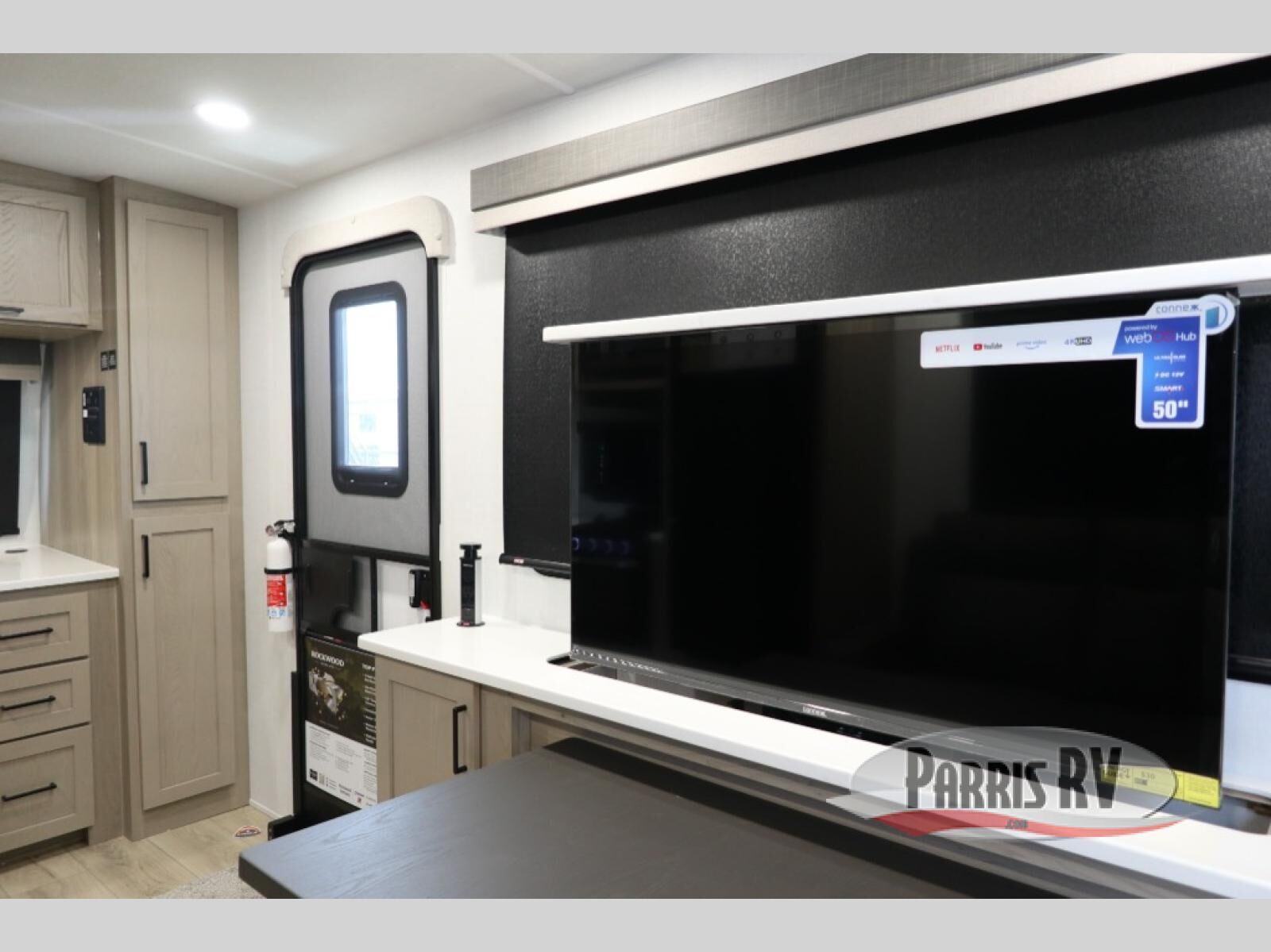 This Rockwood Ultra Lite 301FKT is fit for a cook! As soon as you step inside, you're greeted by the spacious front kitchen. Designed for convenience and style, it has long solid surface countertops that provide ample space for meal prep and organizing utensils. The overhead cabinets offer plenty of room to store dishes and ingredients for all your favorite recipes. After cooking, you can unwind on the 67" theater seat facing a TV with a lift, perfect for movie nights or catching up on your favorite shows. For meals, enjoy dining at the flip-up table with folding chairs, ideal for sharing breakfast, lunch, or dinner with your partner. And when it's time to relax, a full bathroom leads to the rear bedroom, where a king-sized bed awaits to give you a restful night's sleep.