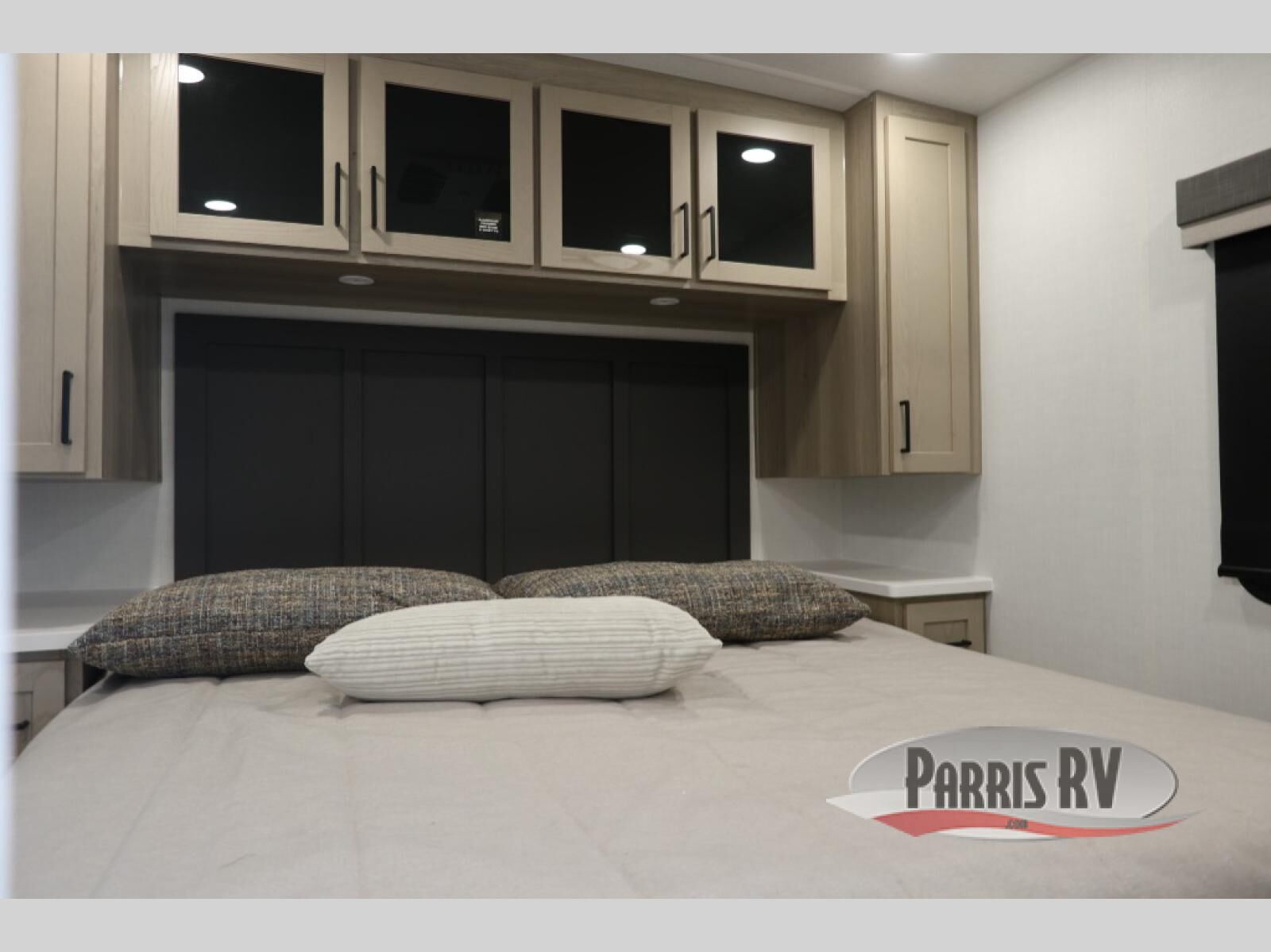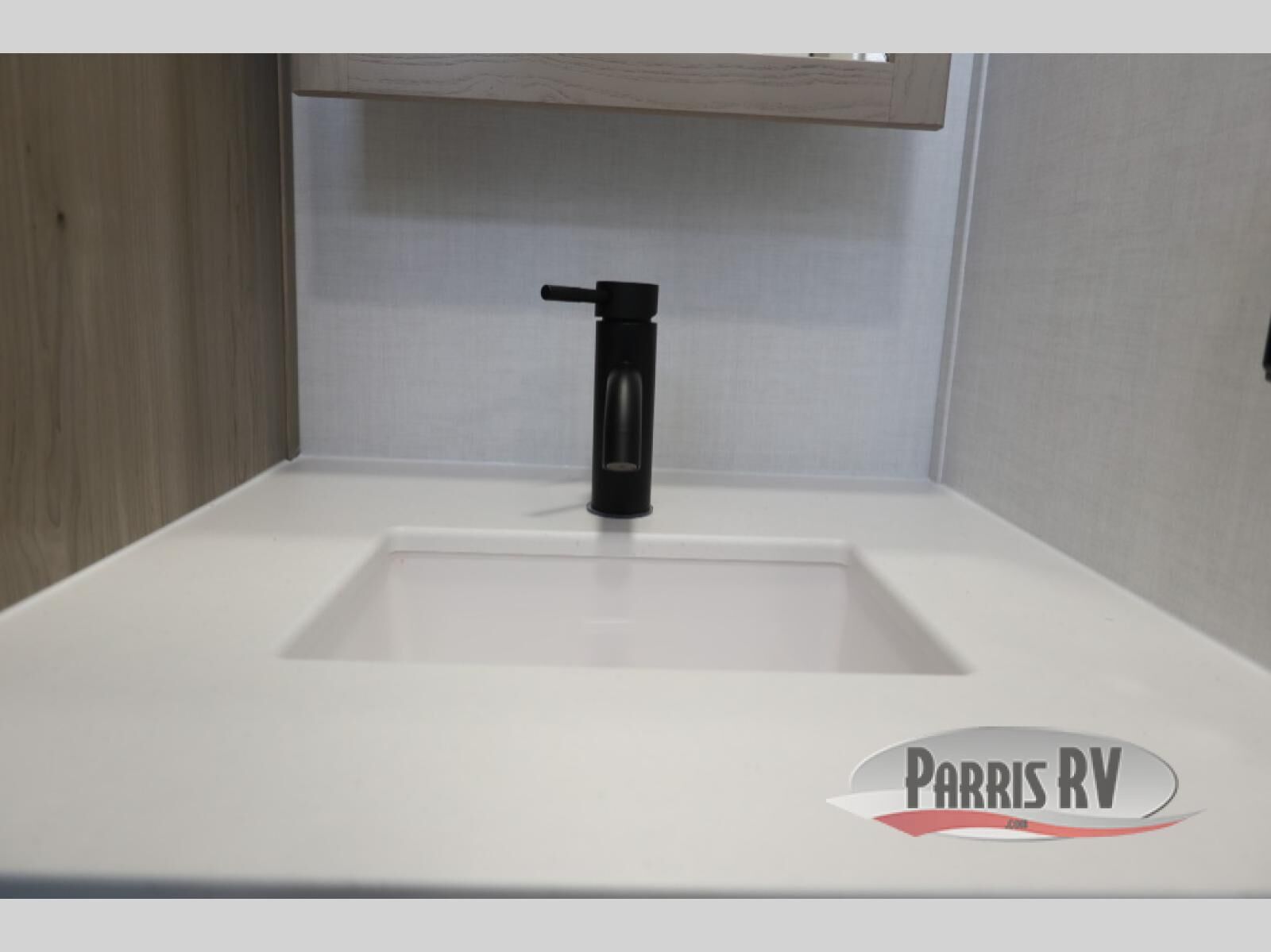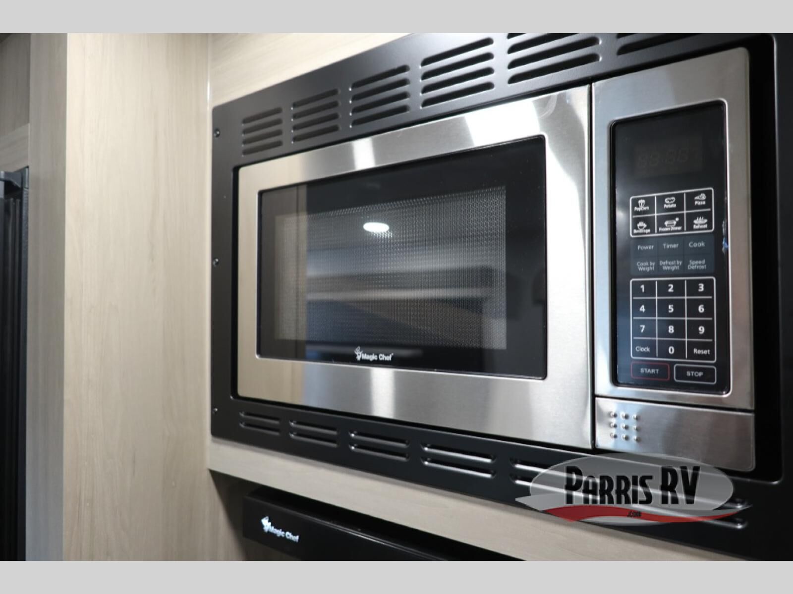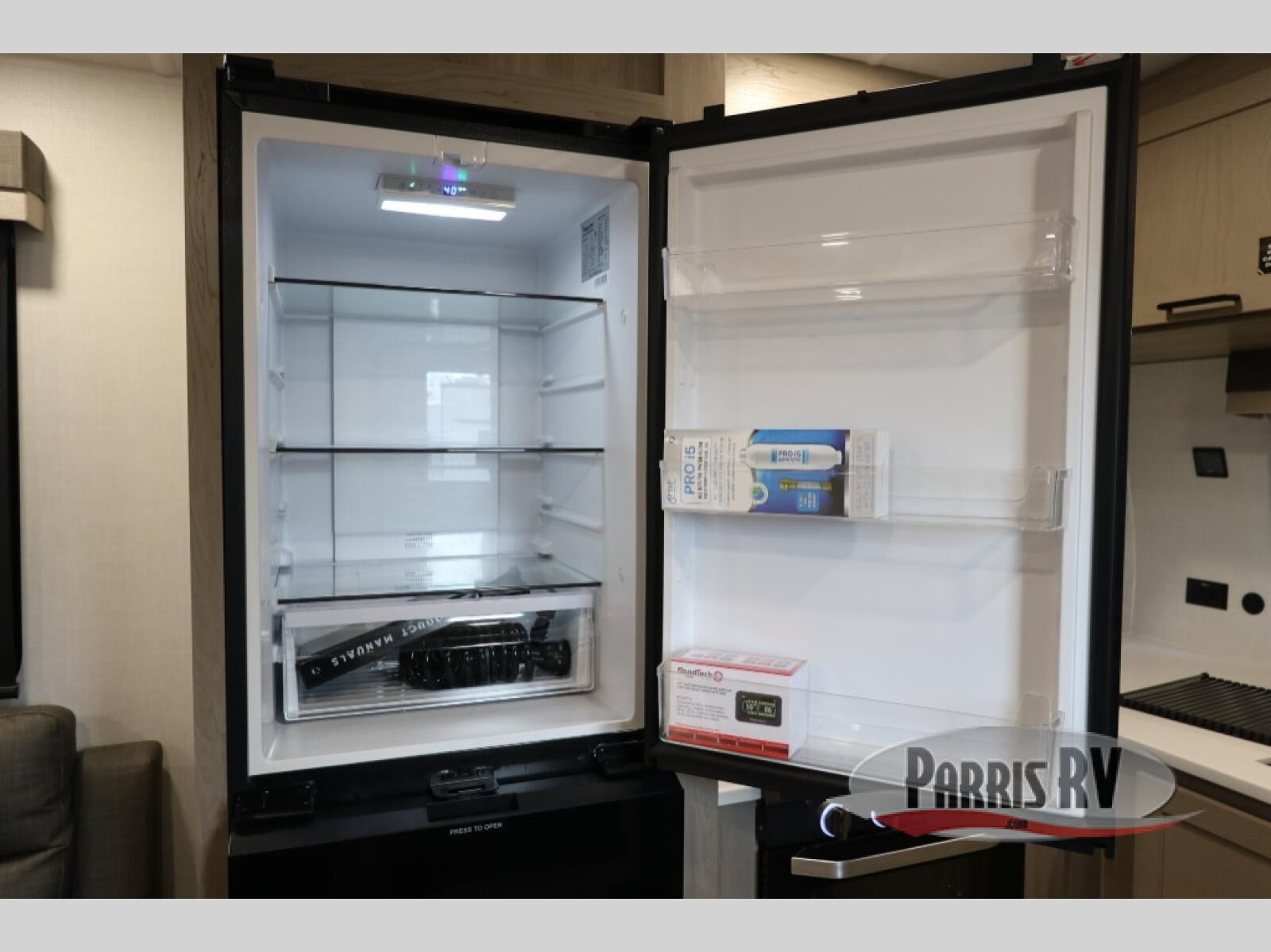 This Rockwood Ultra Lite 301FKT is fit for a cook! As soon as you step inside, you're greeted by the spacious front kitchen. Designed for convenience and style, it has long solid surface countertops that provide ample space for meal prep and organizing utensils. The overhead cabinets offer plenty of room to store dishes and ingredients for all your favorite recipes. After cooking, you can unwind on the 67" theater seat facing a TV with a lift, perfect for movie nights or catching up on your favorite shows. For meals, enjoy dining at the flip-up table with folding chairs, ideal for sharing breakfast, lunch, or dinner with your partner. And when it's time to relax, a full bathroom leads to the rear bedroom, where a king-sized bed awaits to give you a restful night's sleep.
