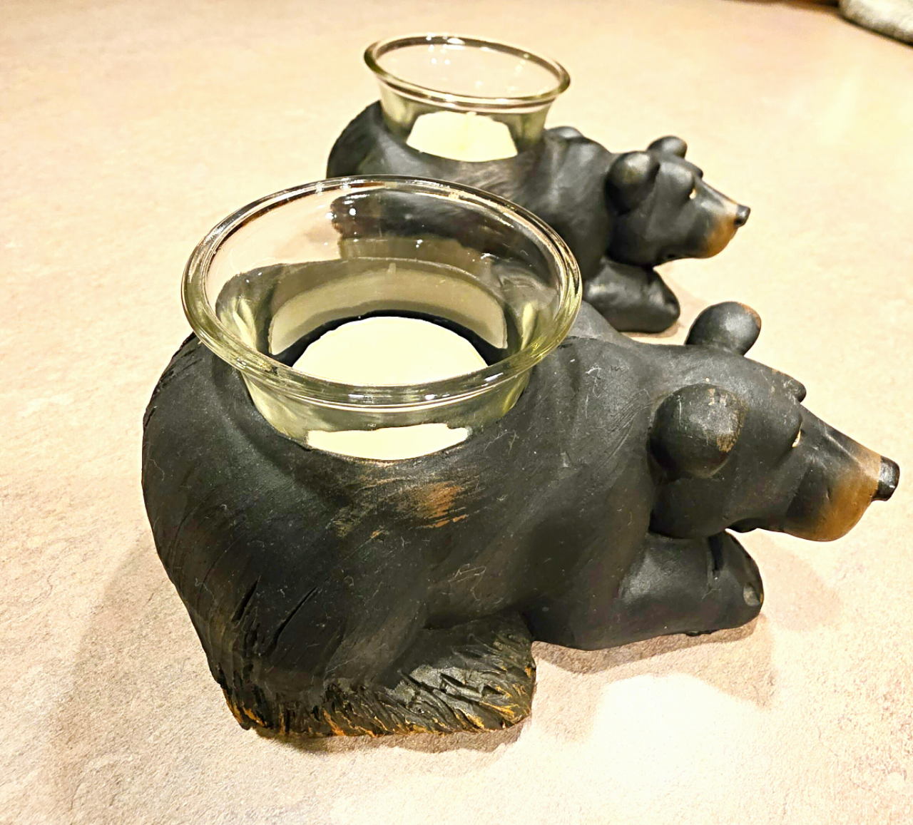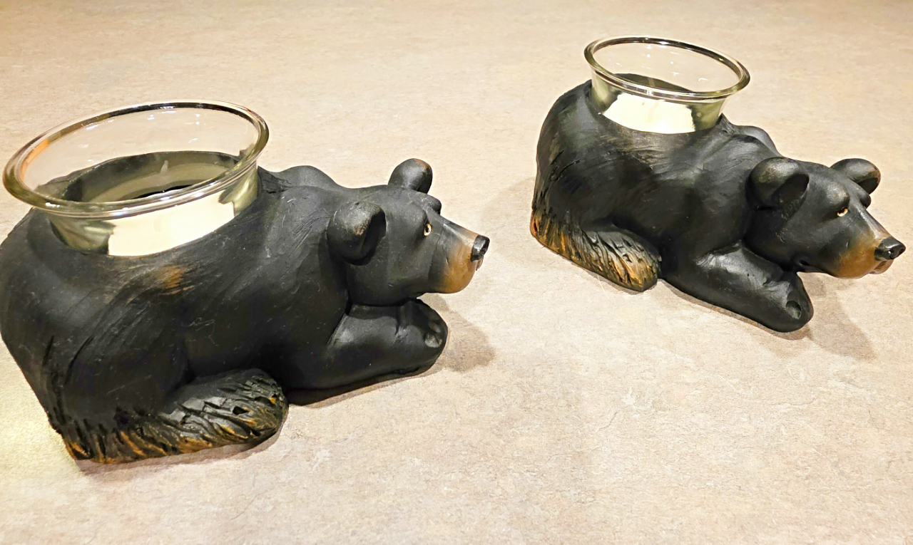 These cute little bear candle holders never got to be used. They are approx. 5.5 Inches long and 3" high. They hold the little metal ring candles that you can buy in bulk everywhere. Im trying to make room so letting them go for half price. CASH only.. Firm on price.