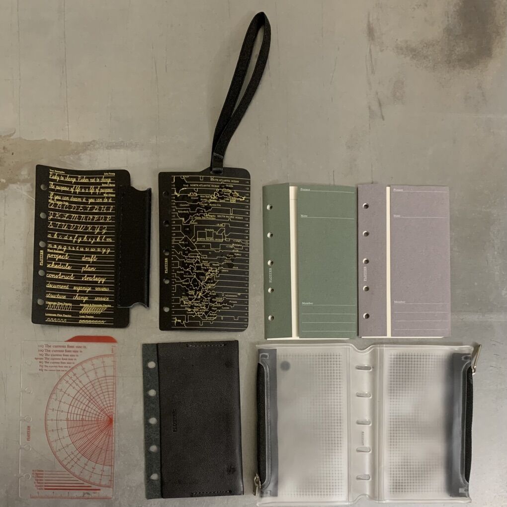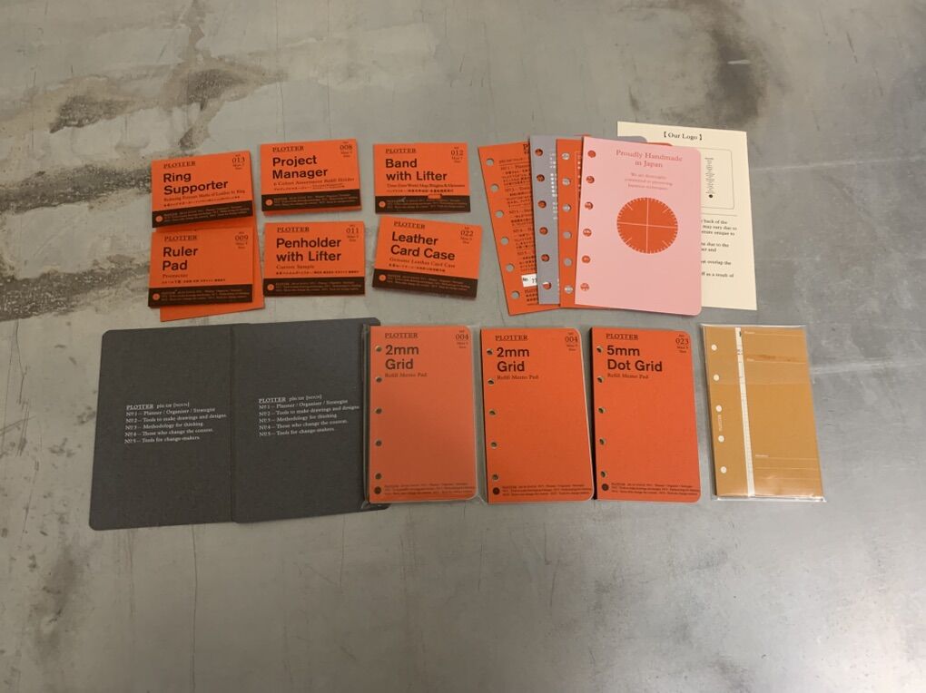 It comes with the leather 1 pocket card case, ring supporter, band with lifter, pen holder with lifter, ruler pad, project managers (folder/separators), (2) 2mm Grid Refills (1 opened), (1) 5mm Dot Grid Refill and the fastener transparent zipper case.