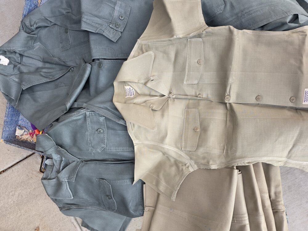 • 12 Tan USAF “Shirt, Cotton, Tropical” — Short Sleeve — Authentic 1950s issue, most with original contract labels (MIL-S-4956 / Cecil Pool Mfg. / BenDome Mfg.) • 5 Matching Tan Cotton Trousers — Same era and fabric • 3 Sage Green Long-Sleeve Utility Jackets — Likely Shade 509 / M-1949 or M-1951 style (tags faint or worn) • 3 Matching Sage Green Utility Pants — Same era and cut as jackets