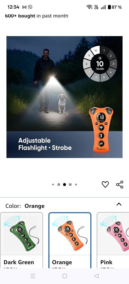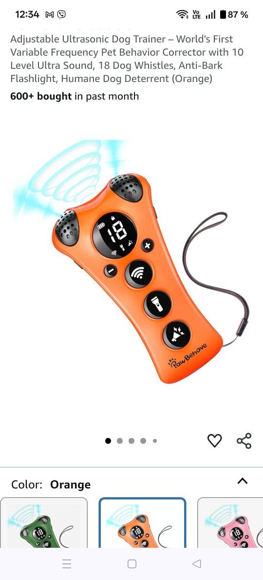 Adjustable Ultrasonic Dog Trainer – World's First Variable Frequency Pet Behavior Corrector with 10 Level Ultra Sound, 18 Dog Whistles, Anti-Bark Flashlight, Humane Dog Deterrent (Orange), New. Please only text