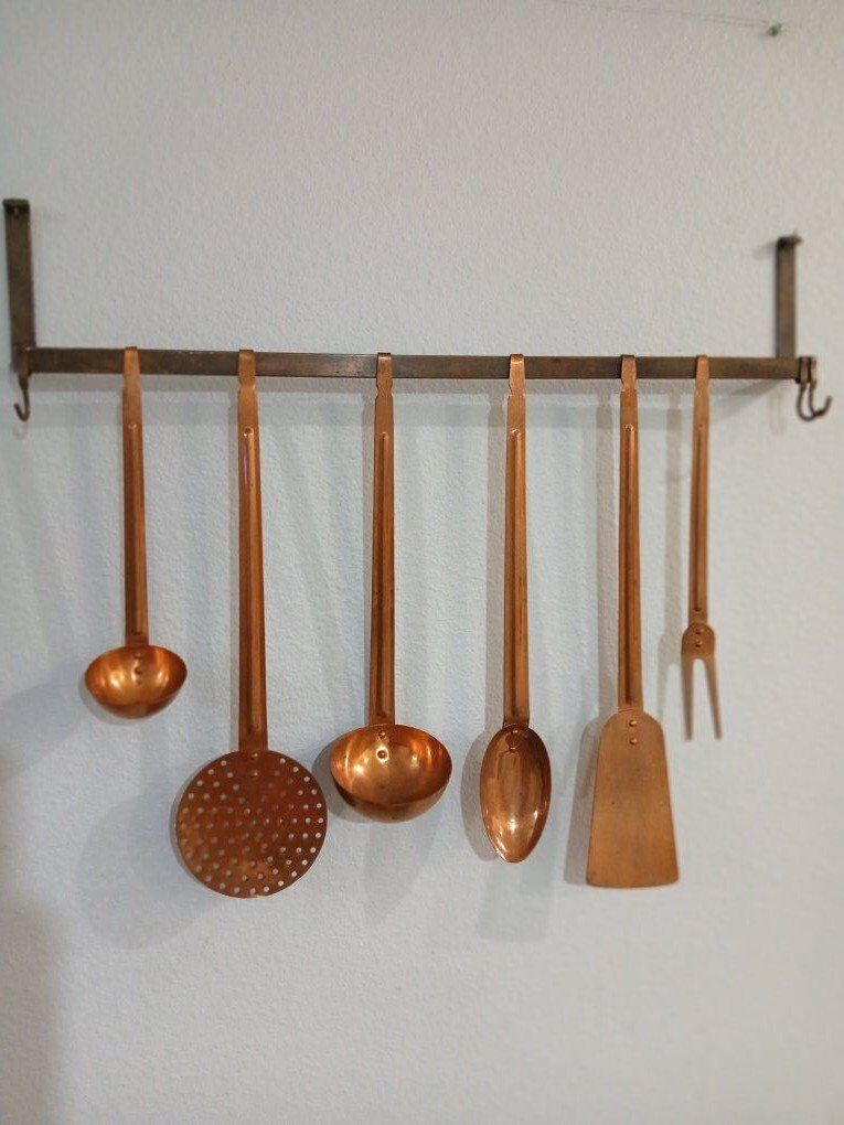 Vintage ODI Copper wall hanging utensils set ranging from about 9 inches to 15 1/2 inches. wall hanging bar not included.