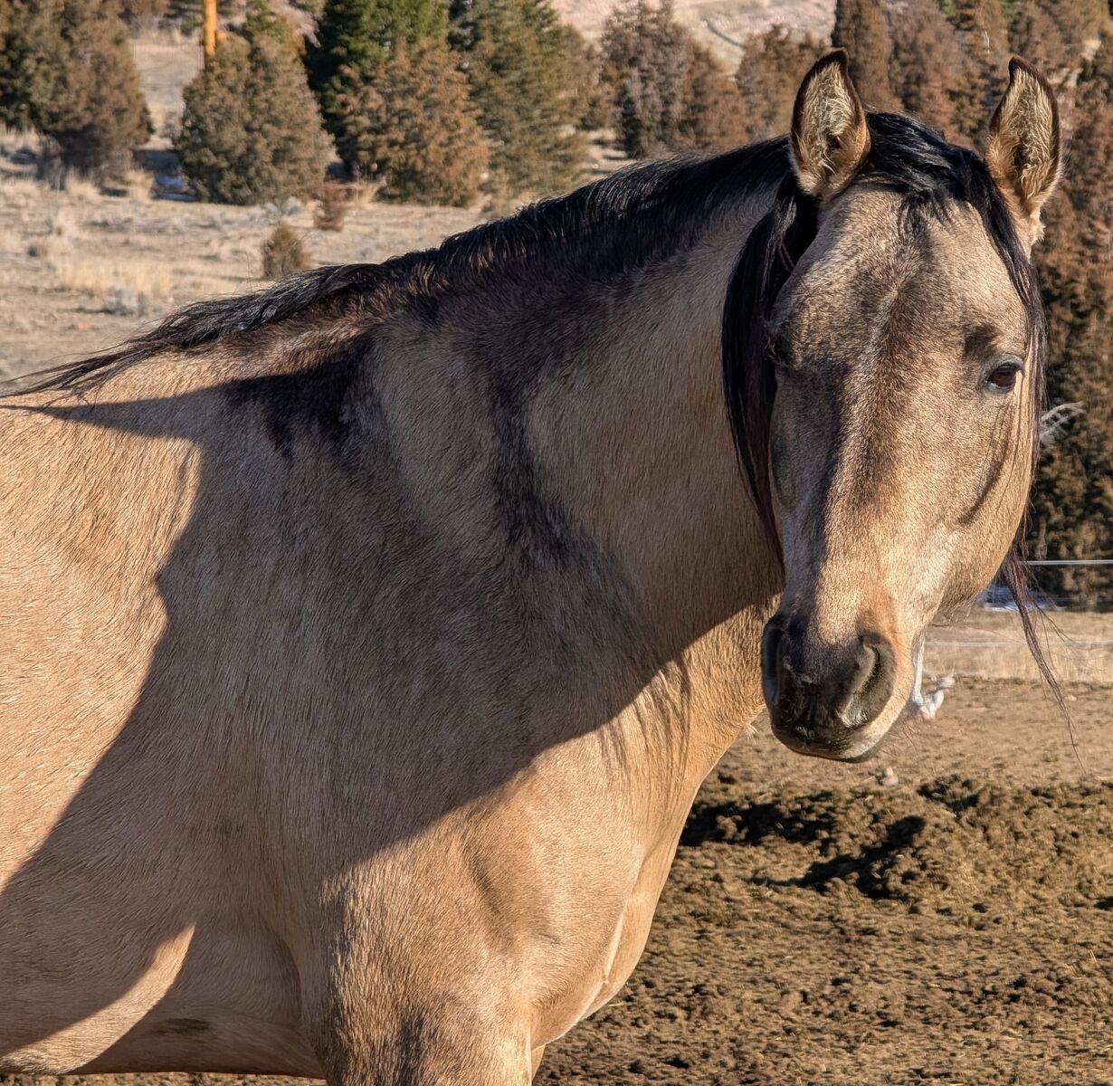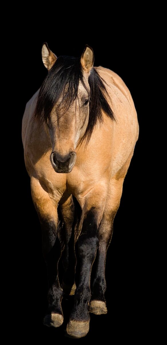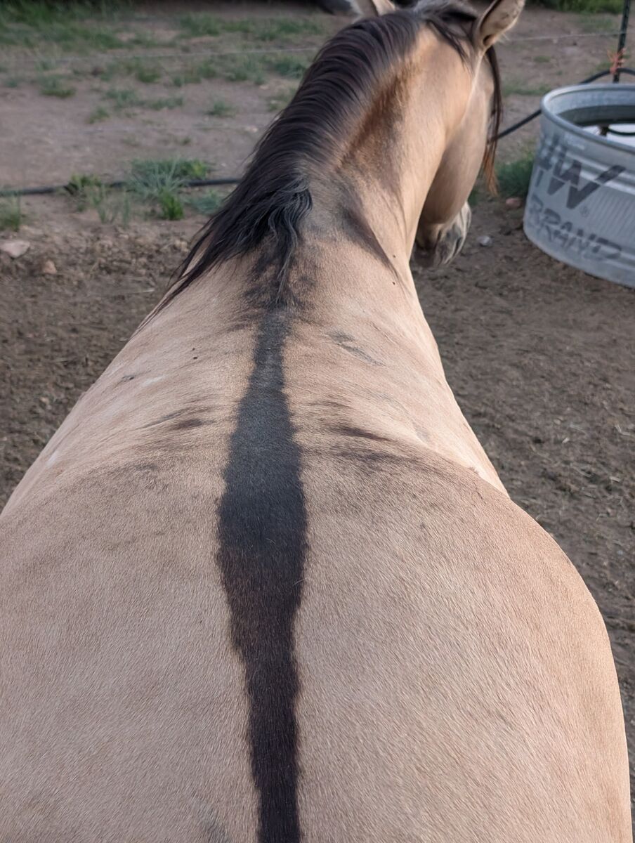 Luey is a buttermilk buckskin dun or better known as a Dunskin, which means he carries a cream gene and dun gene. His "dun factor" is quite significant with barring on the legs, defined back stripe dripping off his neck and spots along his top line.