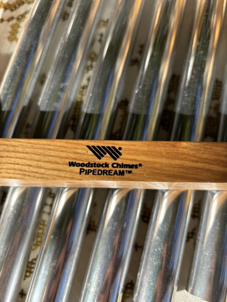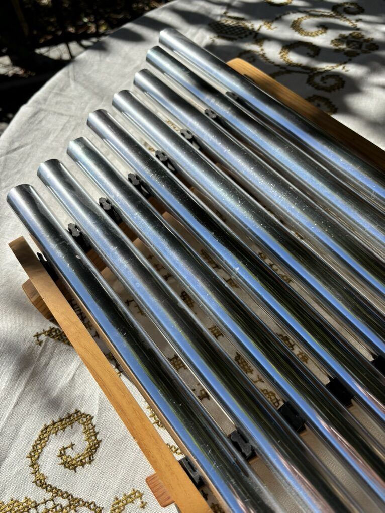 Slightly used bar chimes percussion instrument. Wooden base. Sounds like wind chimes when played. 8 metal tubes. 20” L x 11.5” W