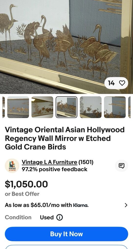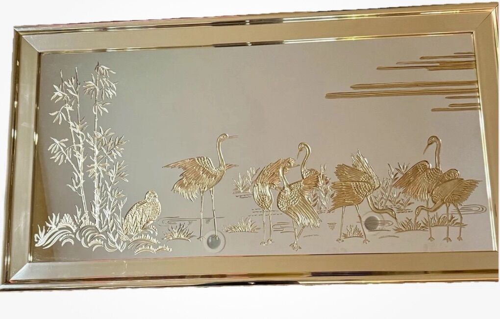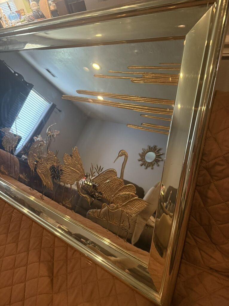 Vintage Hollywood Regency Wall Mirror w Etched Gold Crane Birds 29” tall 53” long