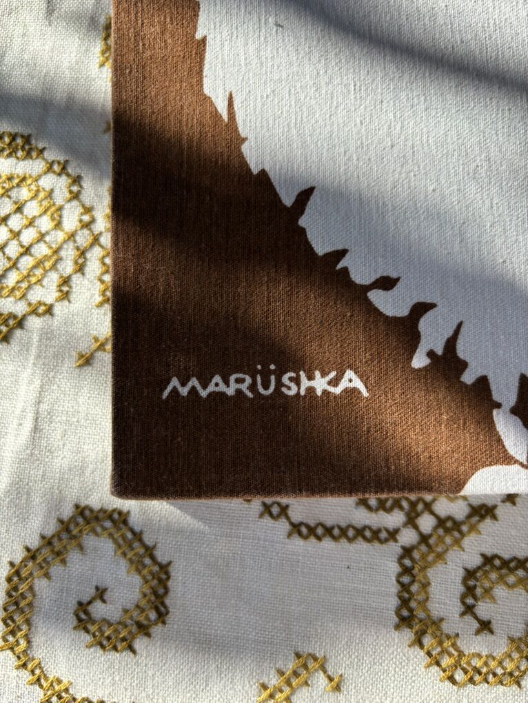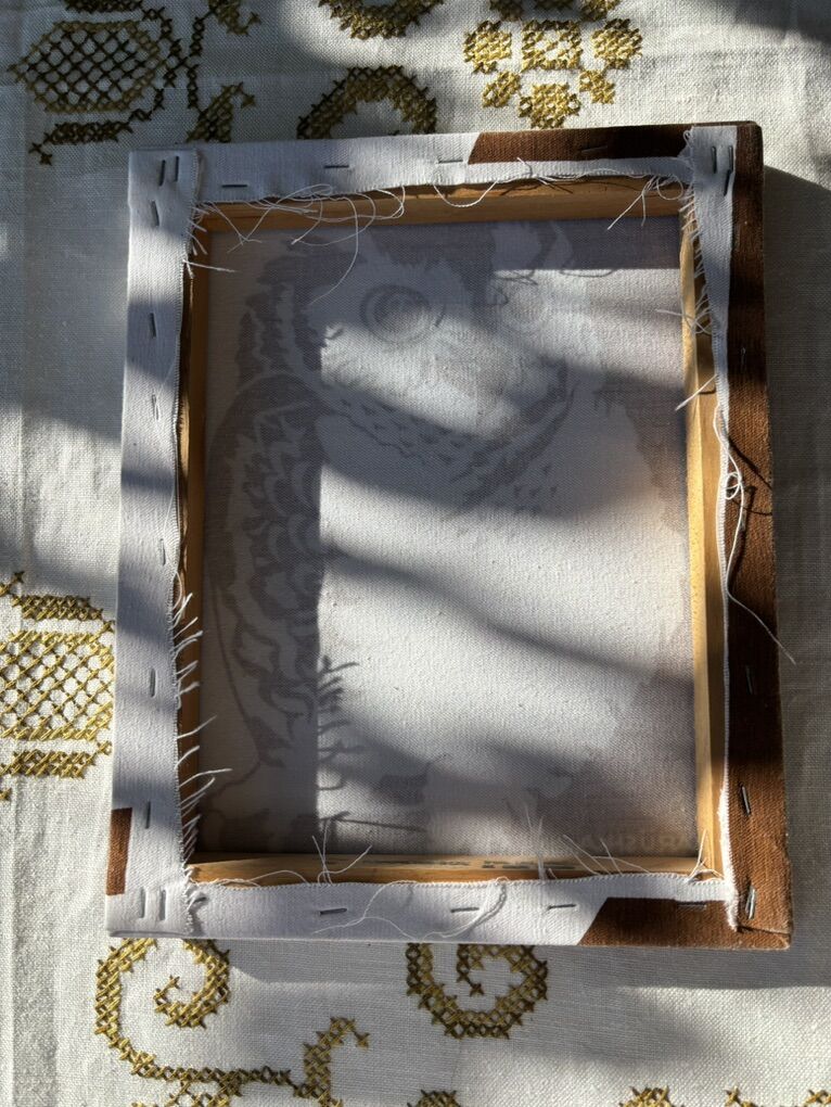 Vintage collectors item, owl textile stretched on wood. Ready to hang. By Marushka. 8” x 10”