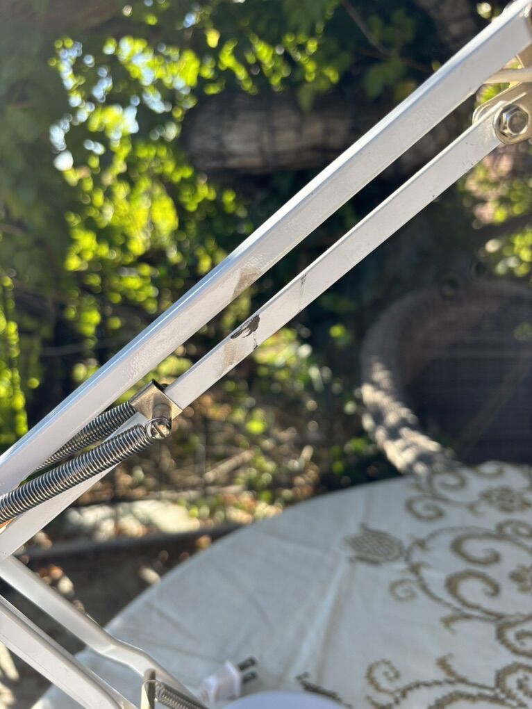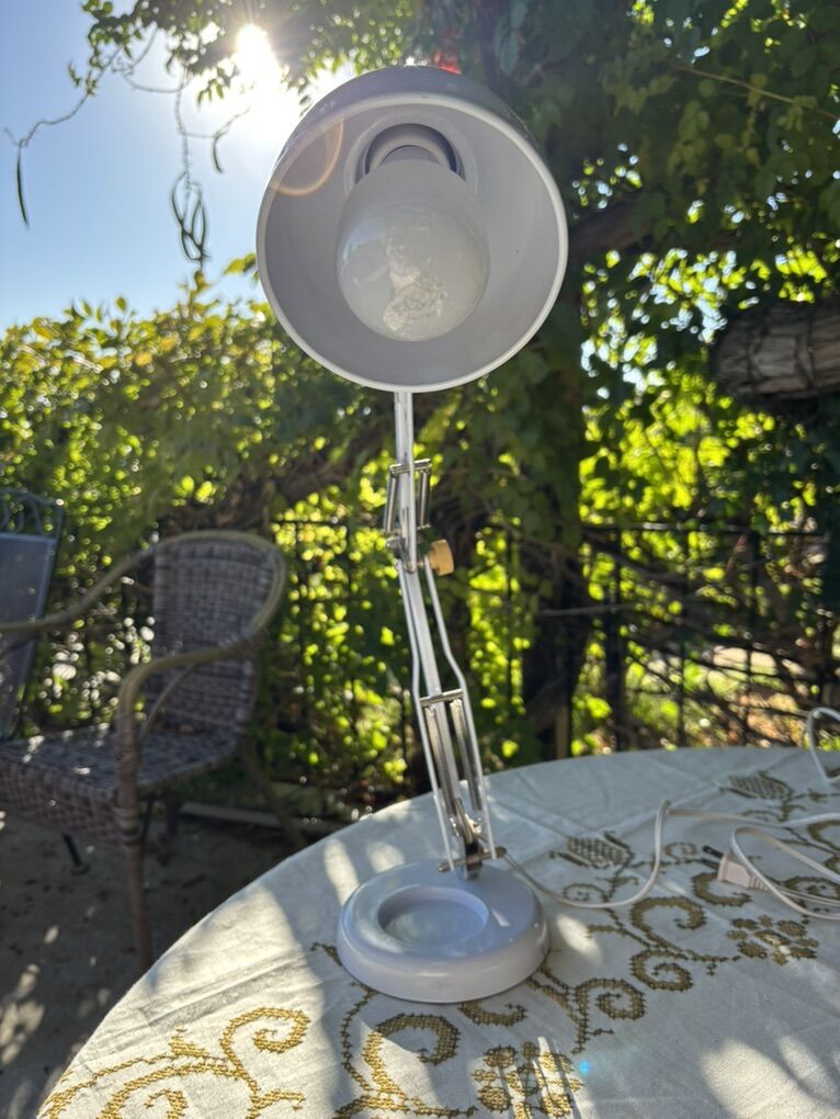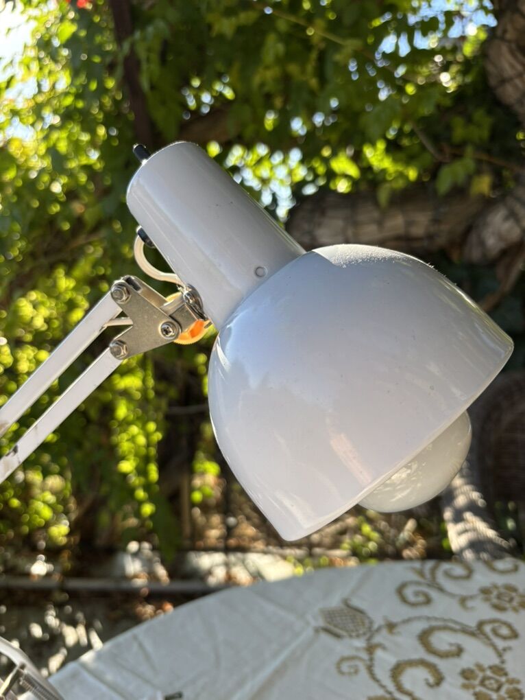 Vintage desk lamp. Articulating mid century white lamp. In good working condition. Can be as high as 22” tall x 15” W